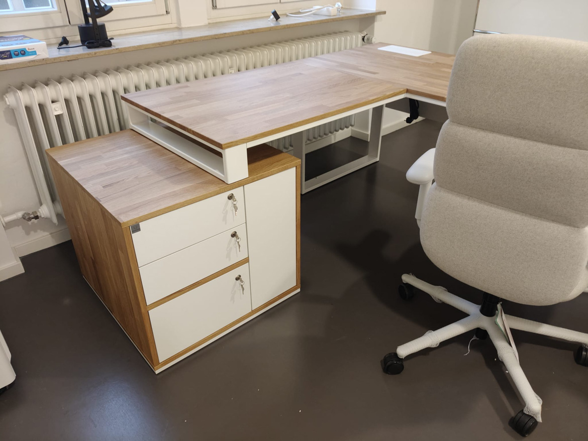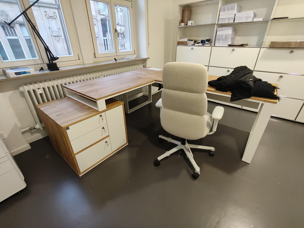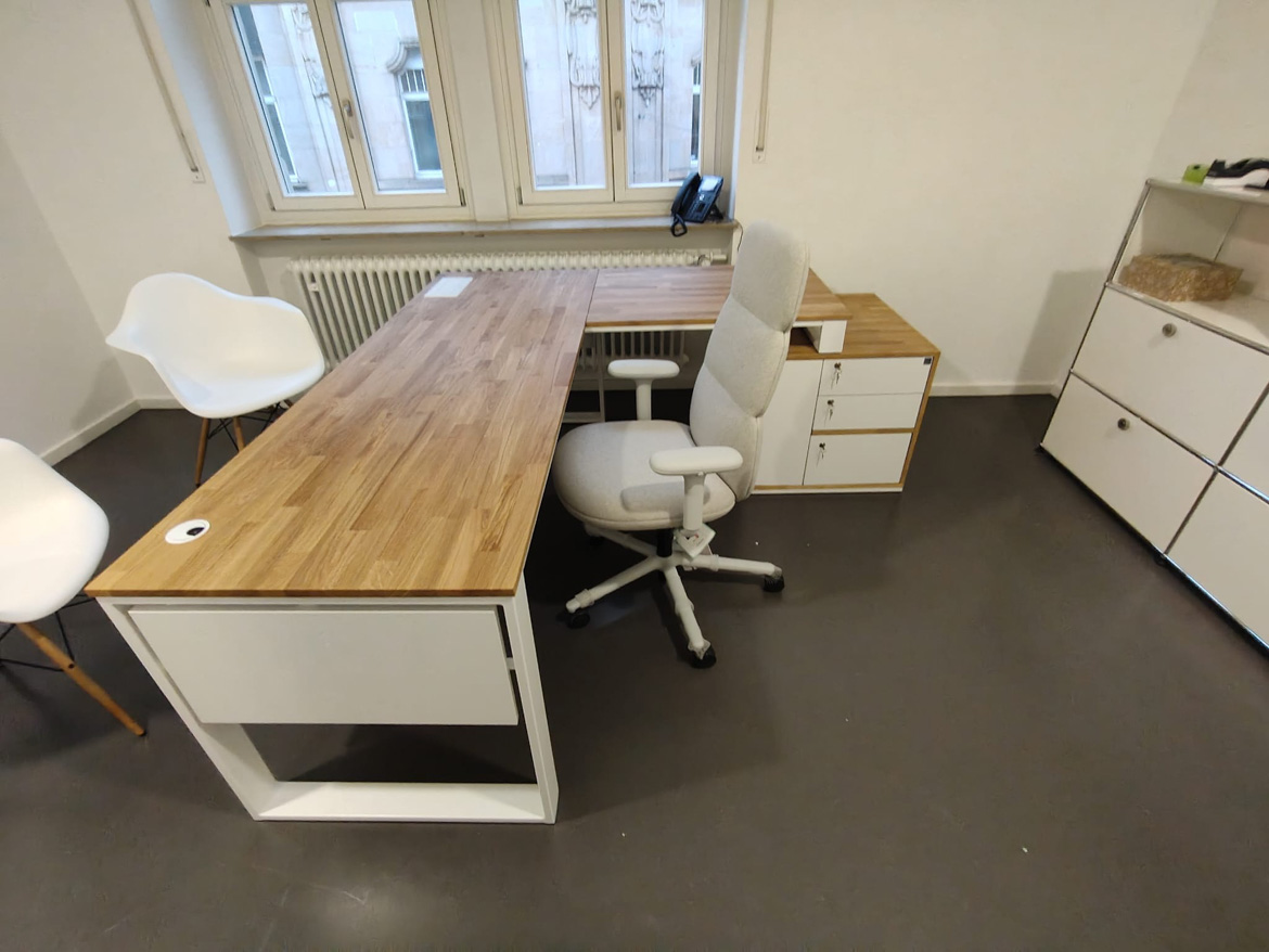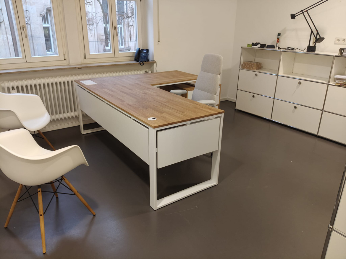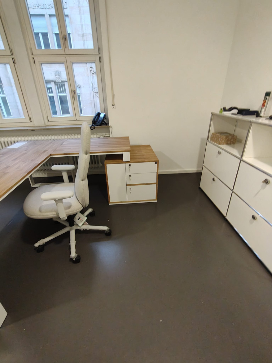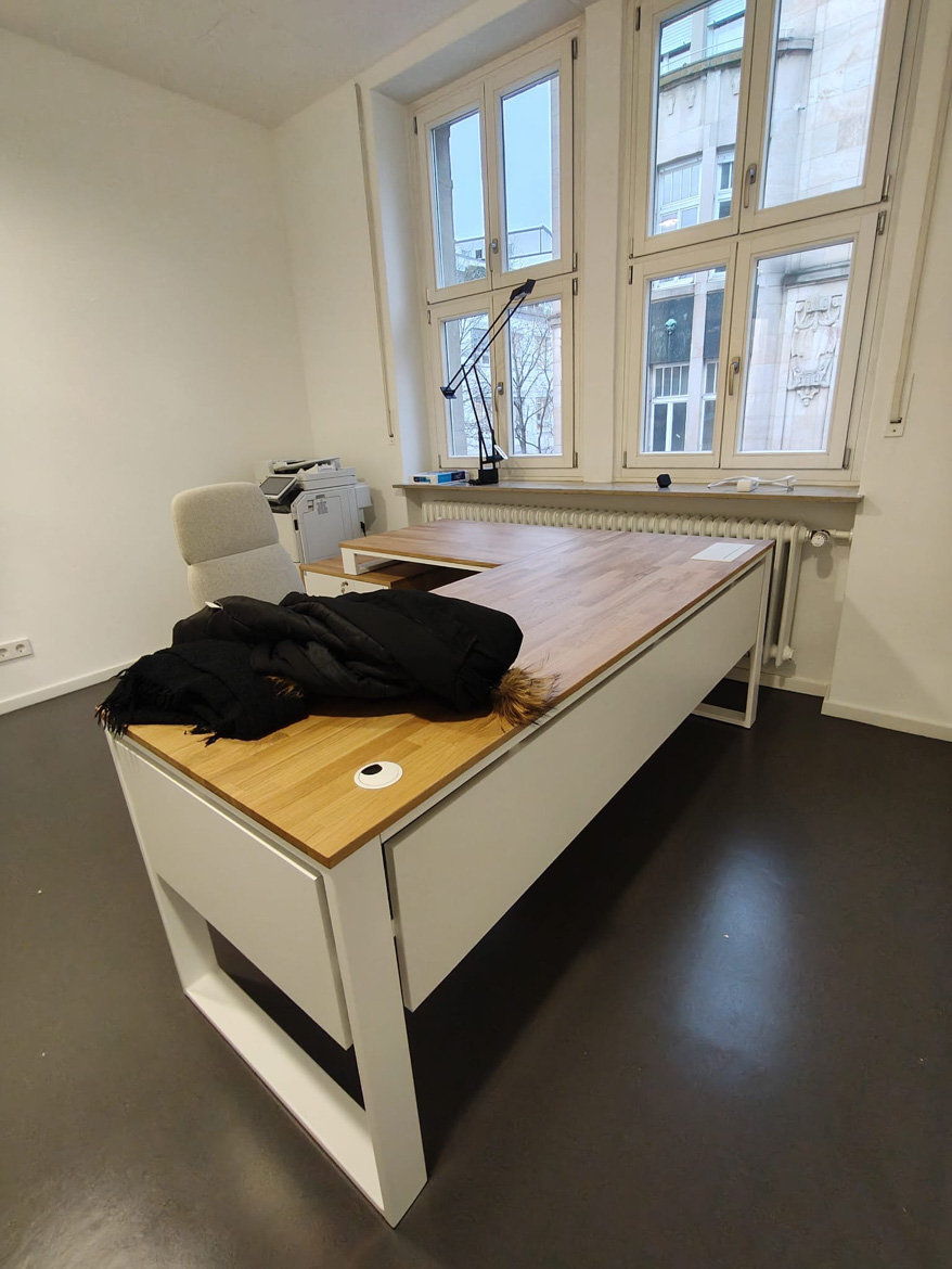 Dla Psychiatrische Gutachtenpraxis Stuttgart zrealizowaliśmy narożne biurko gabinetowe zaprojektowane z myślą o codziennej, spokojnej pracy w przestrzeni medycznej. Forma mebla została dopasowana do układu pomieszczenia, tak aby maksymalnie wykorzystać dostępne miejsce i jednocześnie zachować porządek oraz komfort użytkowania.