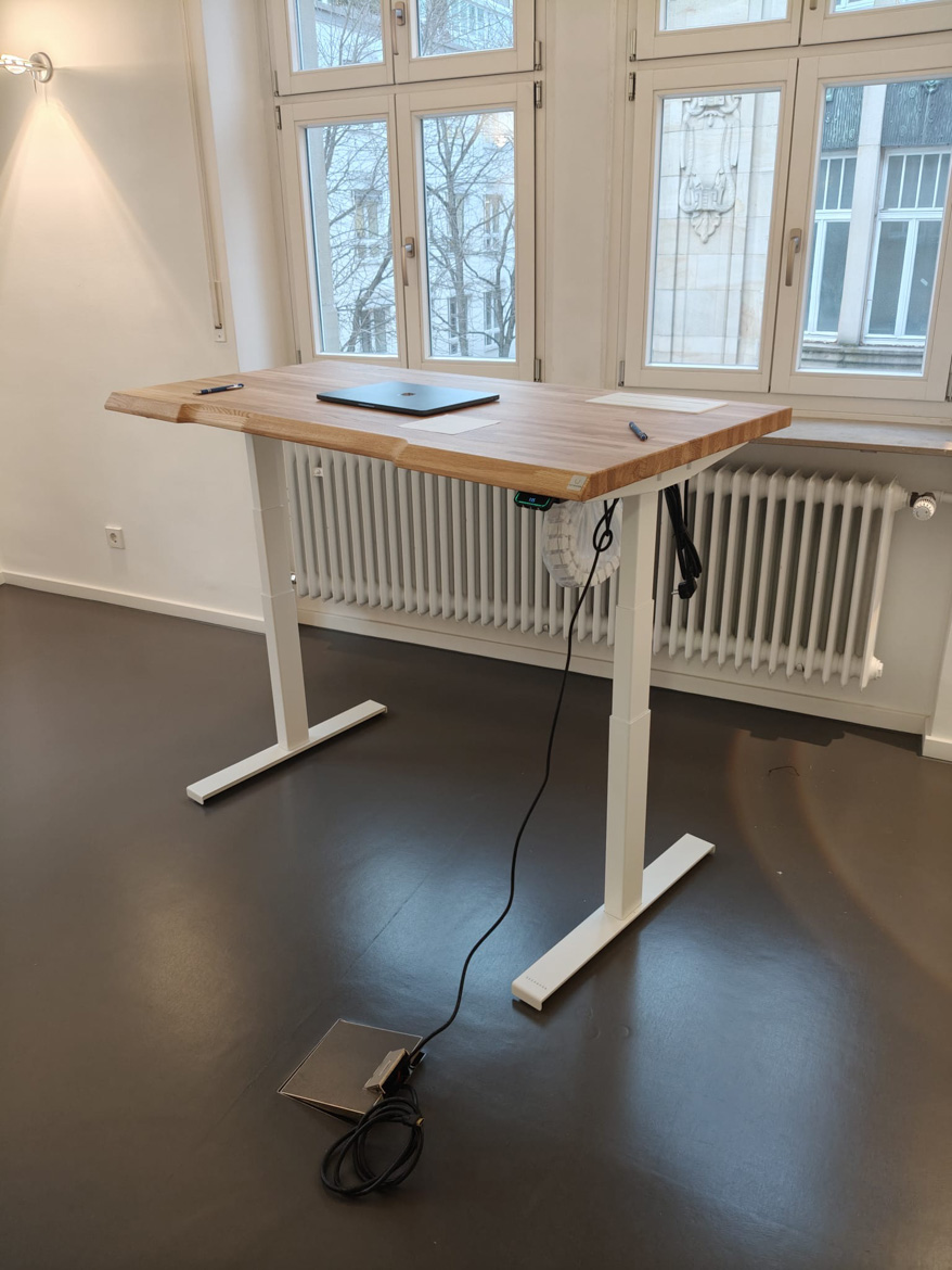 Dla gabinetu lekarskiego w Stuttgarcie wykonaliśmy białe biurko regulowane z naturalnym blatem. Możliwość zmiany wysokości pozwala dopasować stanowisko do codziennego rytmu pracy i zwiększa komfort podczas długich godzin przy biurku.