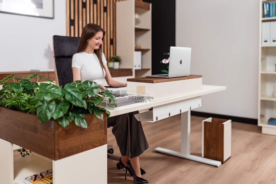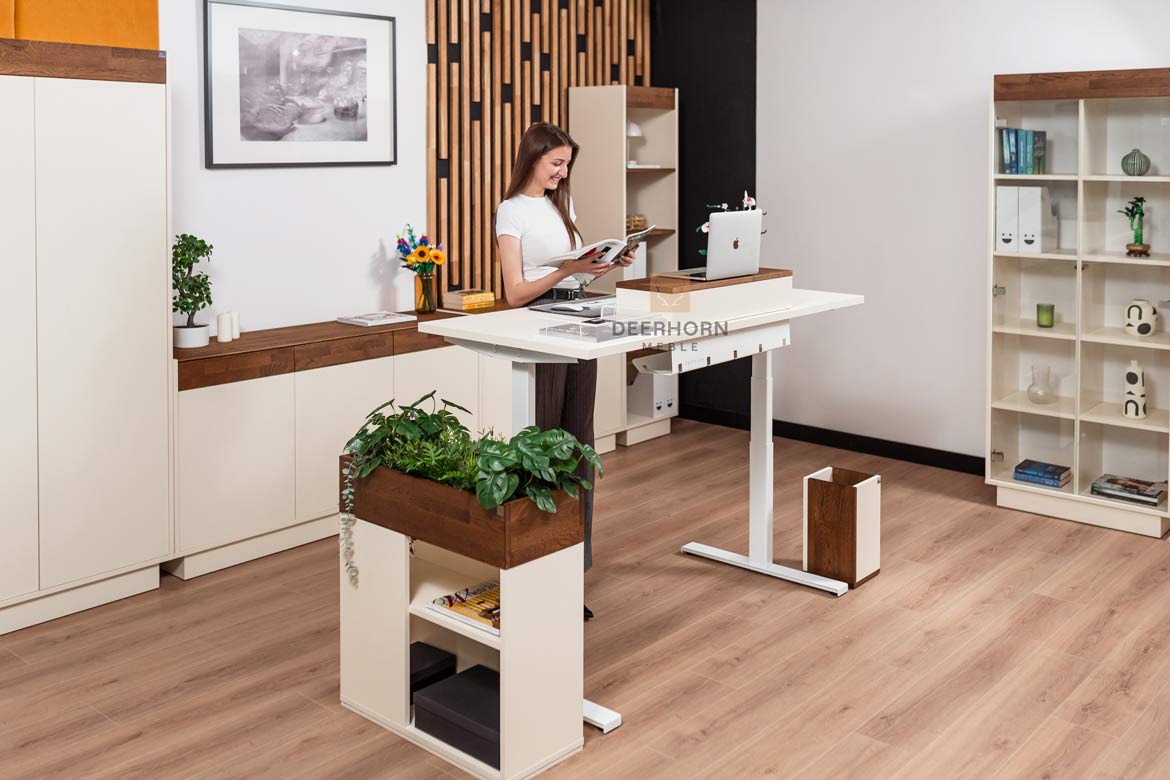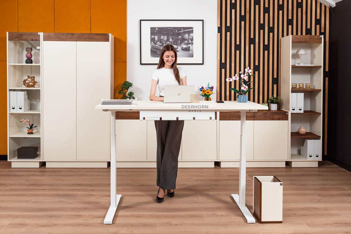 W biurze korzyści są równie istotne. Biurko elektryczne do biura często otoczone jest innymi meblami w konfiguracji open space. Pojemniki na dokumenty, drukarki ustawione na szafkach, kable od ładowarek – każdy z tych elementów może znaleźć się na drodze regulowanego blatu.