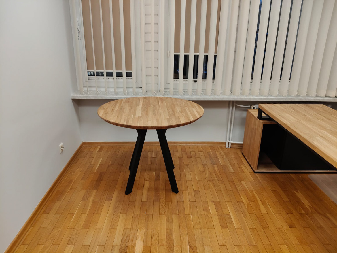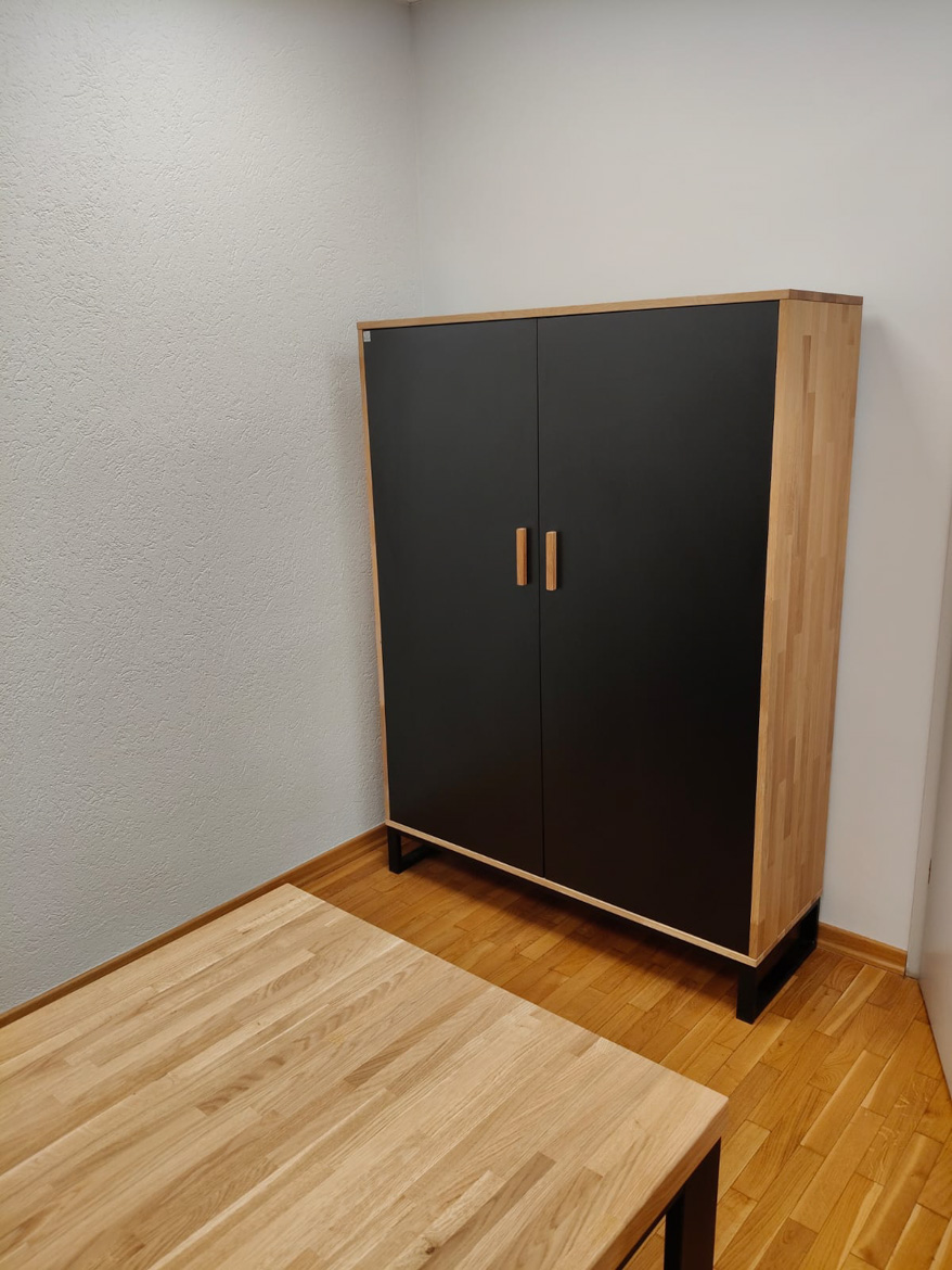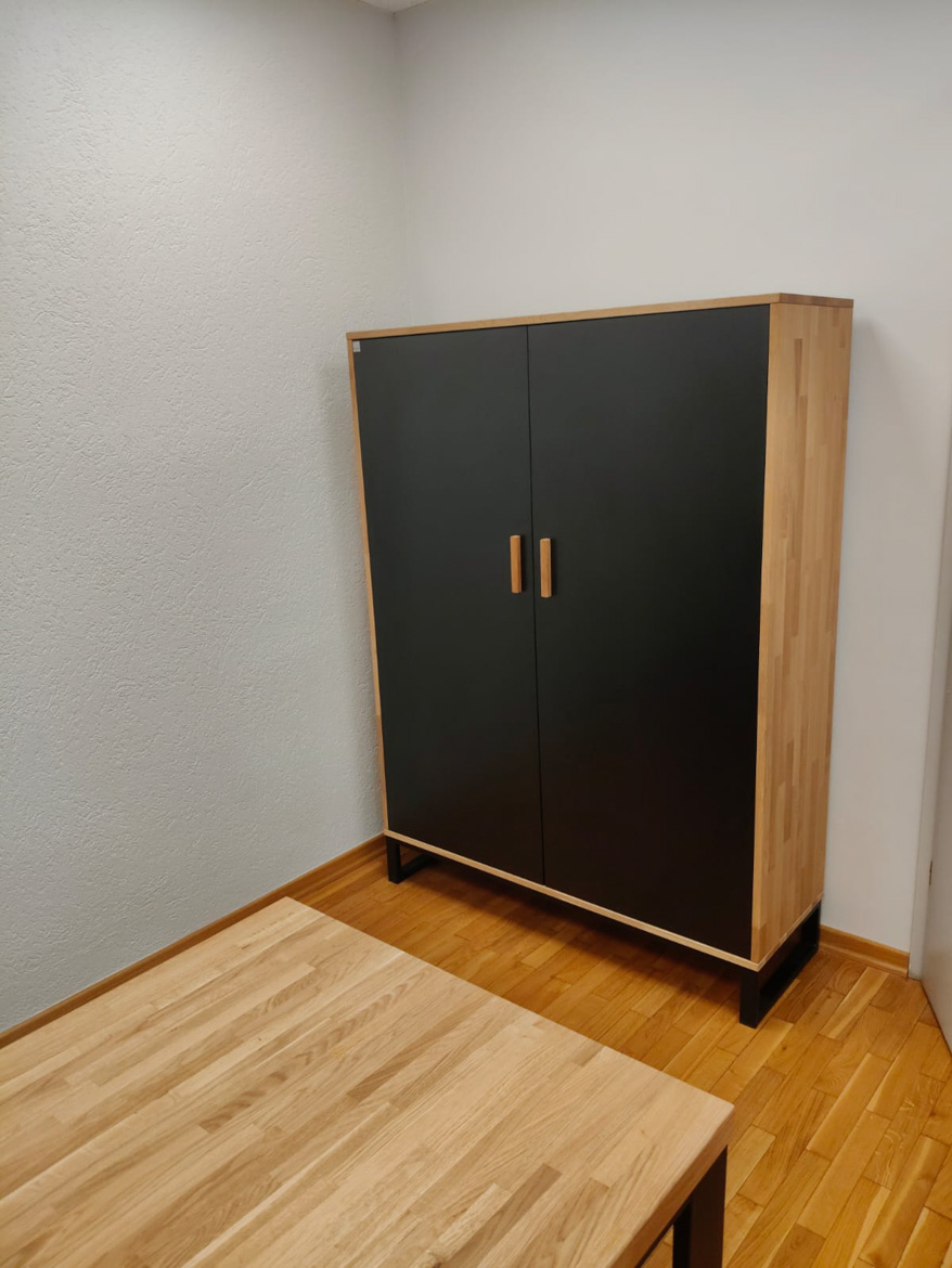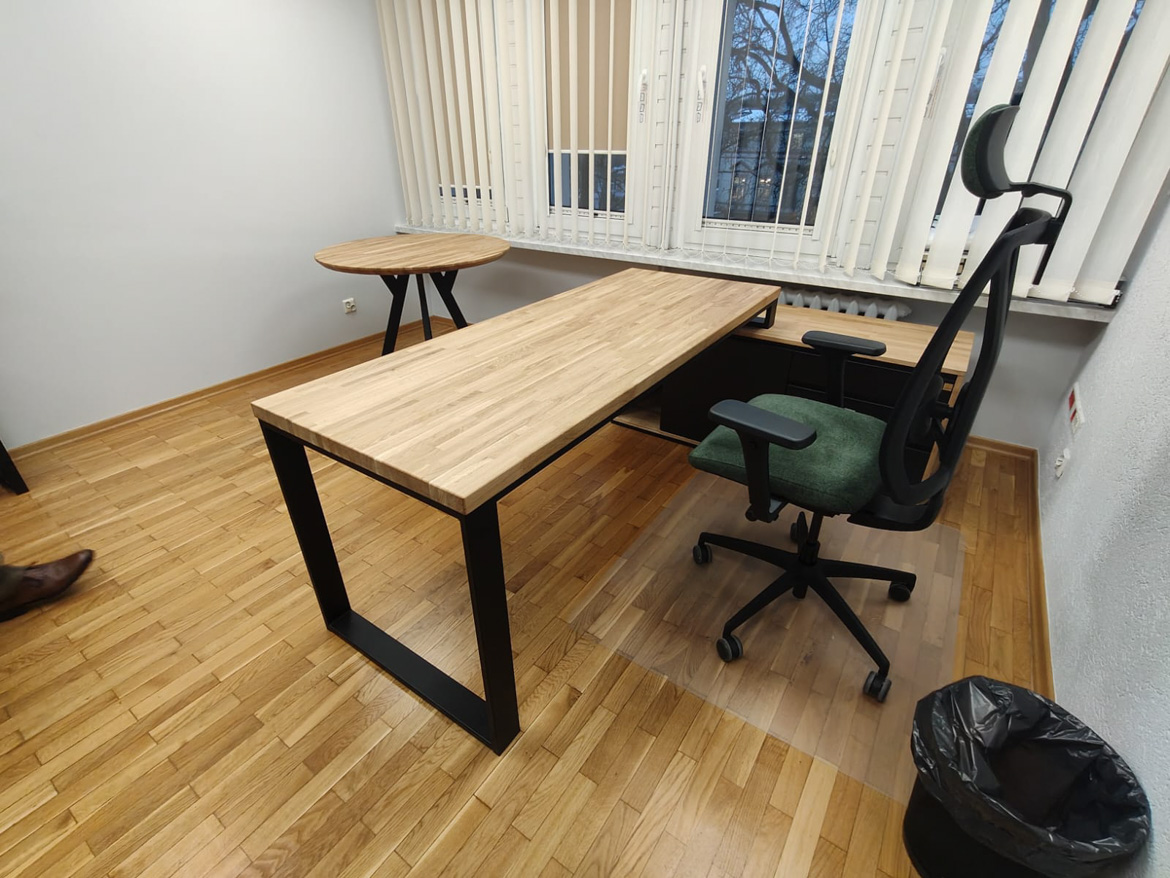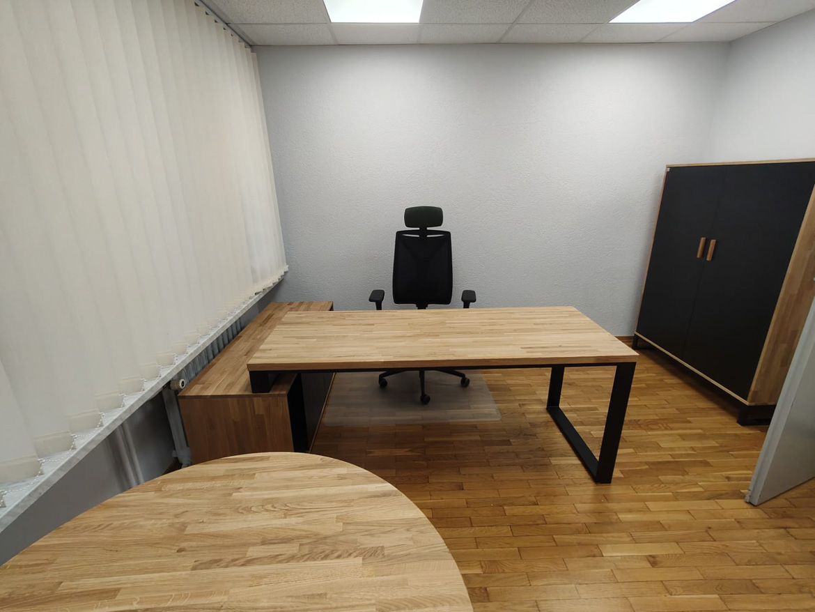 W ramach tej realizacji umeblowaliśmy gabinet, stawiając na funkcjonalność i wygodę codziennej pracy. Centralnym elementem jest biurko narożne z powiększonym kontenerem, które zapewnia dużą przestrzeń roboczą i miejsce do przechowywania, uzupełnione o pojemną szafę na dokumenty i okrągły stół. Całość jest prosta, spójna i dobrze dopasowana do charakteru instytucji.