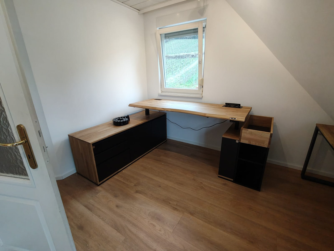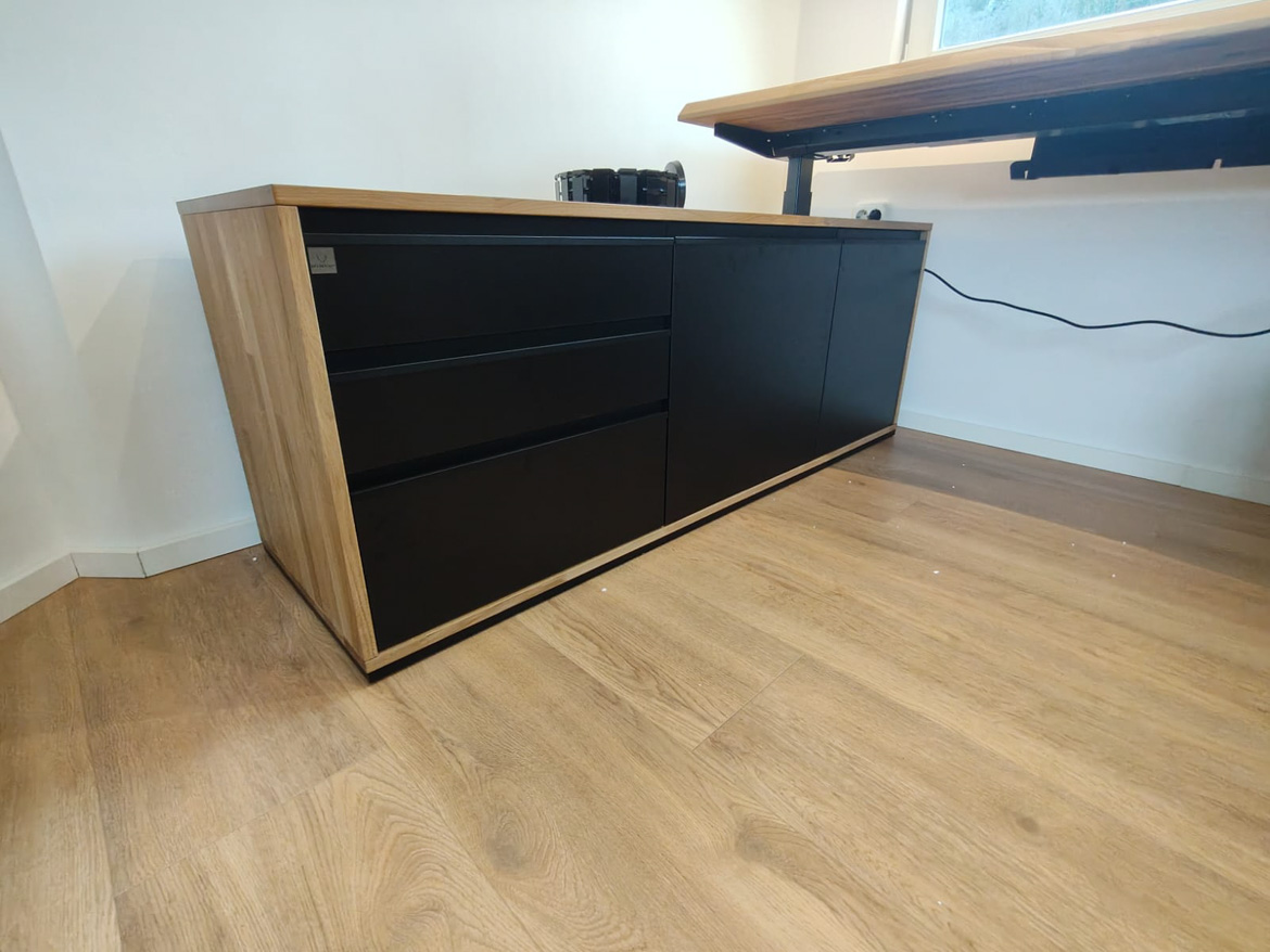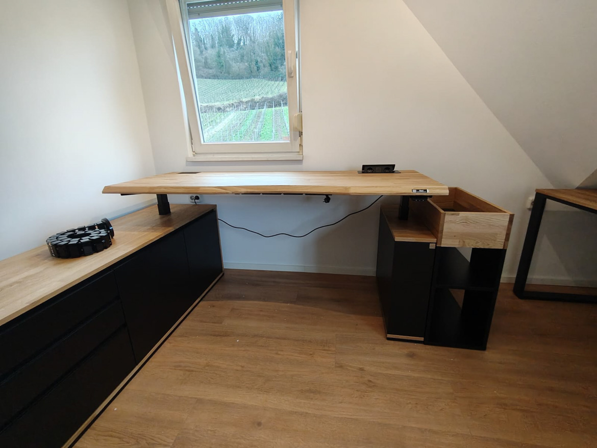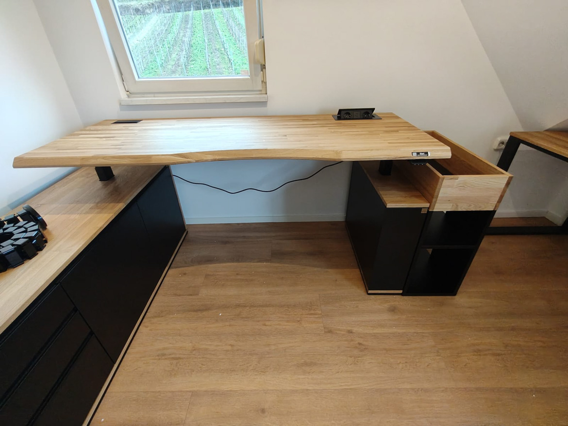 Dla Vermögensberatung Phillip Böckel w Bensheim wykonaliśmy duże biurko regulowane z powiększonym kontenerem oraz kwietnikiem na rośliny. Regulacja wysokości pozwala dopasować stanowisko do codziennego trybu pracy, a dodatkowa przestrzeń do przechowywania ułatwia organizację dokumentów.