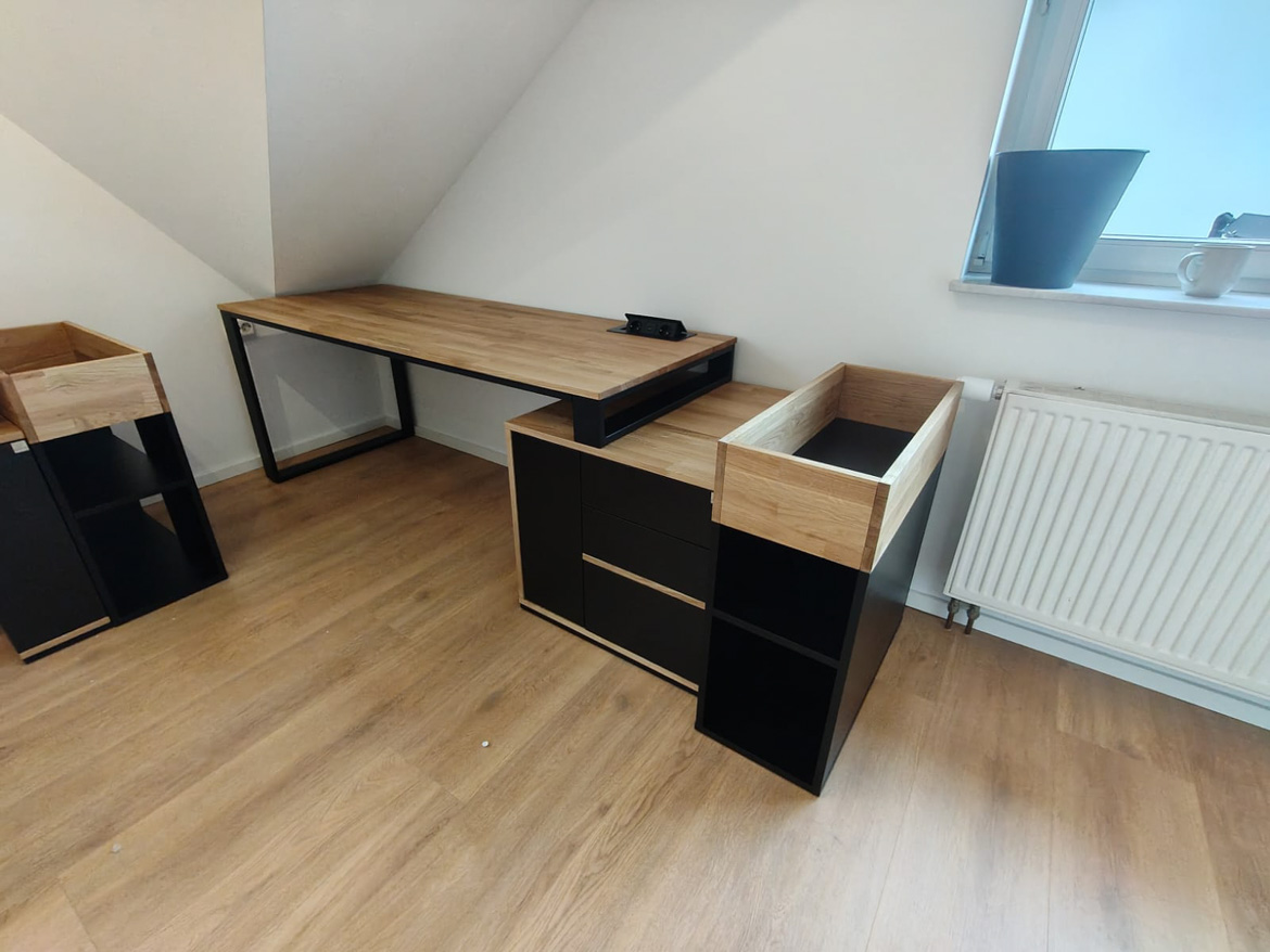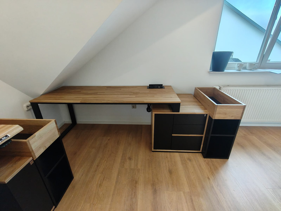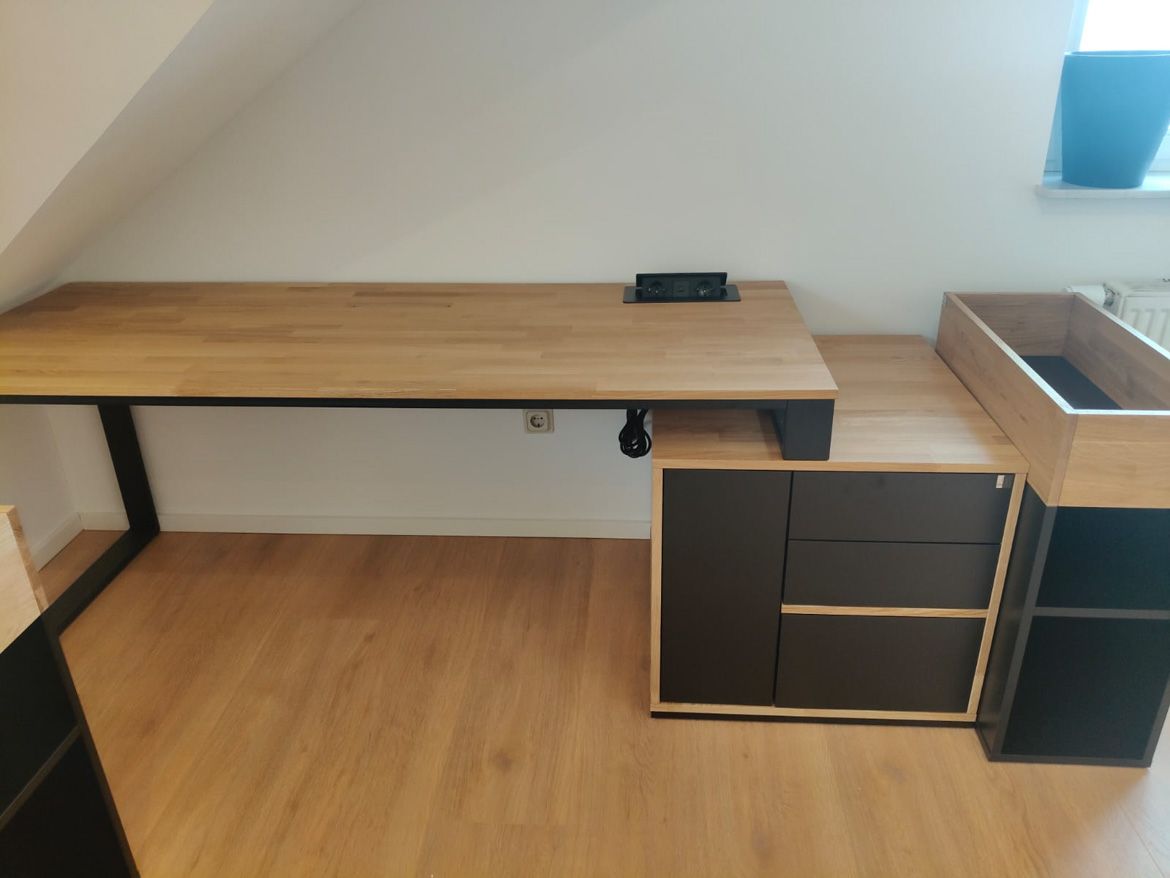 Dla biura Vermögensberatung w Bensheim w Niemczech wykonaliśmy proste i funkcjonalne stanowisko pracy składające się z biurka, kontenerka z szufladami oraz kwietnika. Taki układ pozwala wygodnie zorganizować przestrzeń roboczą i mieć najważniejsze dokumenty oraz akcesoria zawsze pod ręką.