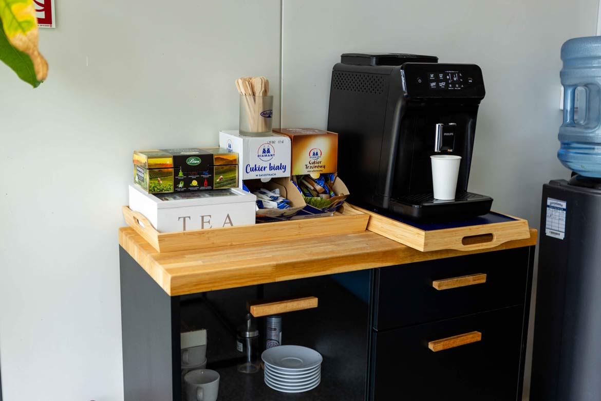 Zespół AutoAuto.pl potrzebował biura, które pomieści wiele stanowisk, a jednocześnie pozwoli na swobodną współpracę. Długie stoły robocze w naturalnym drewnie i czerni tworzą wygodne miejsce pracy dla całego działu sprzedaży. Wydzielona strefa z sofami i stolikiem kawowym sprzyja rozmowom z klientami i chwilom odpoczynku w trakcie intensywnego dnia.