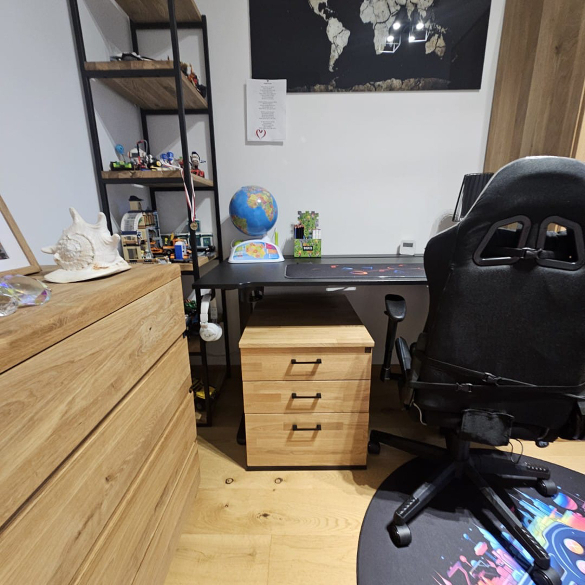 Dla Pani Emilii przygotowaliśmy solidny, dębowy kontenerek biurowy, który ma nie tylko ułatwiać przechowywanie, ale też dobrze wyglądać w domowym gabinecie. Trzy pojemne szuflady pozwalają uporządkować wszystkie najważniejsze rzeczy, a naturalne drewno ociepla wnętrze i świetnie komponuje się z resztą mebli. Prosty, funkcjonalny i trwały – dokładnie taki, jakiego potrzebowała nasza klientka.