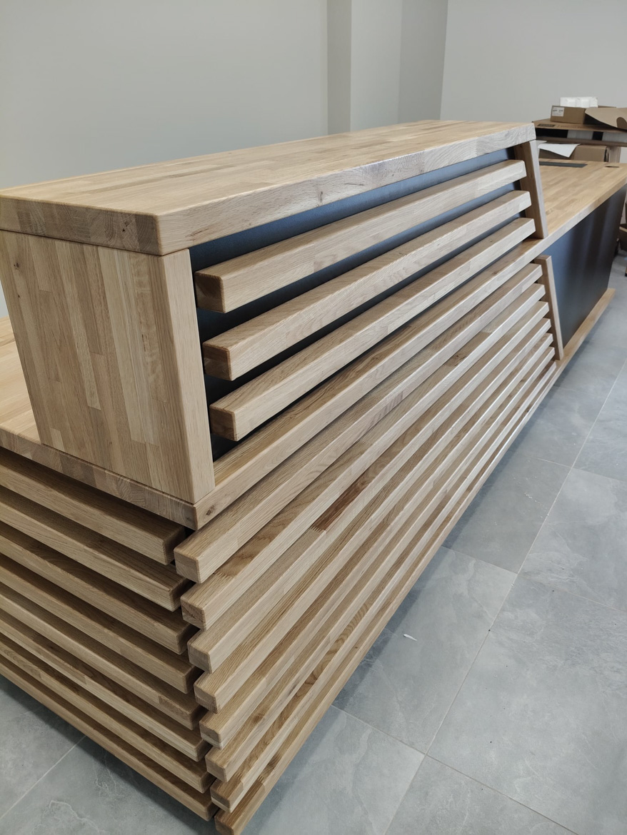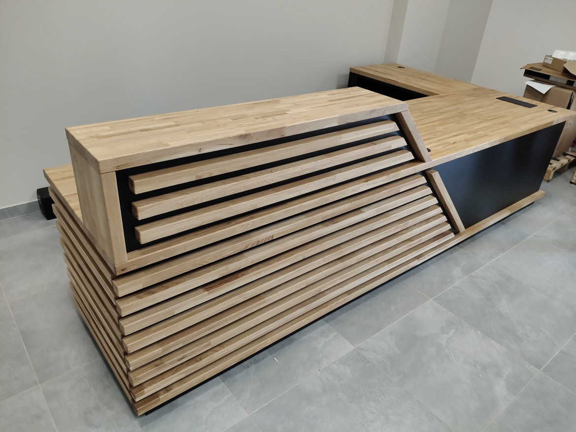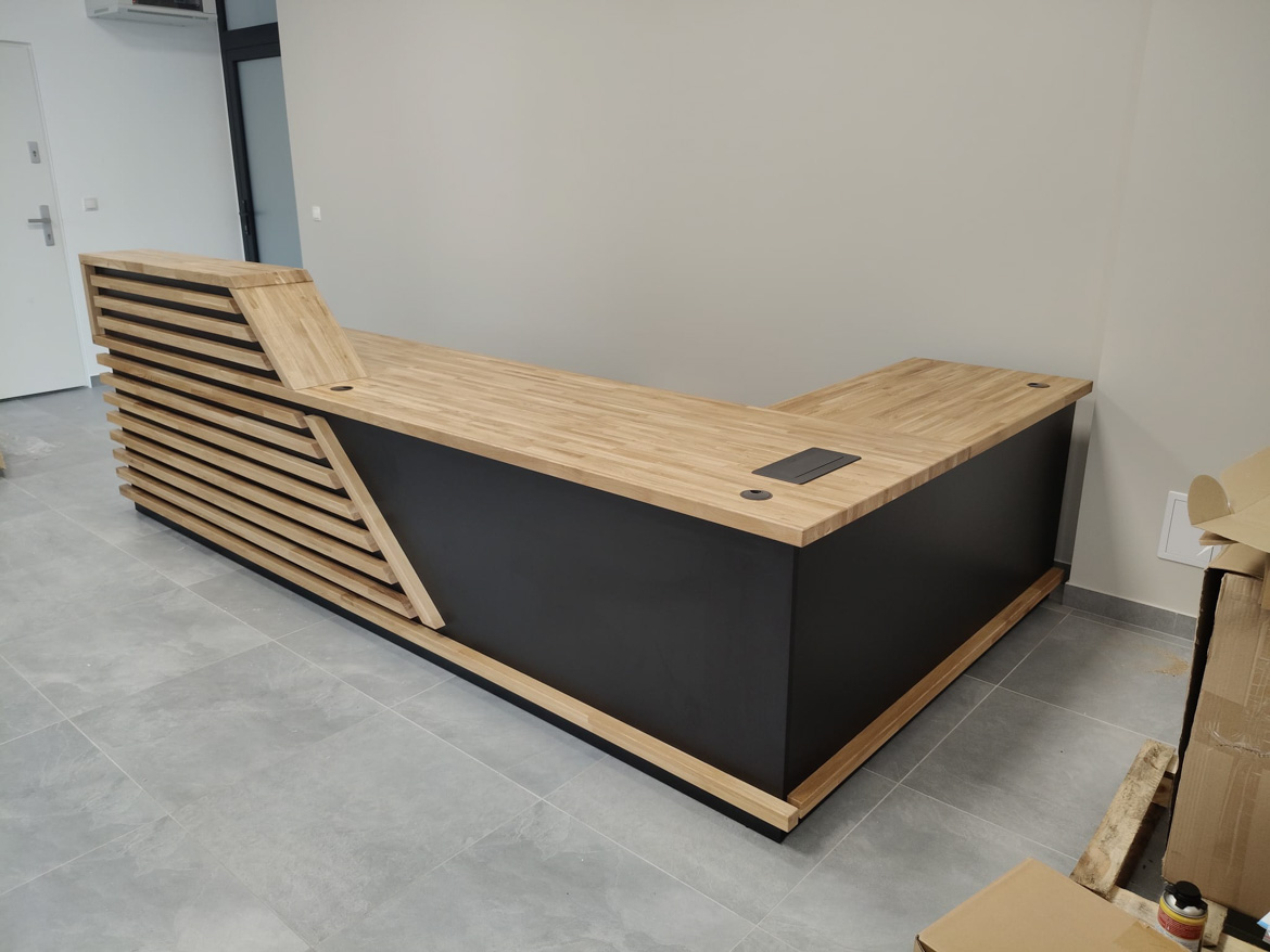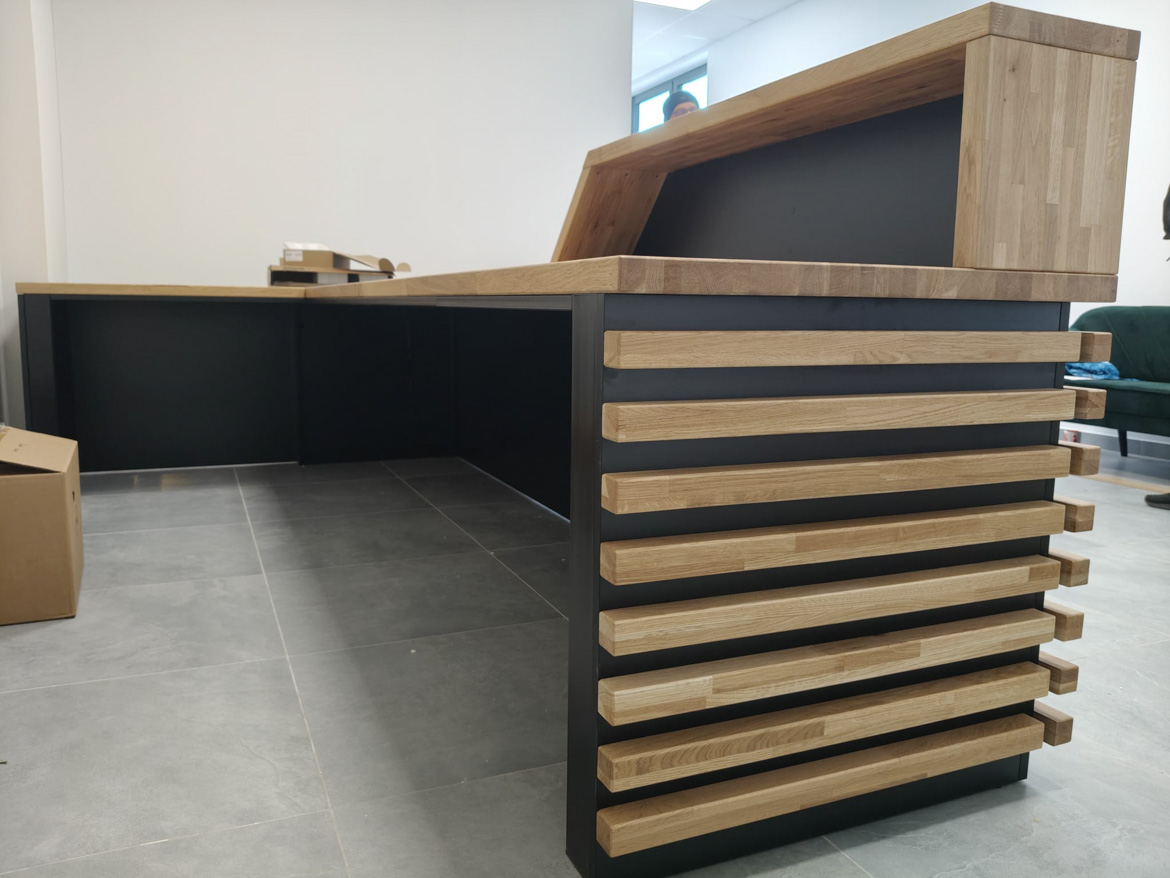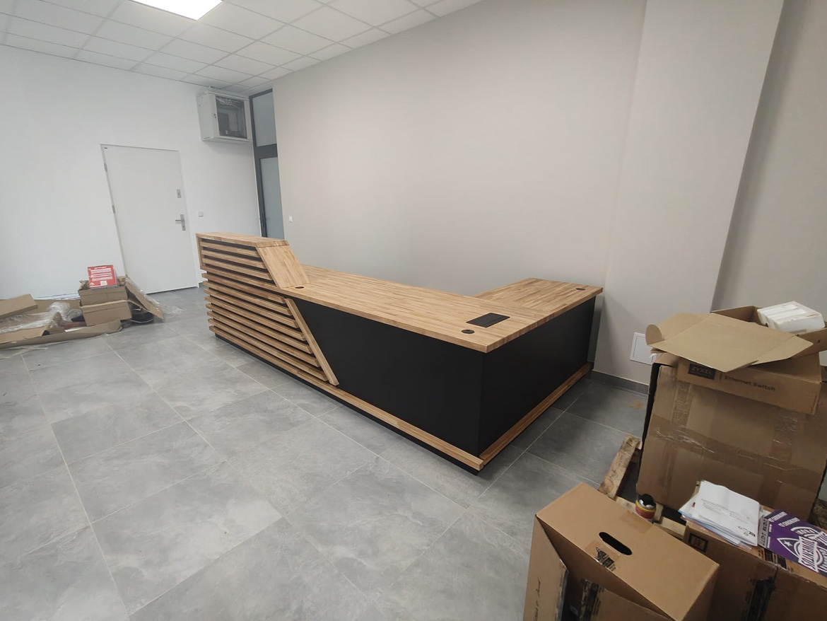 Dla kancelarii notarialnej Pana Dawida przygotowaliśmy dużą, efektowną ladę recepcyjną – masywną, nowoczesną i od razu przyciągającą wzrok. Front wykonany z poziomych drewnianych listew nadaje całości charakteru premium, a czarne wstawki podkreślają elegancki, formalny styl miejsca.
