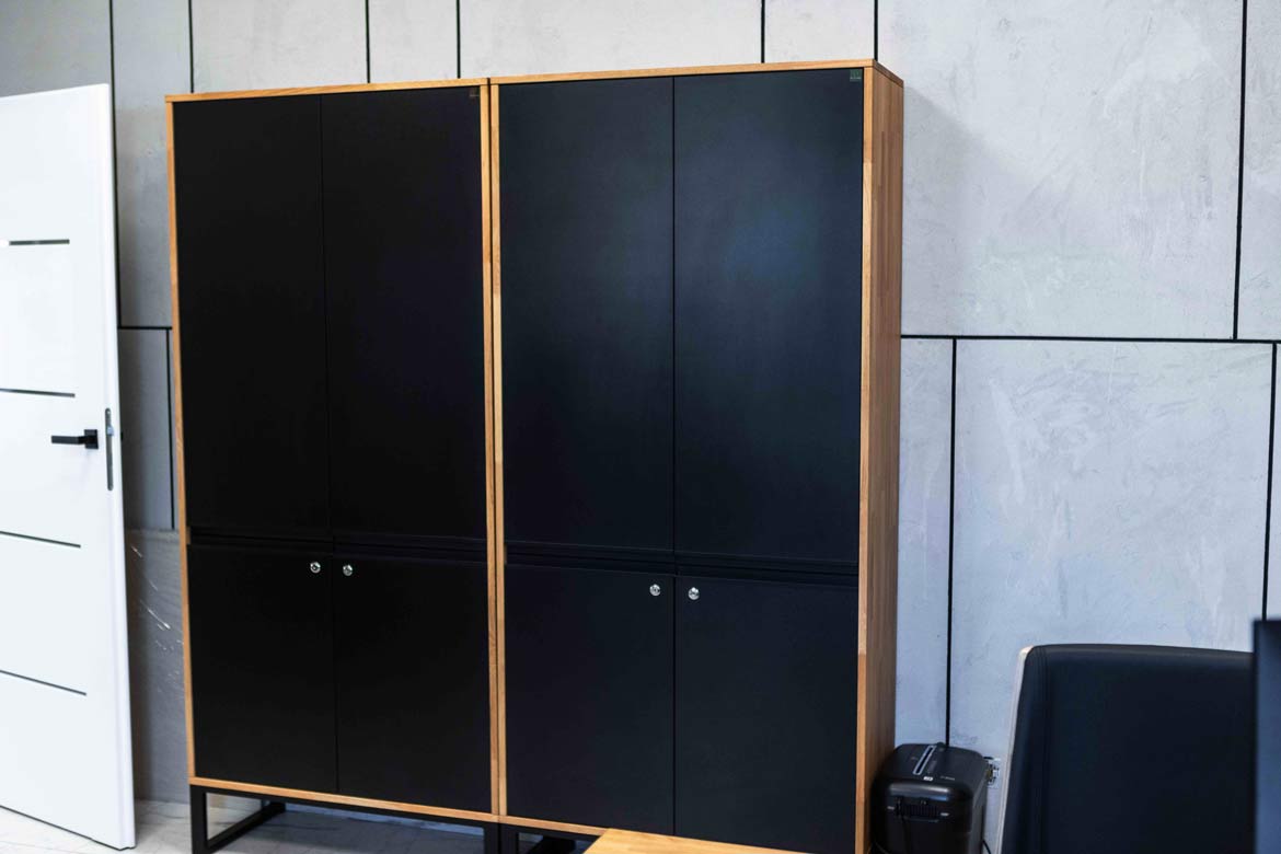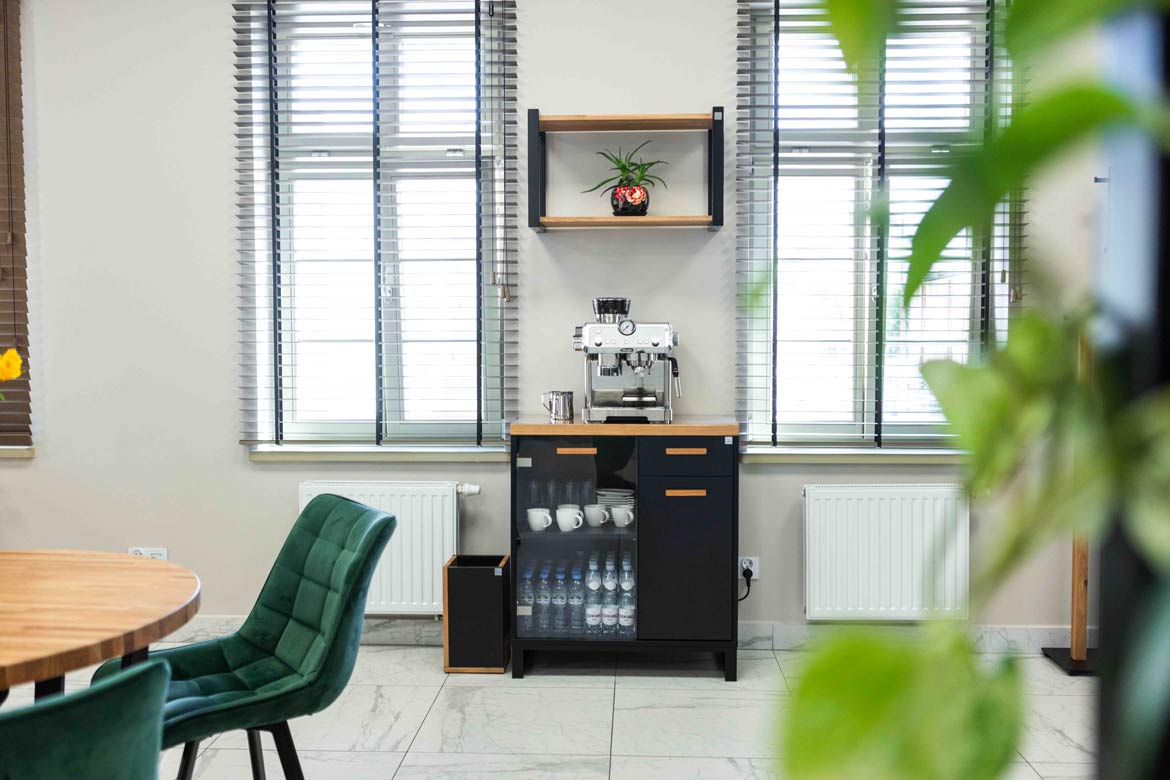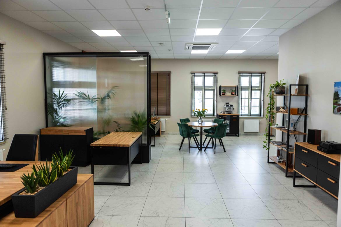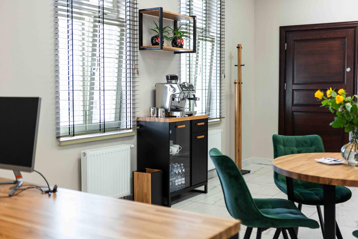 Dla ich biura przygotowaliśmy kompleksowe wyposażenie: od biurek pracowniczych, biurko prezesa, przez duży stół okrągły, aż po eleganckie szafy, komody i zabudowę pod ekspres do kawy.