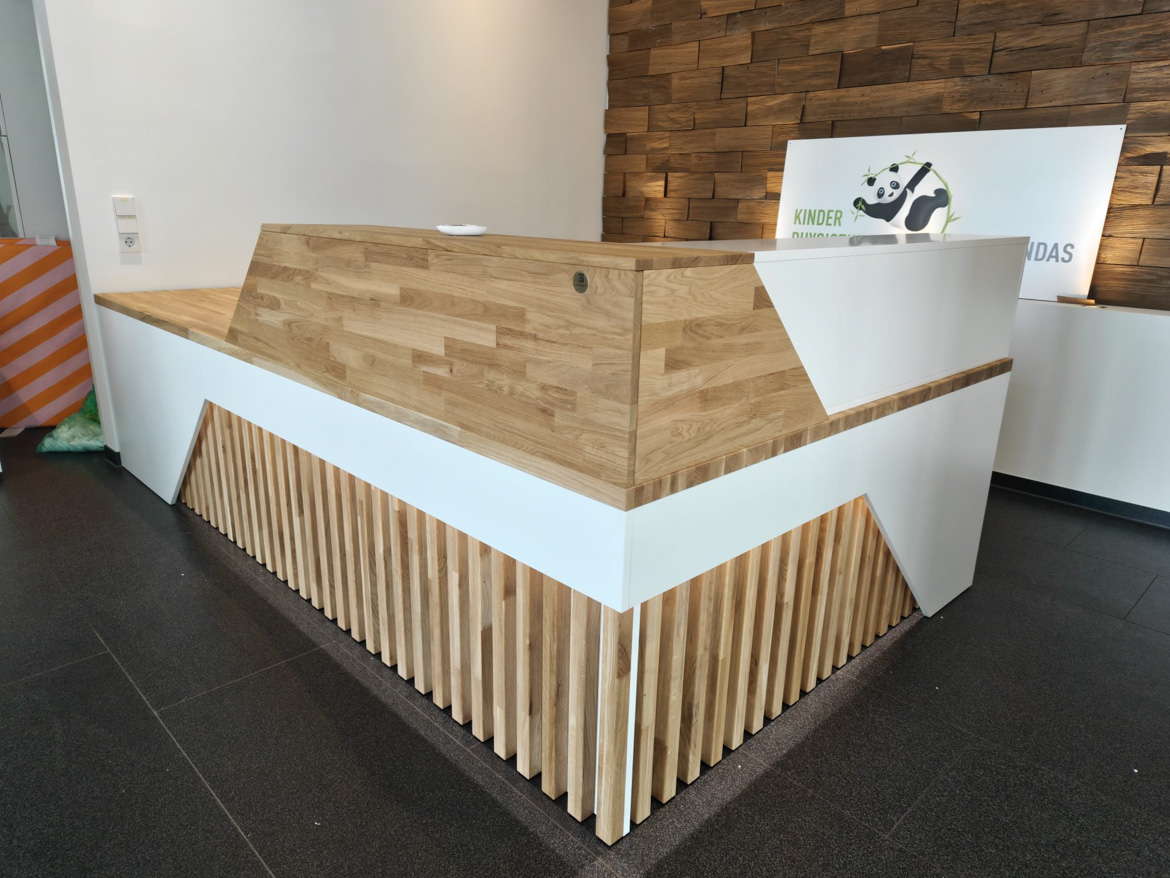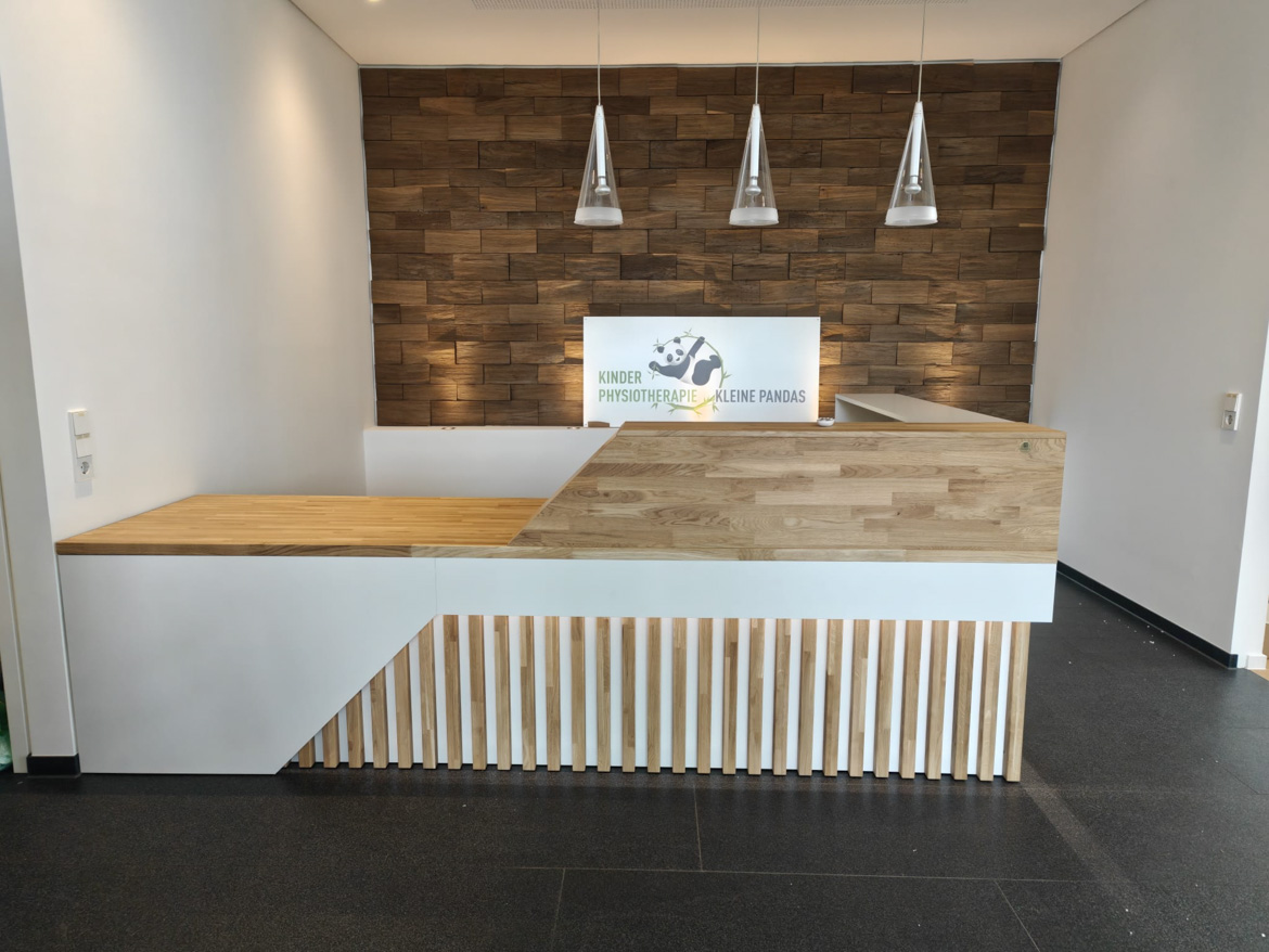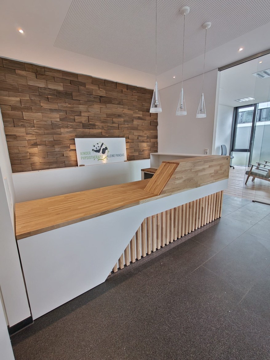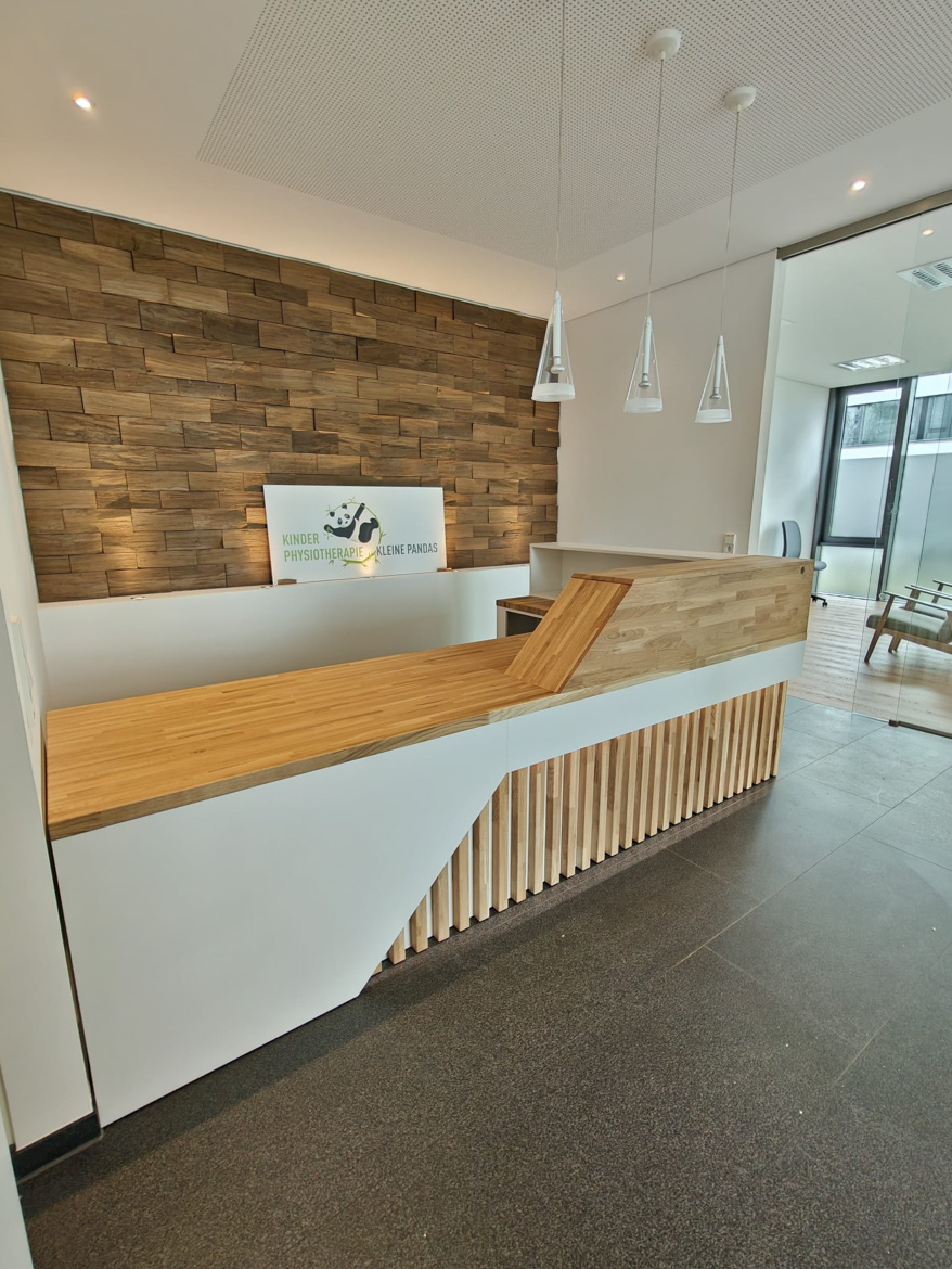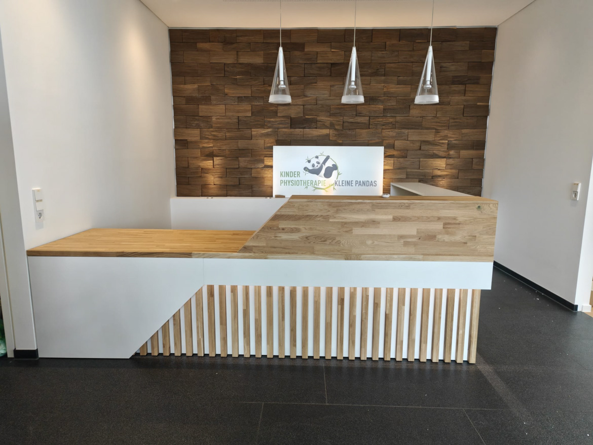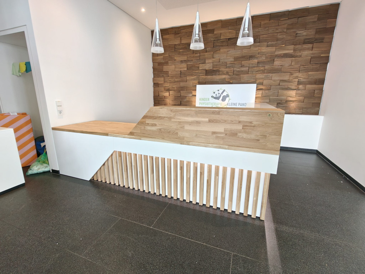 Dla gabinetu Kinderphysiotherapie Kleine Pandas w Ulm wykonaliśmy ladę recepcyjną, która miała być jednocześnie praktyczna i po prostu dobrze wyglądać w tej przestrzeni. To miejsce pierwszego kontaktu z pacjentem, dlatego ważne było, żeby było przyjazne i spójne z wnętrzem.