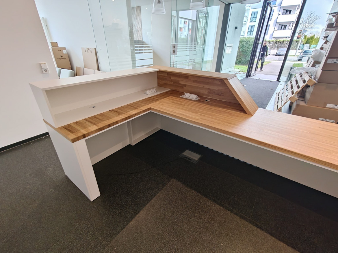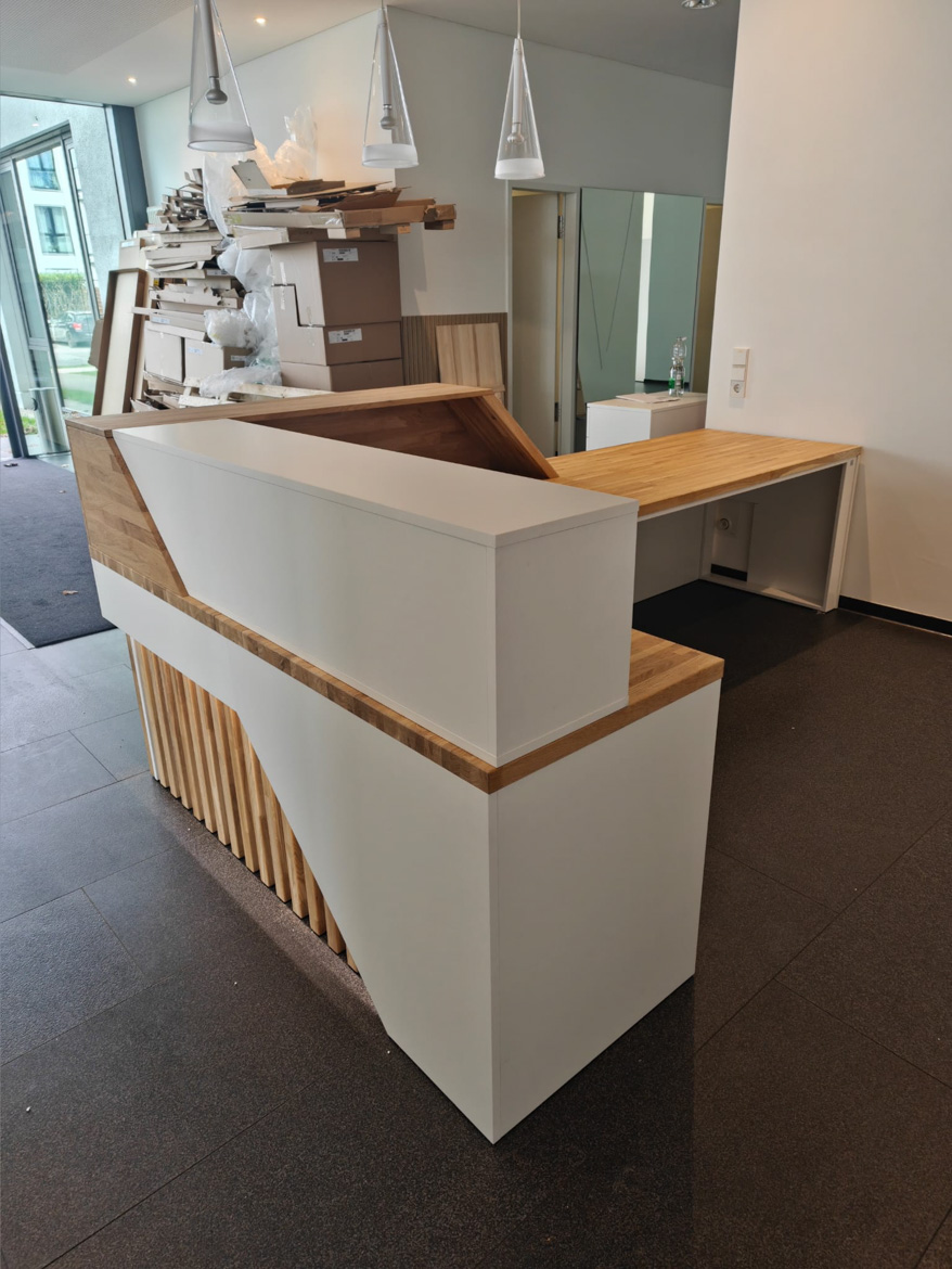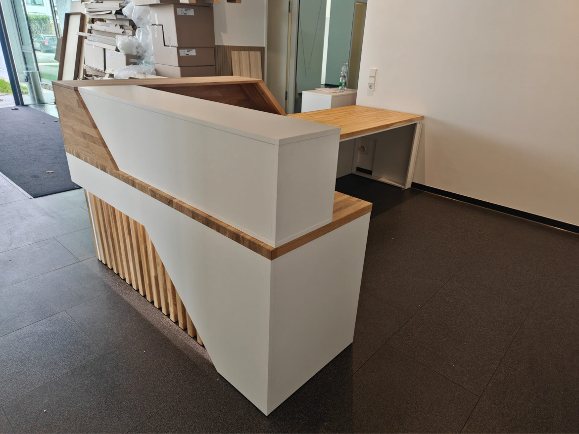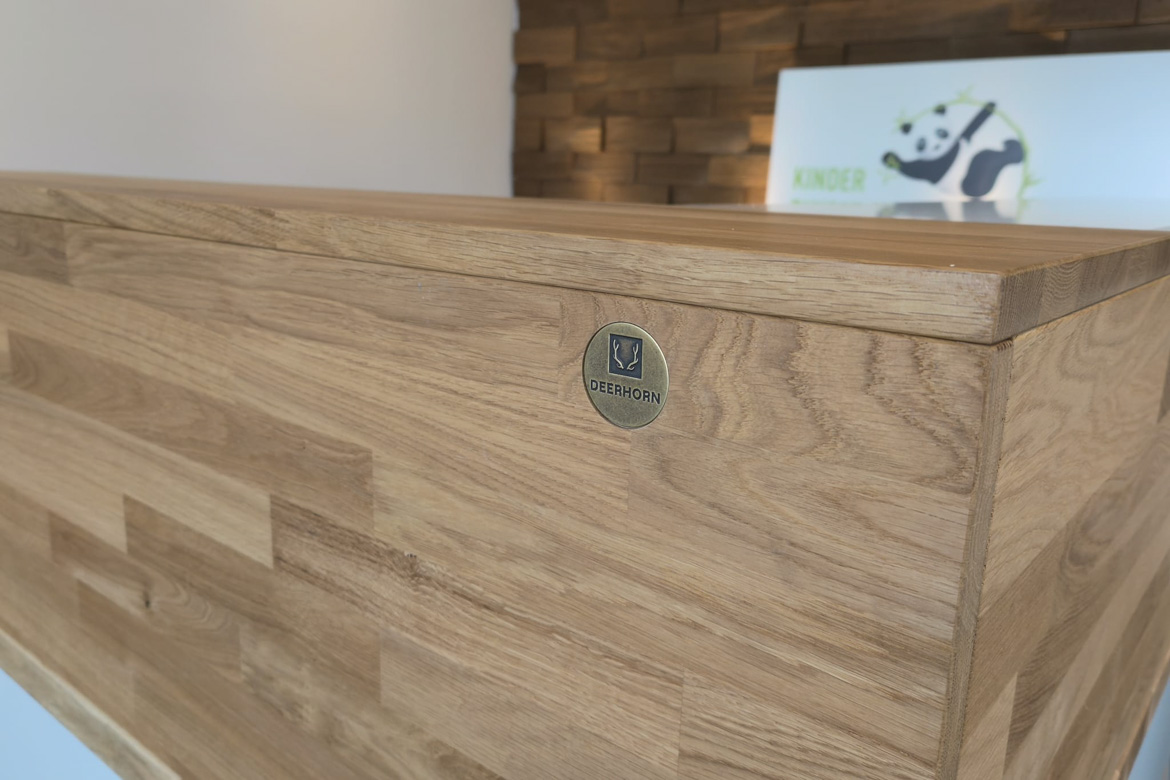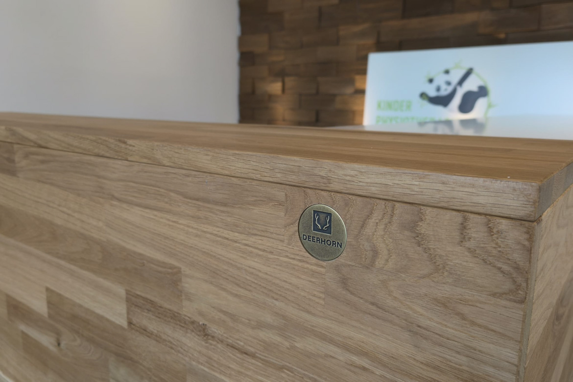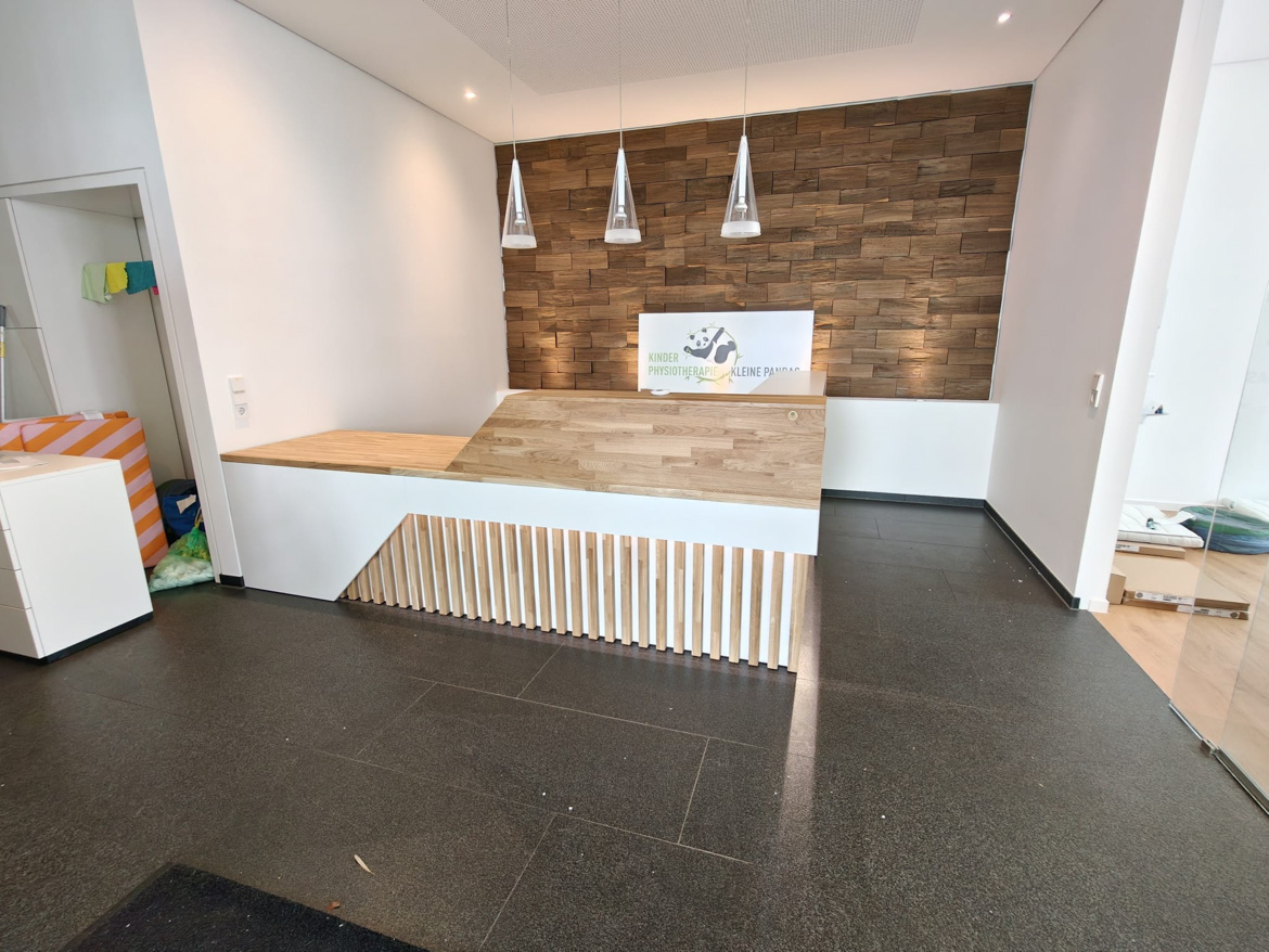 Dla gabinetu Kinderphysiotherapie Kleine Pandas w Ulm wykonaliśmy ladę recepcyjną, która miała być jednocześnie praktyczna i po prostu dobrze wyglądać w tej przestrzeni. To miejsce pierwszego kontaktu z pacjentem, dlatego ważne było, żeby było przyjazne i spójne z wnętrzem.