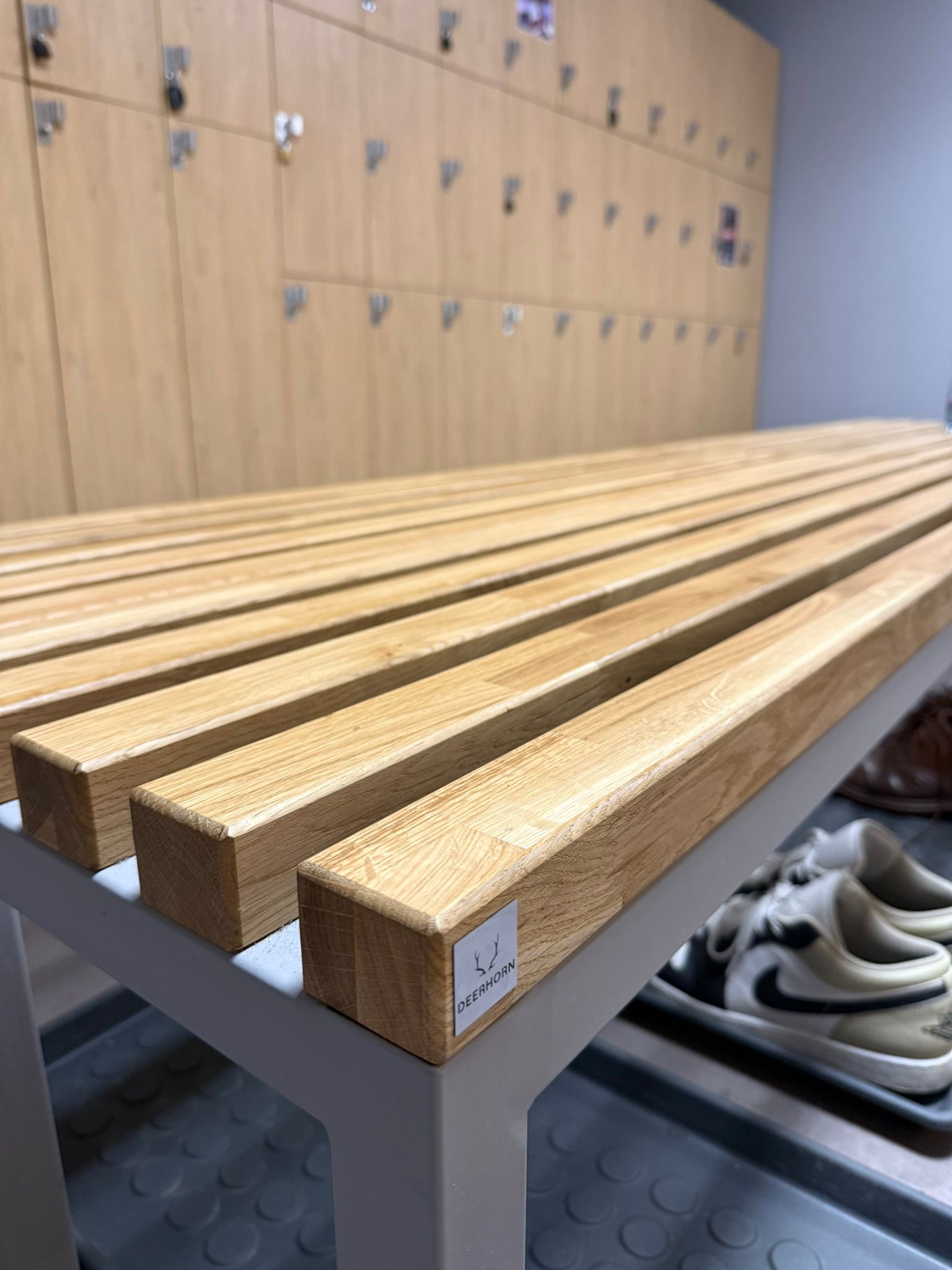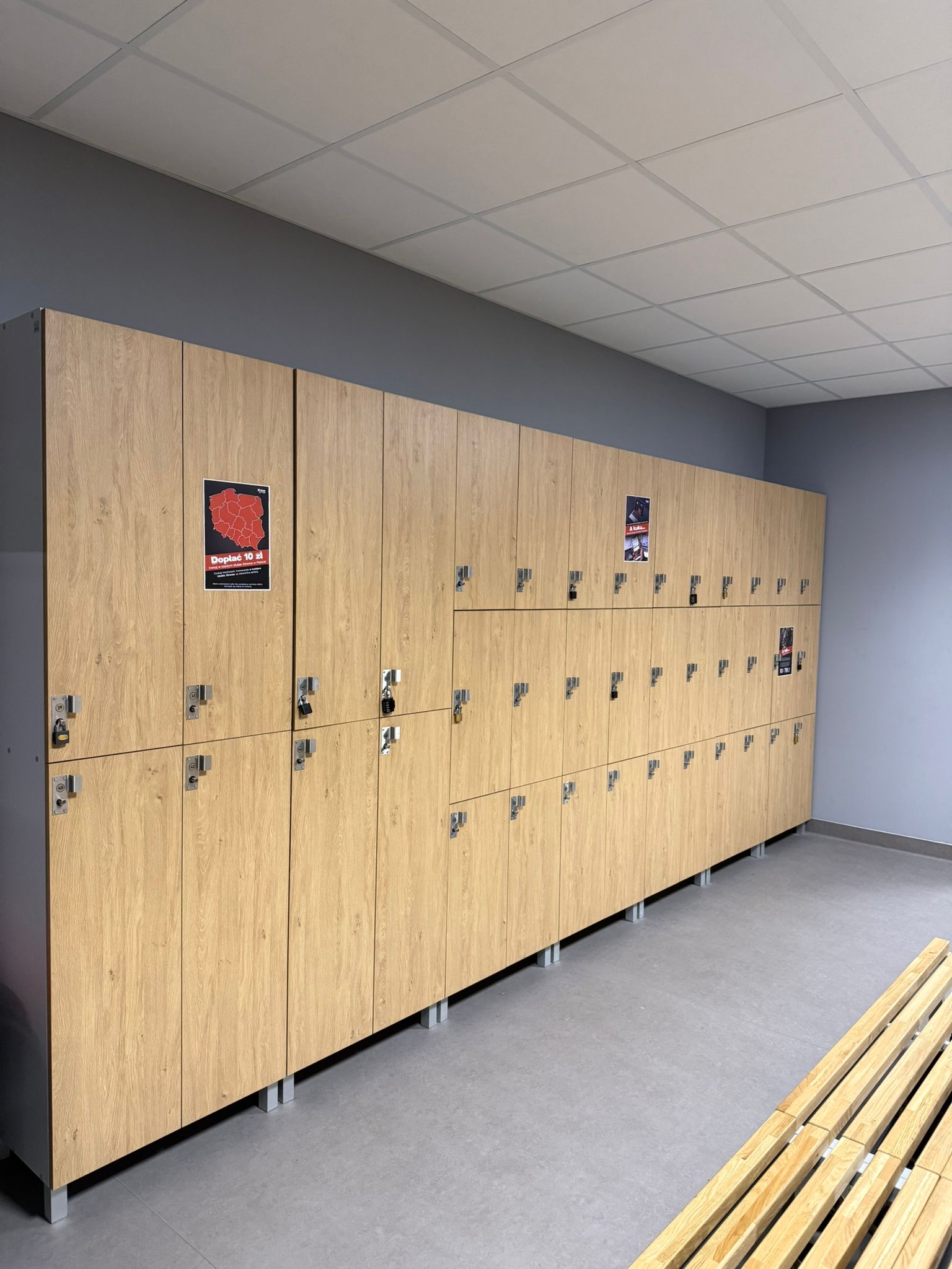 Uzupełnieniem tej przestrzeni są drewniane ławki, które zapewniają komfort korzystania z szatni oraz podnoszą standard całego wnętrza. Stabilna konstrukcja i trwałe materiały sprawiają, że zachowują one estetykę przez lata, nawet przy dużej rotacji użytkowników.