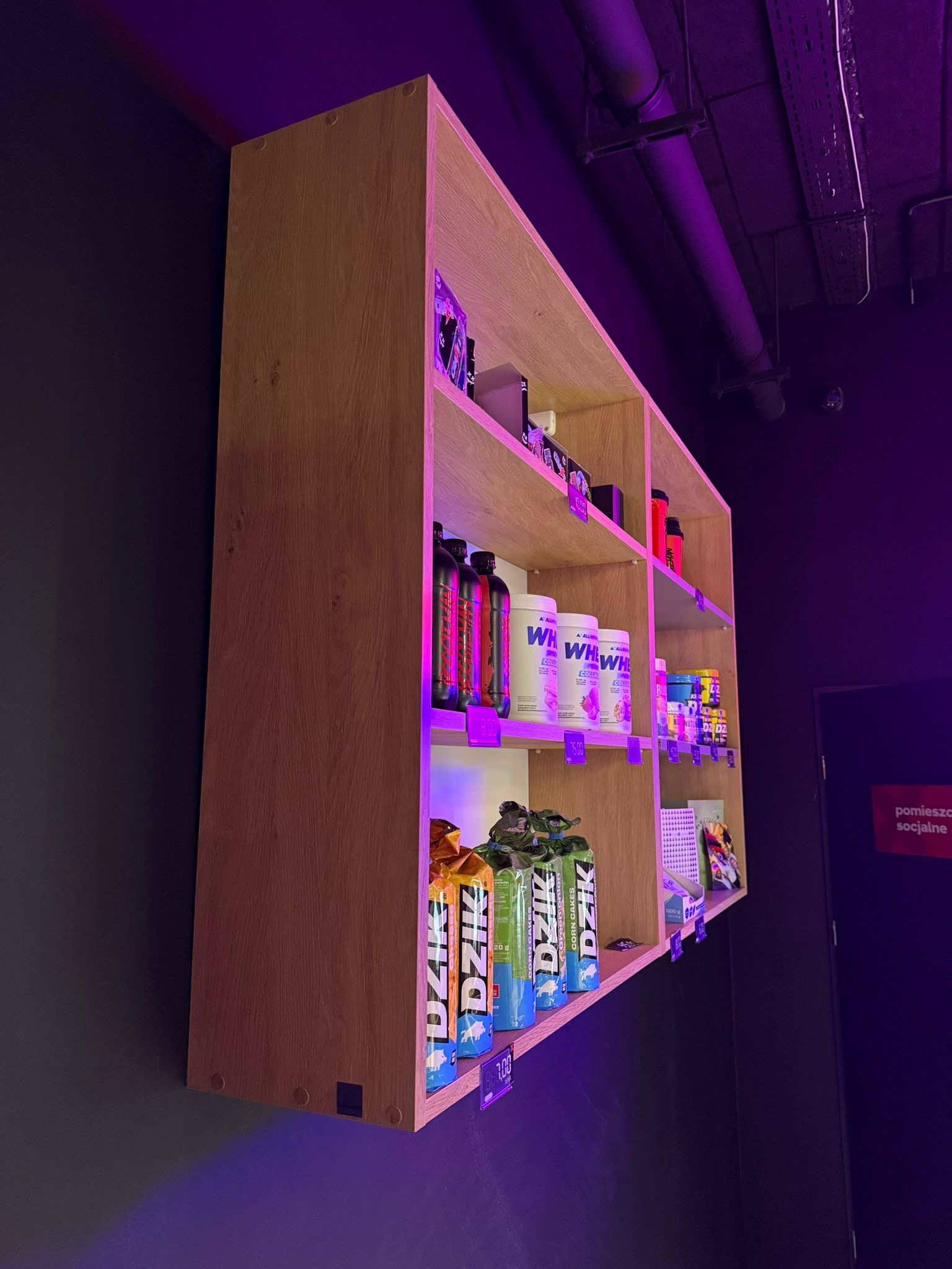 Naturalne drewno w strukturach wejściowych to coś, co nie tylko ociepla wizerunek klubu, ale też buduje premium feeling i naturalny kontrast do stali, maszyn, tworzyw treningowych. To jest pierwszy „touchpoint” zanim klient jeszcze zacznie trening. Klient wchodząc ma od razu sygnał – to miejsce jest przemyślane, a design jest na poziomie marki lifestyle a nie tylko siłowni z maszynami.