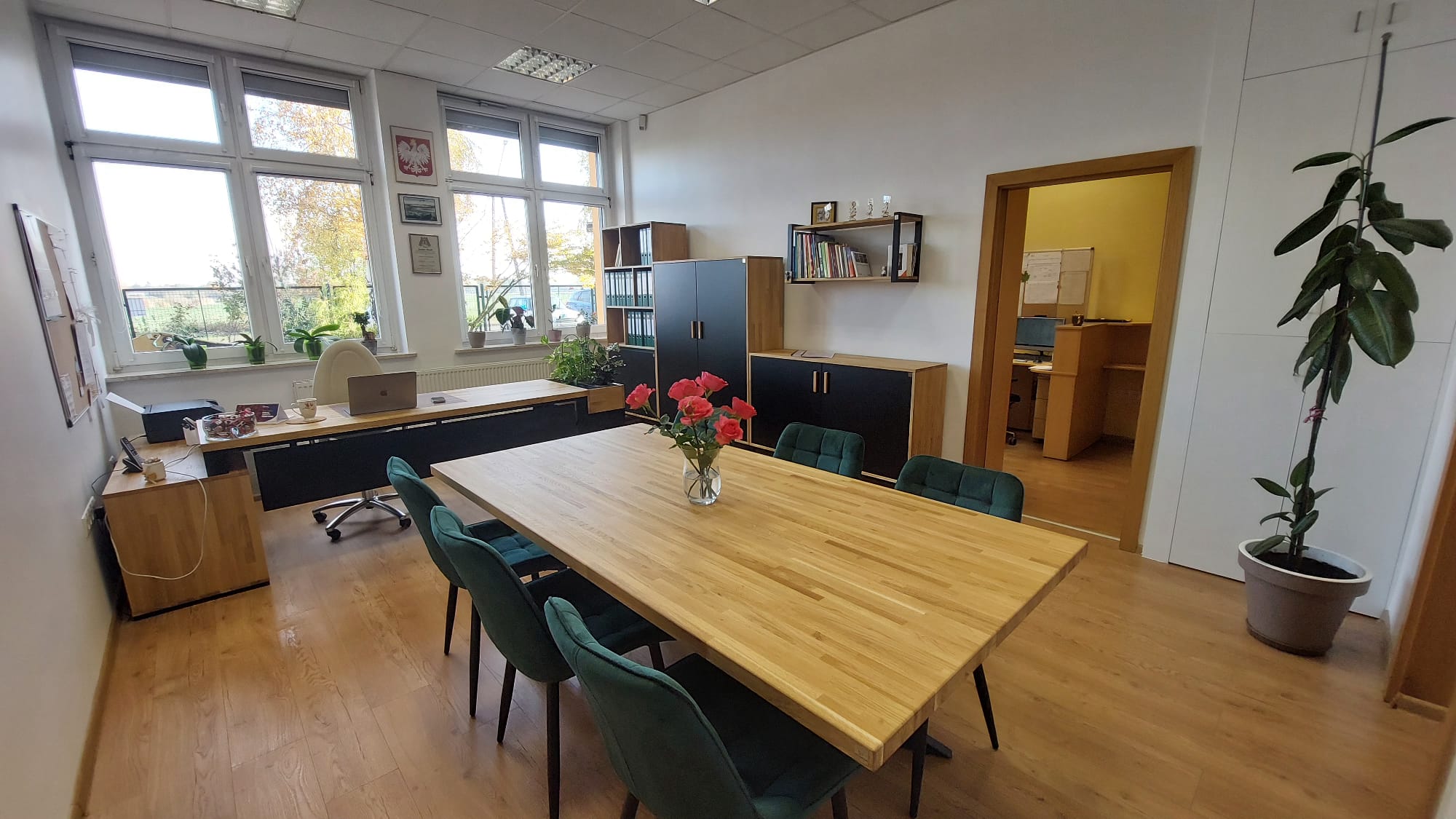 Nowe wnętrze sprzyja zarówno skupieniu, jak i rozmowie. Meble w odcieniach dębu i czerni wprowadzają spokój i harmonię, a zieleń roślin dodaje naturalnej energii. To gabinet, który budzi zaufanie i jednocześnie pozwala czuć się swobodnie – miejsce, w którym praca staje się przyjemniejsza każdego dnia.