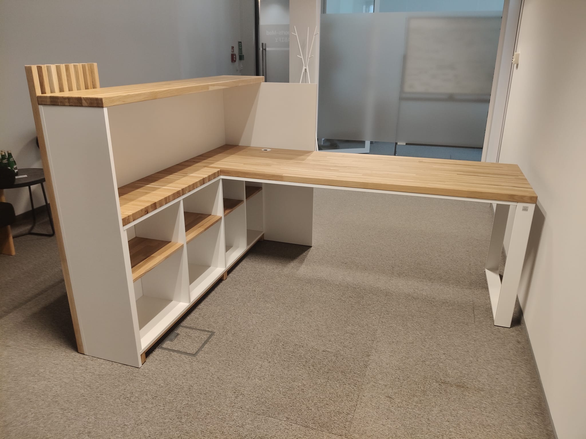 Zamówienie objęło nowoczesne biurko narożne, wykonane z litego drewna dębowego oraz stali malowanej proszkowo na biało. Biurko pełni funkcję lady recepcyjnej.