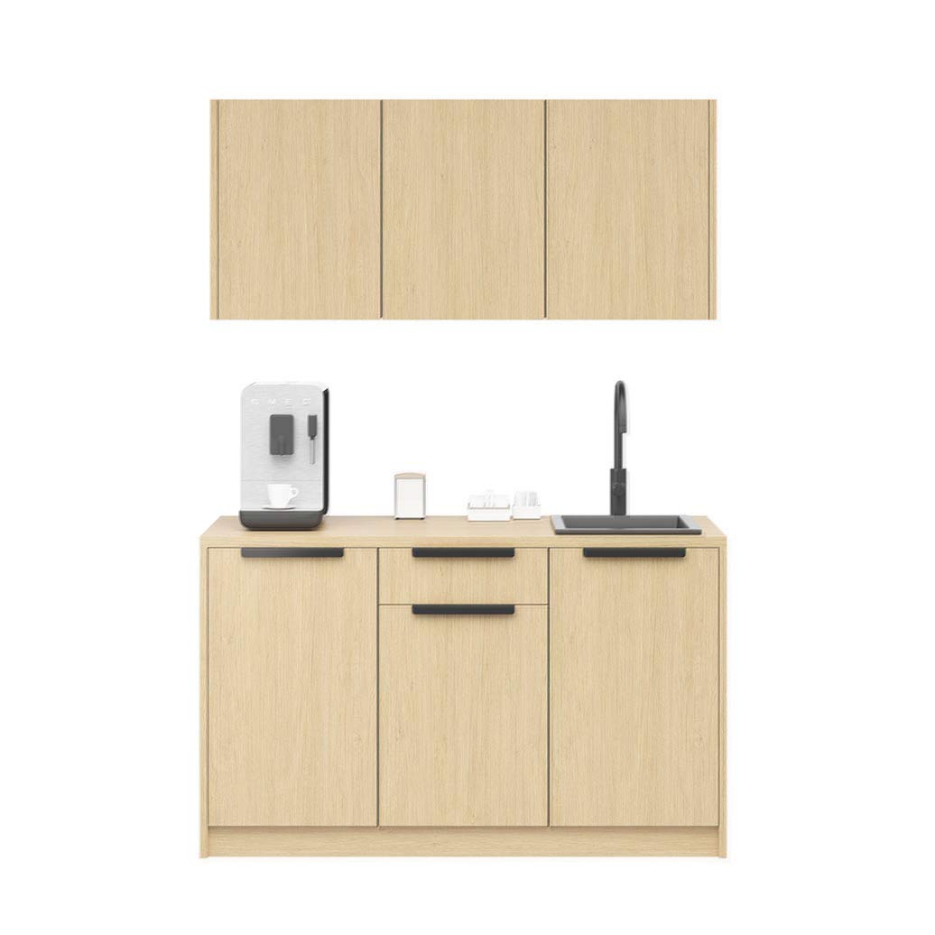 Praktyczność może iść w parze z elegancją – ten jasny aneks kuchenny jest tego najlepszym przykładem. Niewielki, ale dobrze zaprojektowany zestaw tworzy wygodne miejsce do przygotowania kawy czy szybkiego posiłku w biurze. Pojemne górne i dolne szafki ułatwiają organizację, a zlew z czarną baterią dodaje nowoczesnego stylu i funkcjonalności.