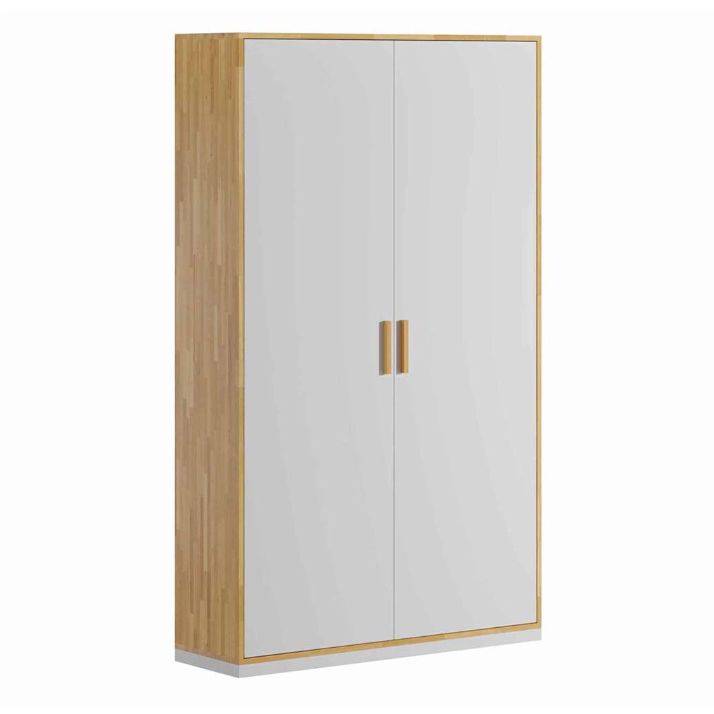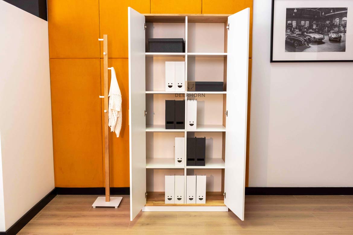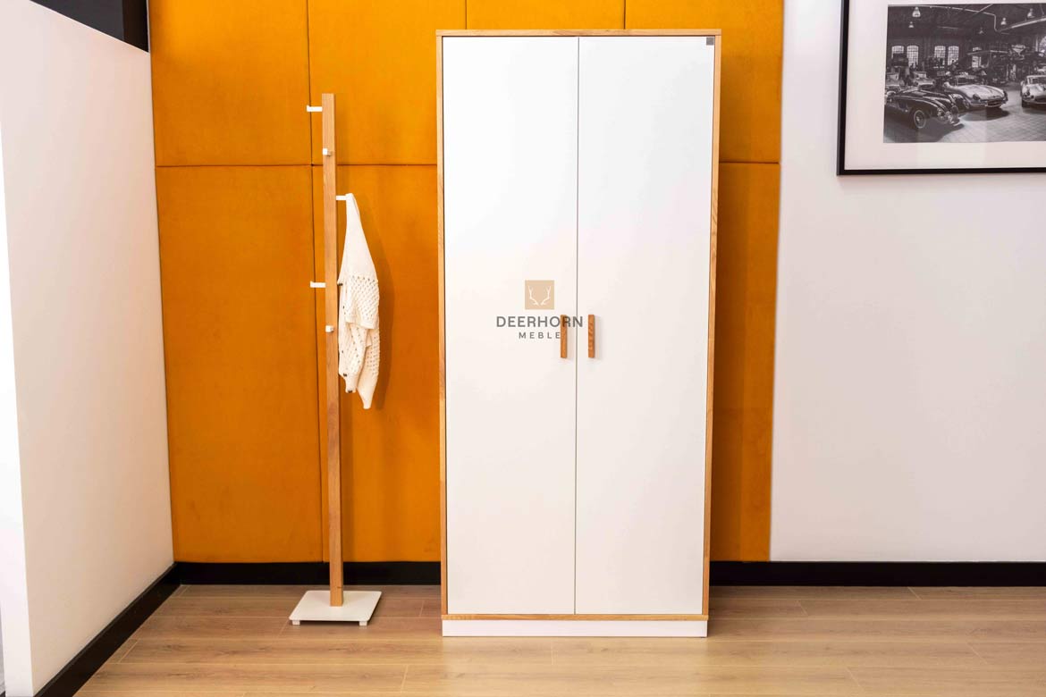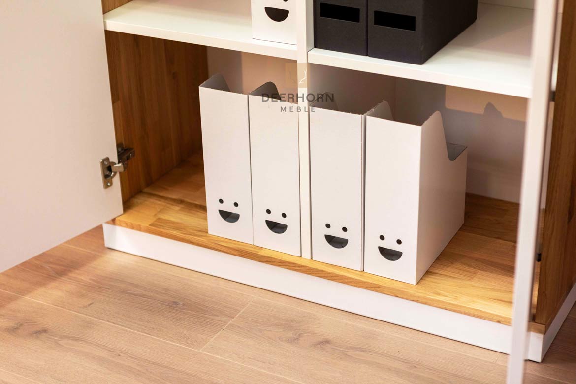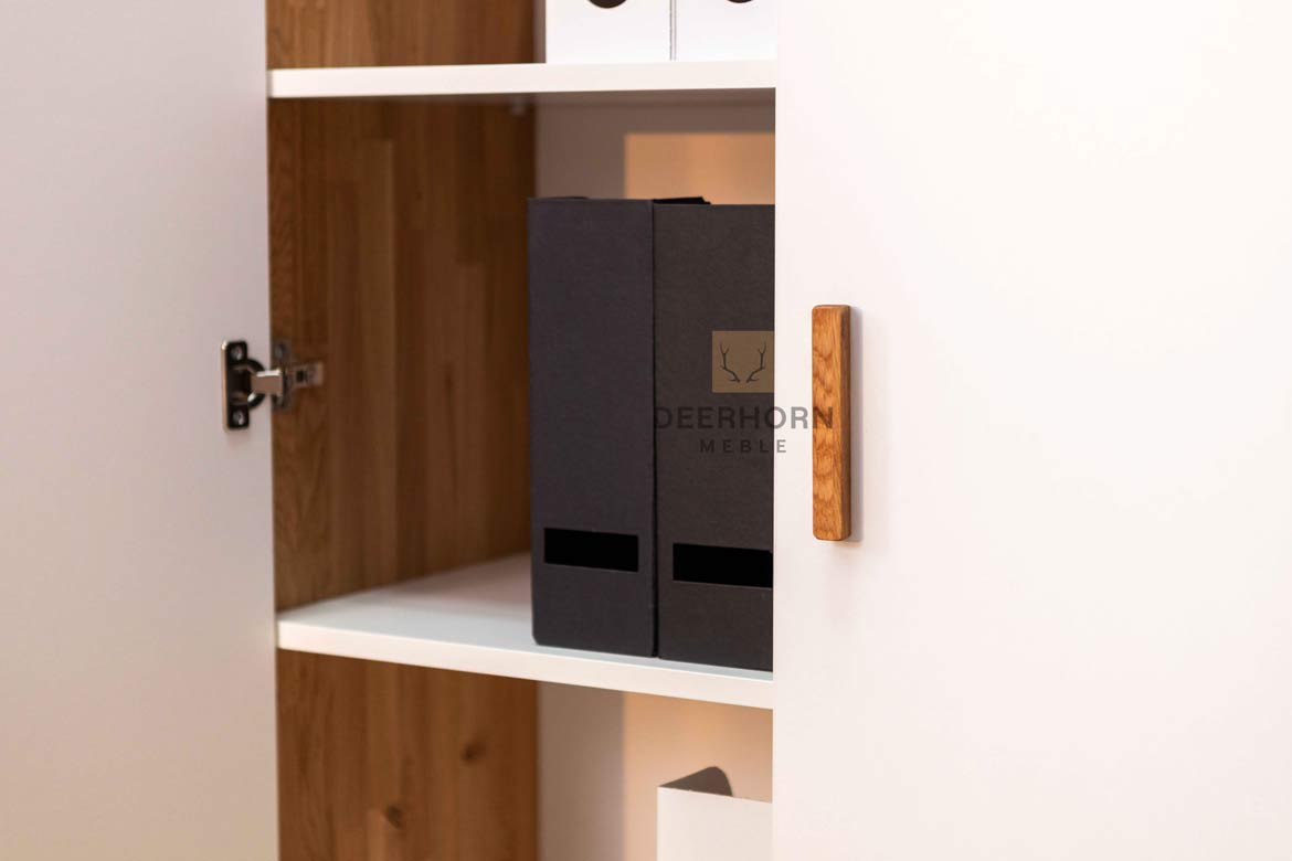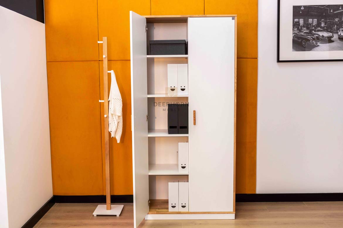 Biała szafa na segregatory z drewna, płyty i metalu. Szerokość 90cm