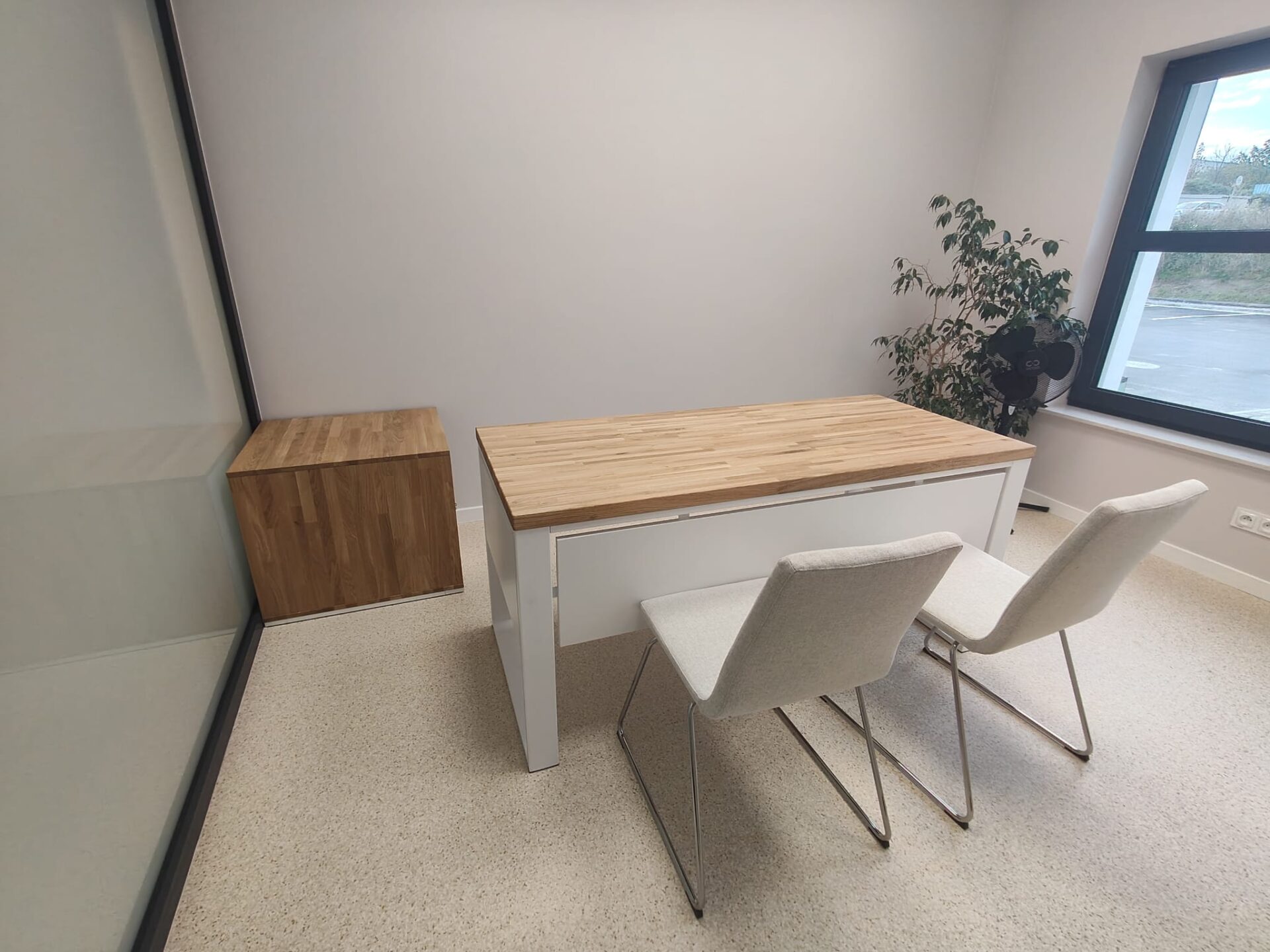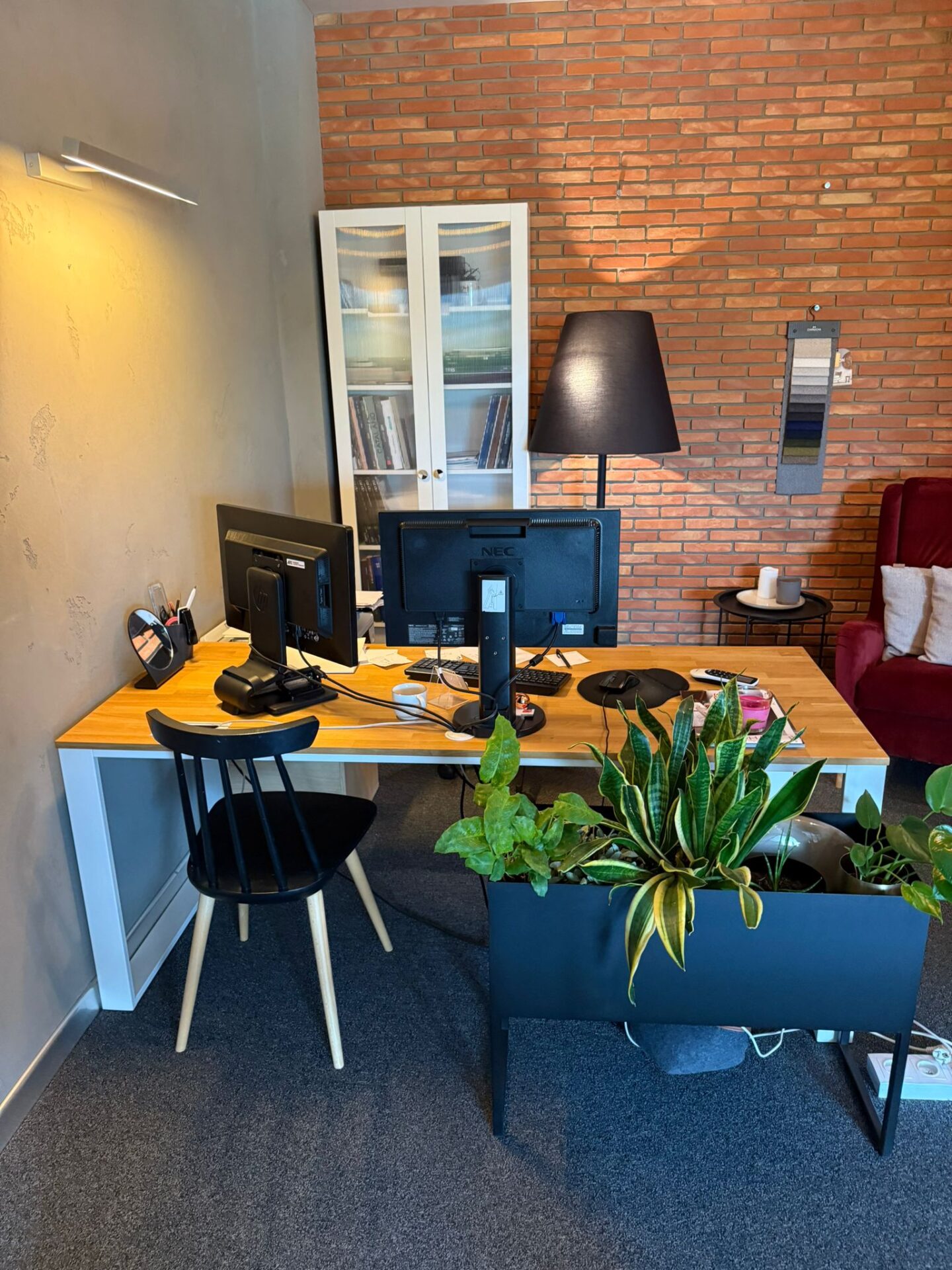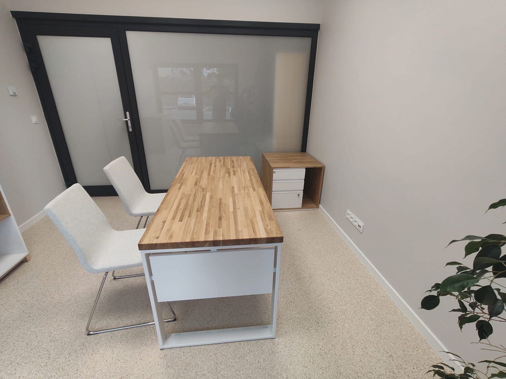 To biurko ma w sobie fajny balans – jest proste, ale nie nudne. Jasny blat ociepla przestrzeń, a całość wygląda lekko i uporządkowanie. Daje komfort do pracy i rozmów, bez poczucia „biurowego ciężaru”. Takie miejsce, przy którym pracuje się naturalnie i bez spiny.