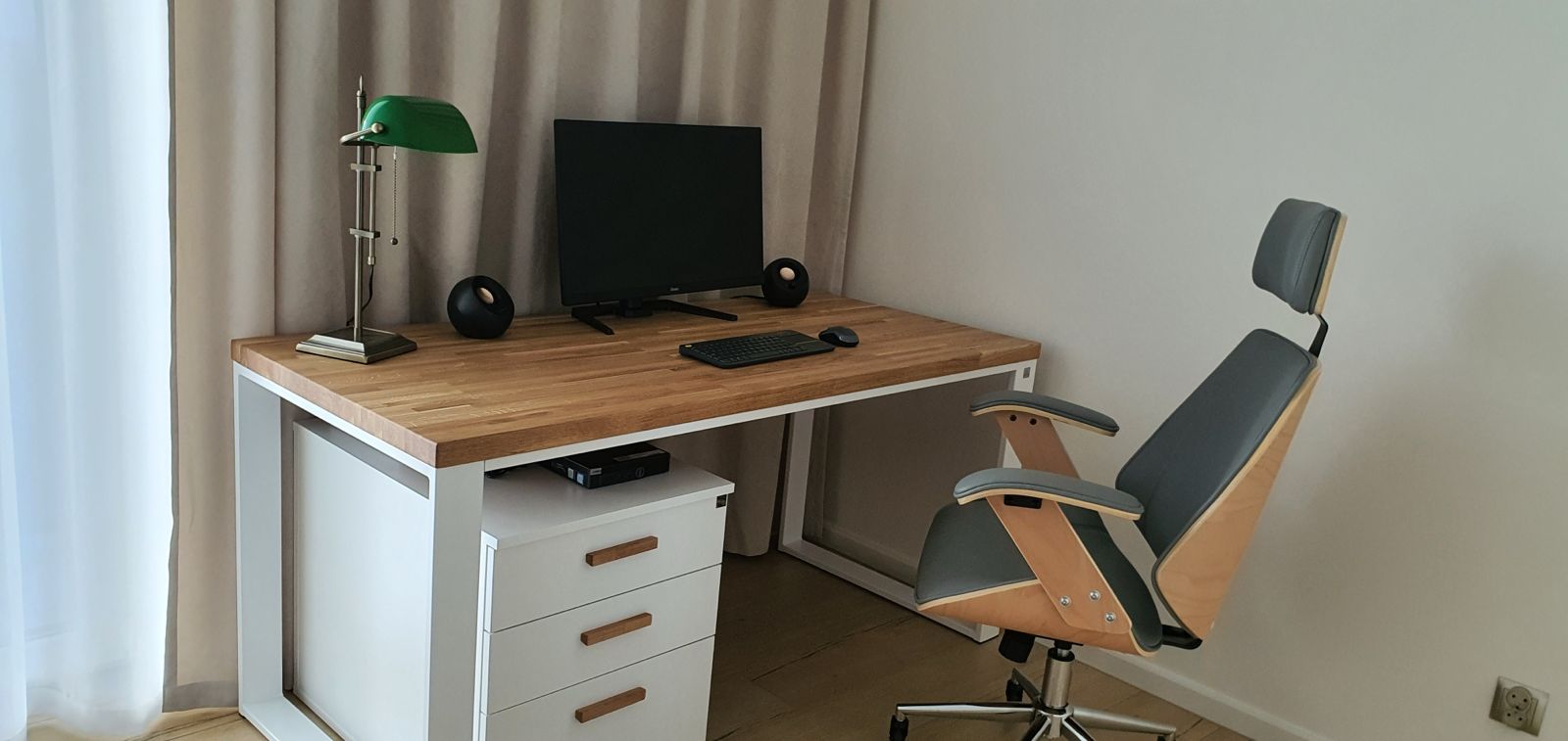 To biurko wygląda po prostu dobrze i spokojnie. Ma fajne proporcje, nie przytłacza pokoju, a jednocześnie daje wygodną przestrzeń do pracy. Blat jest solidny, wszystko stoi stabilnie i nic się nie rusza. Kontenerek pod ręką robi robotę – porządek sam się ogarnia. Takie biurko, przy którym po prostu chce się usiąść i coś zrobić.
