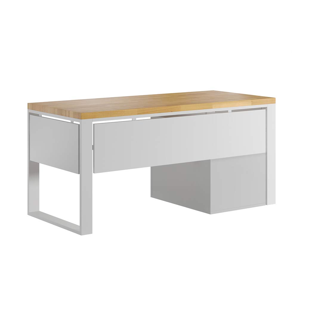Nowoczesne biurko z kontenerkiem o wymiarach 160×80 cm to idealne rozwiązanie do biura, gabinetu lub domowej przestrzeni do pracy. Szeroki blat w kolorze naturalnego drewna zapewnia wygodną przestrzeń roboczą, a biały stelaż nadaje całości lekkości i elegancji. Zestaw uzupełnia praktyczny kontenerek z trzema pojemnymi szufladami, które pozwalają utrzymać porządek i mieć wszystkie potrzebne akcesoria zawsze pod ręką. Solidna konstrukcja gwarantuje trwałość, a nowoczesne wzornictwo sprawia, że komplet doskonale wpasuje się w jasne, minimalistyczne i nowoczesne wnętrza.