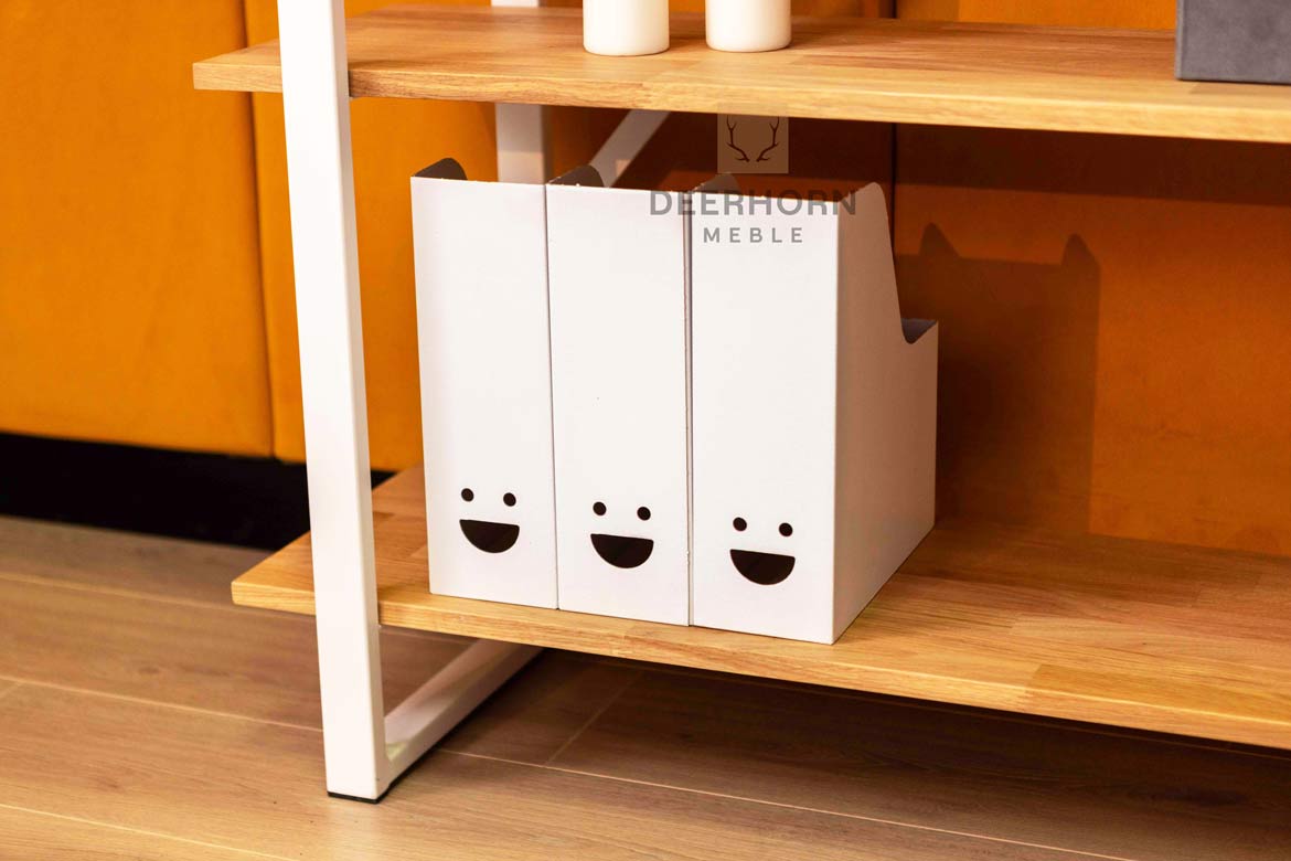 Marzysz o uporządkowanym i estetycznym biurze? Nasz biały regał z drewnem na segregatory to idealne rozwiązanie. Pojemne półki pozwolą Ci w prosty sposób zorganizować wszystkie ważne dokumenty, utrzymując porządek na Twoim biurku. Elegancki, biały design doda Twojej przestrzeni pracy świeżości i nowoczesności, tworząc przyjazną atmosferę do pracy.