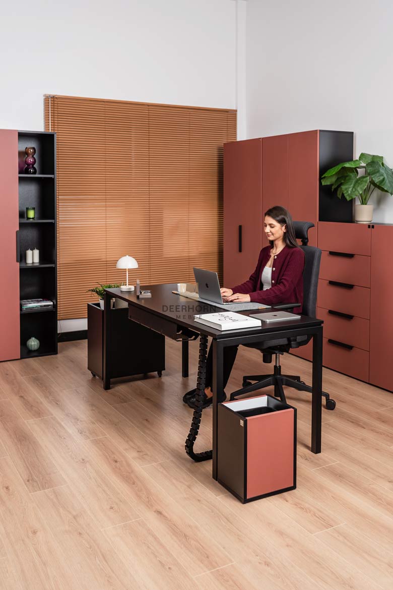 Wszystkie meble korporacyjne z tej kolekcji wykonano z odpornej na intensywne użytkowanie płyty meblowej, która lepiej znosi codzienny nacisk, tarcie i ruch w biurze. Dzięki temu zachowują elegancki wygląd przez wiele lat, nawet w miejscach o dużym natężeniu pracy. Proste formy, wyraziste linie i spójna kolorystyka nadają biurom prestiżowego charakteru.