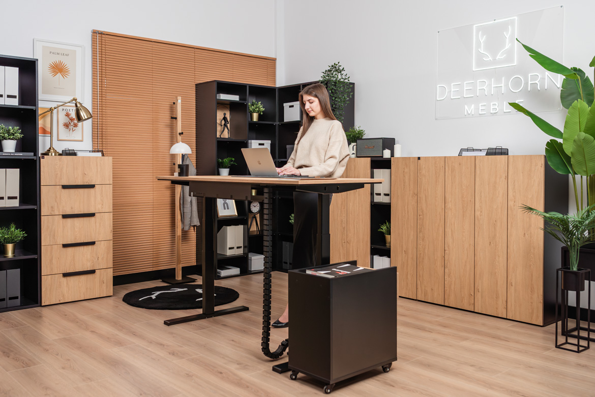 Biurko elektryczne z ergonomiczną regulacją i pamięcią wysokości z wąskim kontenerkiem na kółkach