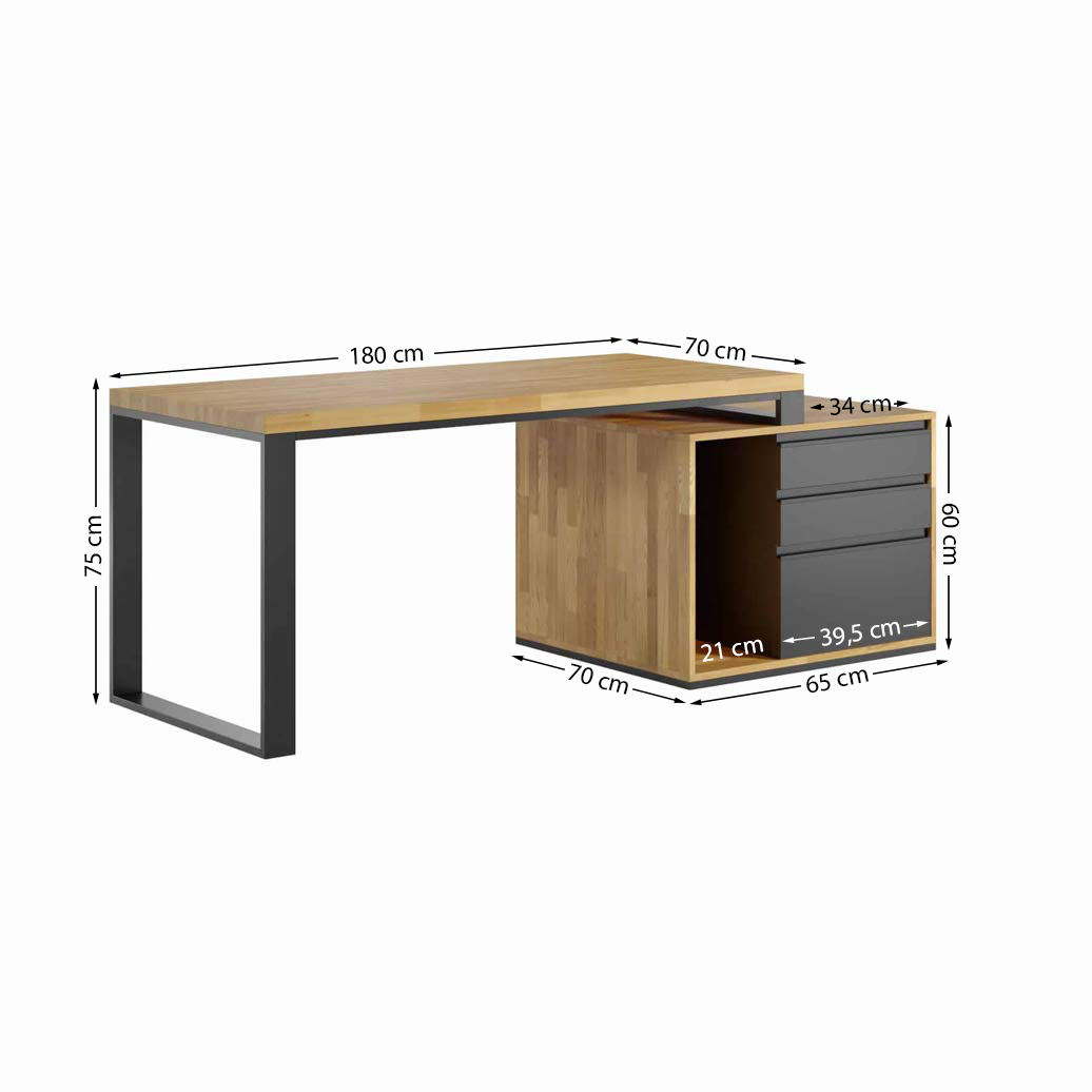 - wymiary blatu: 180×70 cm plus kontenerek. Długość całego biurka wraz z kontenerkiem 214 cm