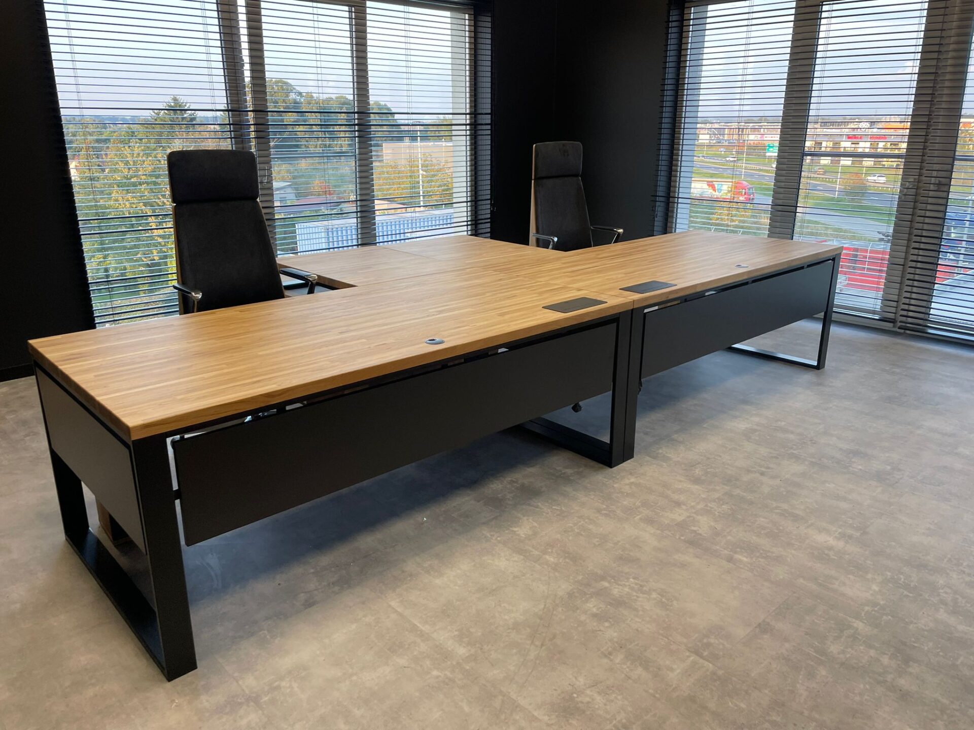 Dwa biurka narożne połączone w jedno duże stanowisko pracy to rewelacyjne rozwiązanie. Jest mnóstwo miejsca do pracy, wszystko dobrze zorganizowane i bardzo wygodne na co dzień. Całość wygląda nowocześnie i solidnie 👍