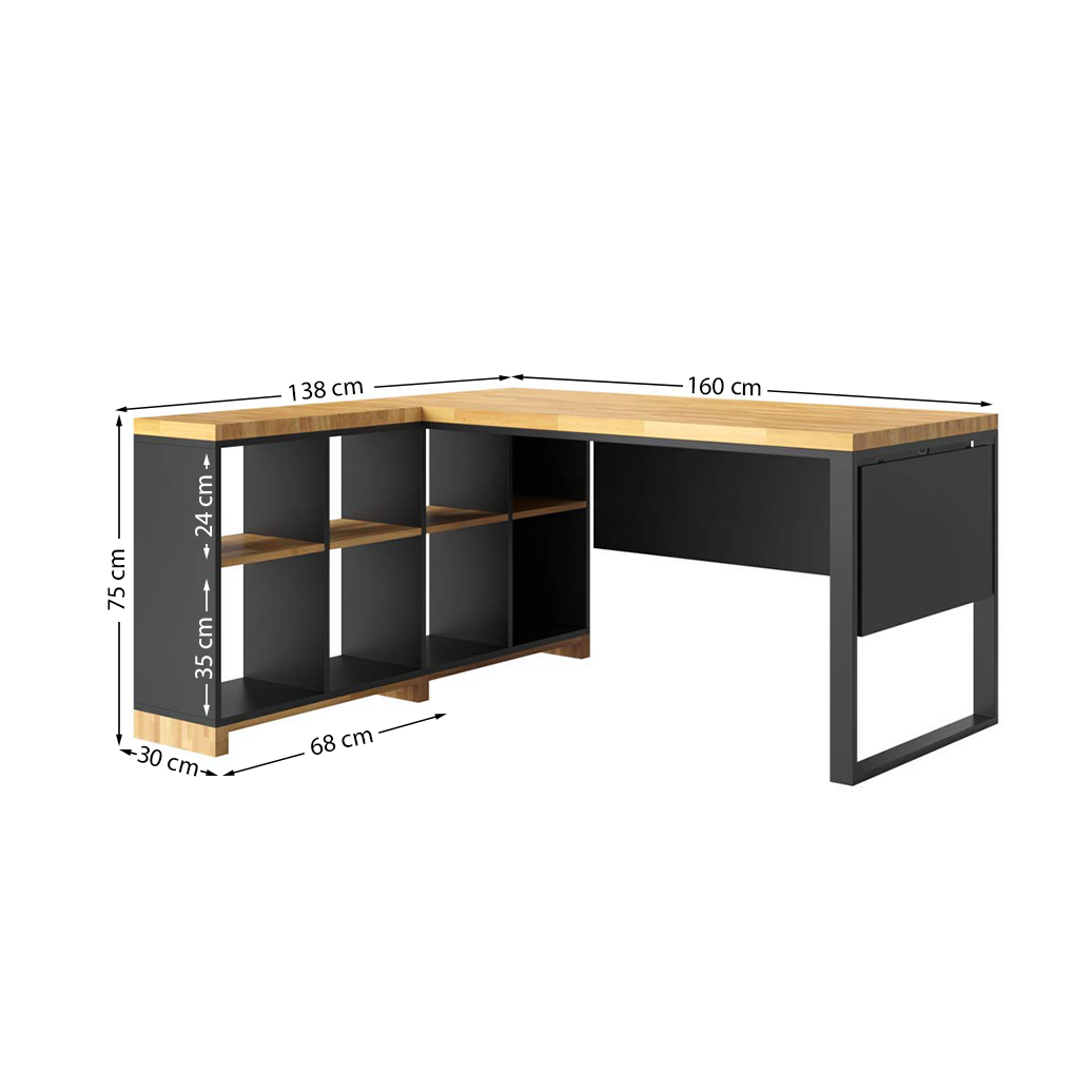Odkryj nasze nowoczesne biurko narożne, które łączy elegancję drewna, wytrzymałość metalu i nowoczesną czarną, matową płytę. Wyposażone w praktyczną osłonę pod blatem, zapewnia schludny wygląd i ukrywa okablowanie. Dodatkowo, wbudowane półki na segregatory oferują funkcjonalne rozwiązanie do organizacji dokumentów. To biurko nie tylko doskonale wpasowuje się w nowoczesne wnętrza, ale także łączy styl z wyjątkową funkcjonalnością.