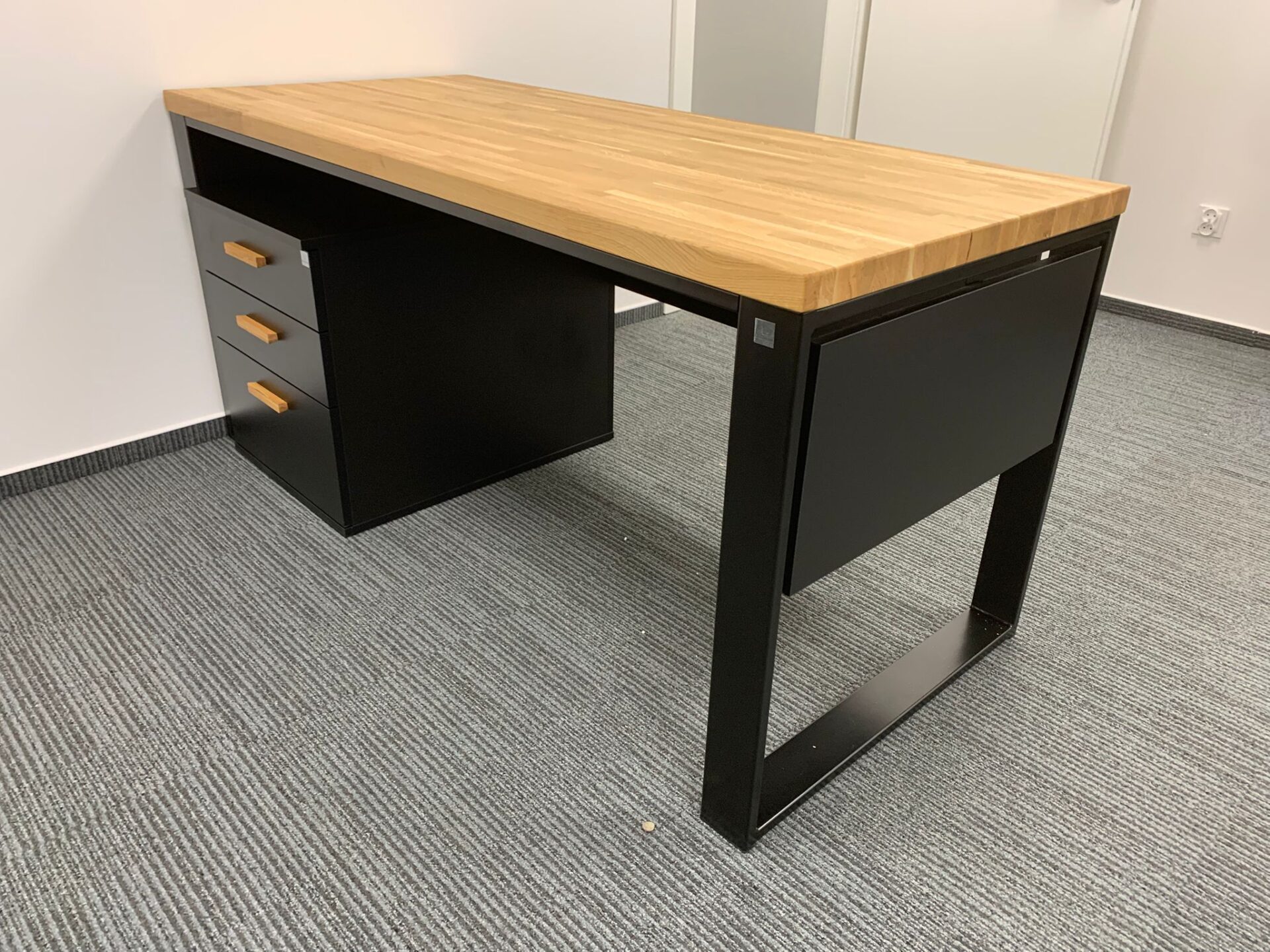 Nowoczesne biurko z naturalnym blatem z litego dębu to idealny wybór do biura, gabinetu lub domowej pracowni. Ciepły odcień drewna w połączeniu z metalową podstawą tworzy ponadczasowy wygląd, który świetnie odnajdzie się zarówno w klasycznym, jak i nowoczesnym wnętrzu.