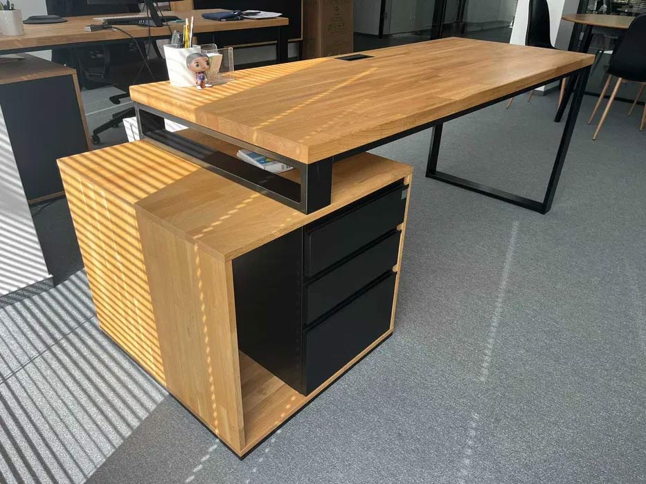 Klienci wciąż poszukują nowoczesnych rozwiązań, dlatego my także pragniemy rozwijać nasz asortyment. W tym celu zostało odmienione również biurko metal drewno. Wystarczyło, że jedna część stelaża została zastąpiona krótszą wersją, by odnowić jego wygląd. Stelaż metalowy połączony z kontenerkiem, który także występuje w odświeżonej wersji, tworzy jedną spójną całość, przy czym wygląda fenomenalnie. Dzięki temu zajmuje też mniej miejsca, co jest korzystne w przypadku mniejszych pomieszczeń.