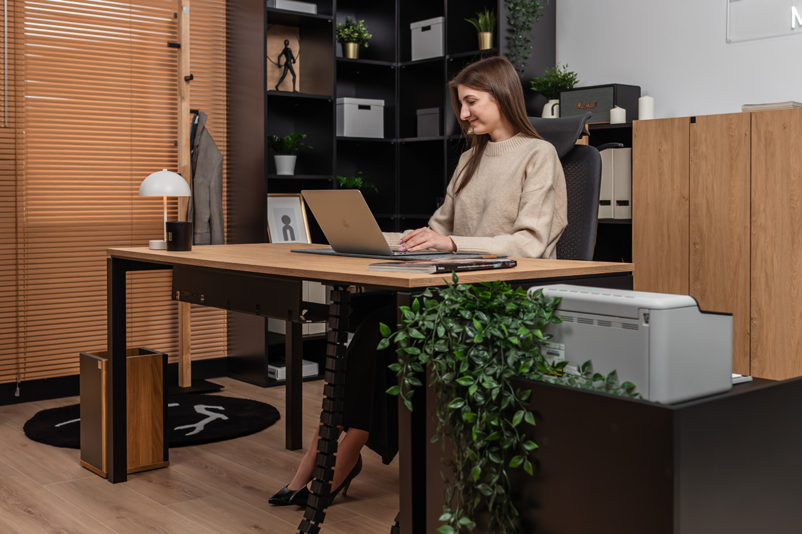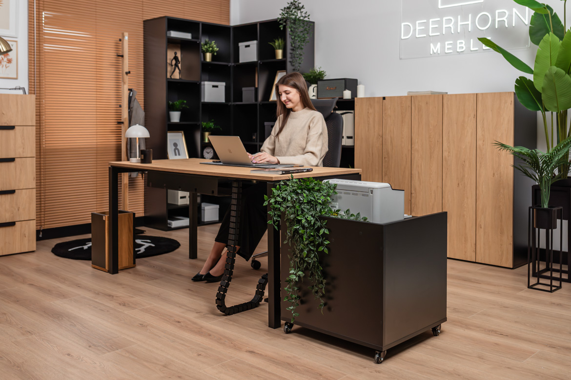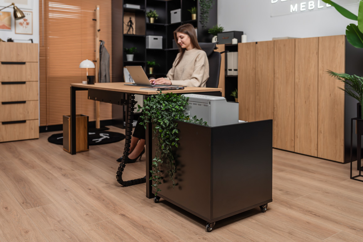 Dodatkowa szafka pod drukarkę pozwala wygodnie rozlokować sprzęt biurowy oraz akcesoria, dzięki czemu na blacie pozostaje więcej miejsca na laptop, dokumenty i codzienne obowiązki. Stabilna konstrukcja zapewnia komfort i pewność podczas pracy, a przemyślana organizacja pomaga utrzymać porządek przez cały dzień.