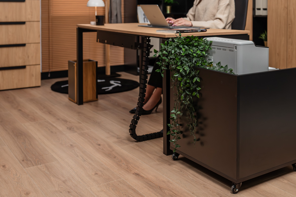 Drewnopodobna powierzchnia nadaje biurku eleganckiego, ponadczasowego wyglądu, a jej realistyczna struktura przypomina naturalne drewno. Mebel świetnie wpasuje się zarówno w przestrzeń firmową, jak i w domowe biuro, tworząc spójną i komfortową strefę pracy.