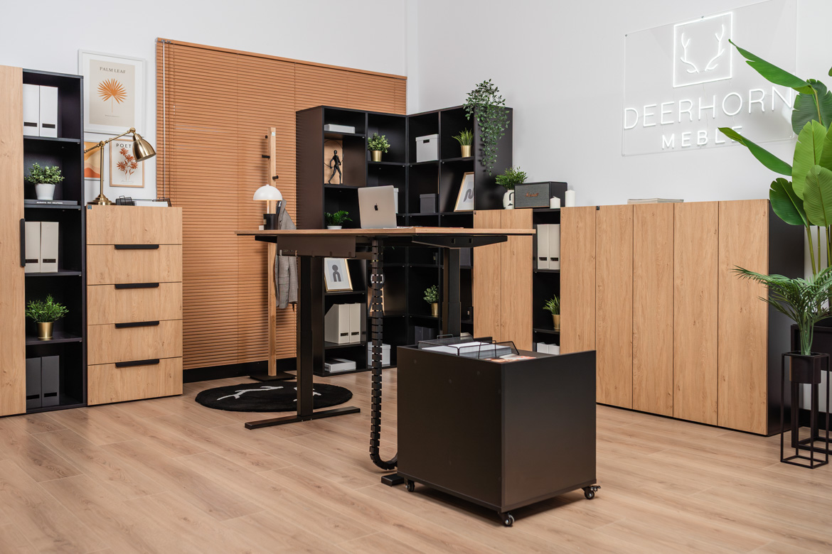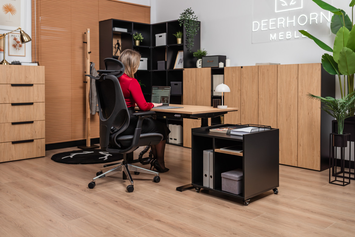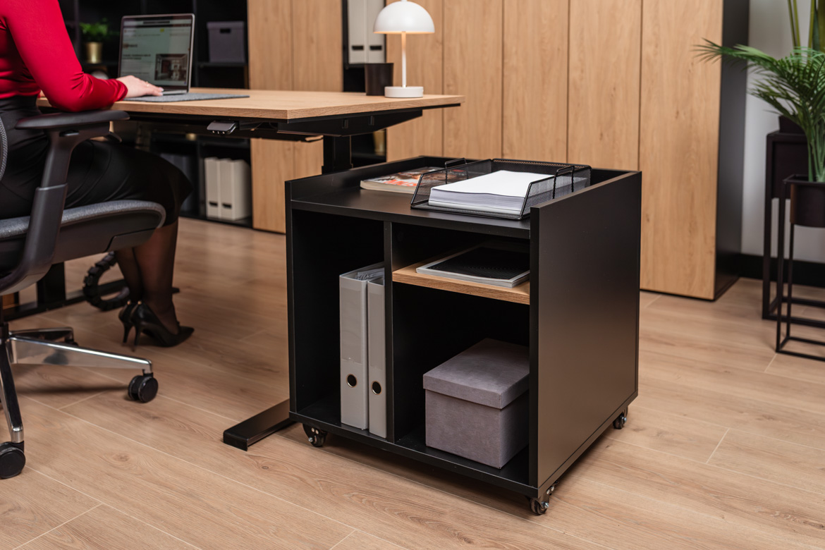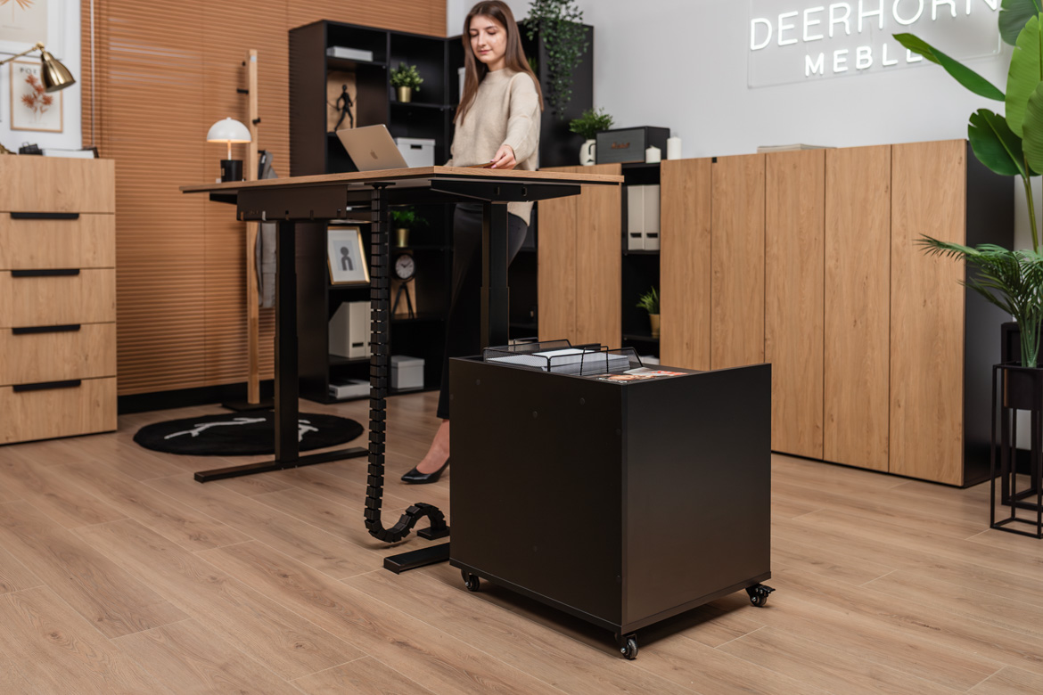 Uzupełnieniem zestawu jest praktyczna, mobilna szafka na kółkach, która zapewnia dodatkowe miejsce na dokumenty i akcesoria, jednocześnie nie zajmując dużo przestrzeni. Połączenie biurka z regulacją wysokości i funkcjonalnej szafki tworzy wygodne i dobrze zorganizowane miejsce pracy, odpowiednie zarówno do biura, jak i home office.