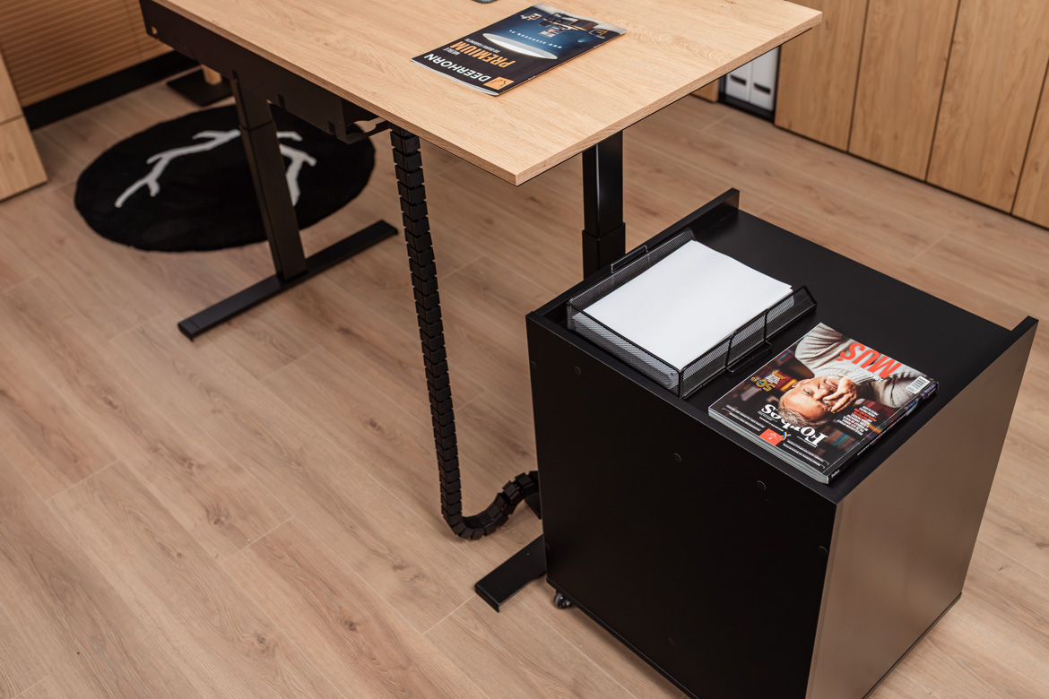 Biurko z regulacją wysokości do biura w zestawie z wysokim kontenerkiem na akcesoria i dokumenty