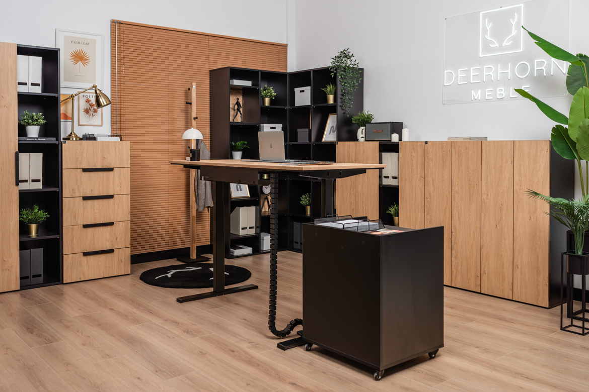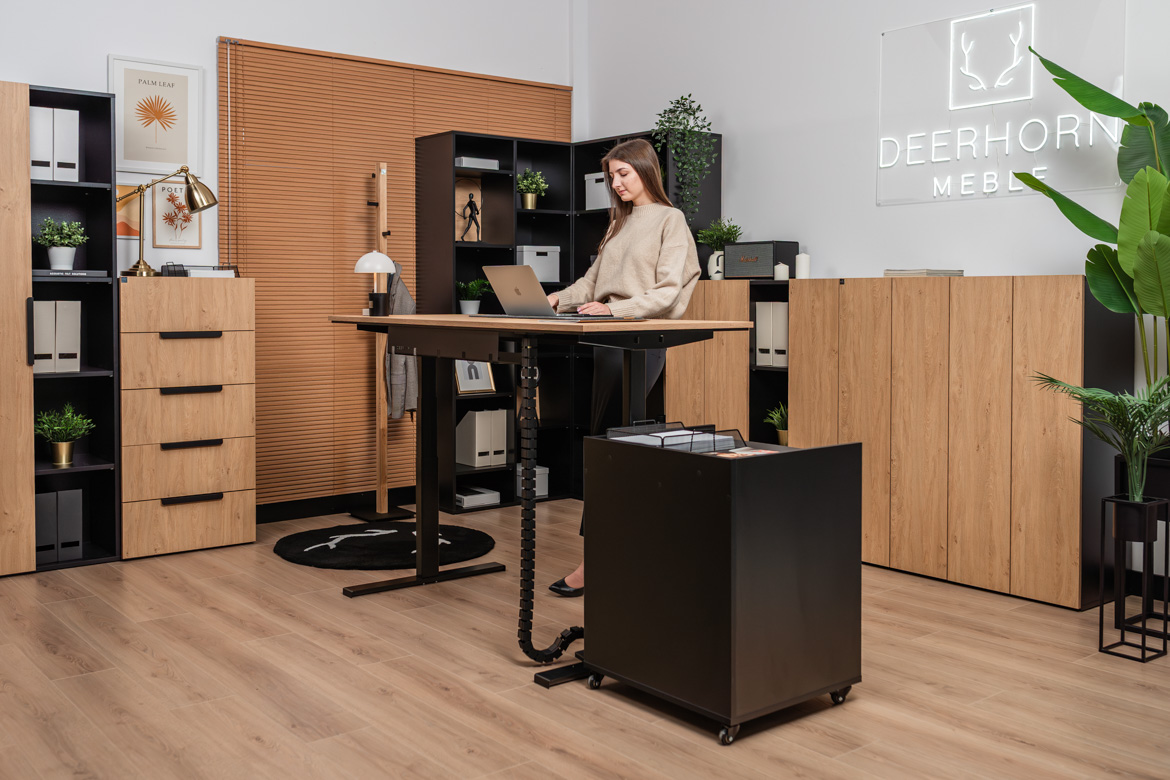 Zestaw biurowy z biurkiem z regulacją wysokości i wysokim kontenerkiem to idealne rozwiązanie dla osób, które potrzebują ergonomicznego, dobrze zorganizowanego miejsca pracy. Regulowany blat pozwala szybko dopasować wysokość do pozycji siedzącej lub stojącej, poprawiając komfort podczas wielogodzinnych obowiązków. Wysoki kontenerek oferuje dużo miejsca na dokumenty, akcesoria i niezbędne drobiazgi, dzięki czemu wszystko masz zawsze w zasięgu ręki. Połączenie funkcjonalności z estetycznym wykończeniem sprawia, że zestaw świetnie sprawdzi się zarówno w nowoczesnym biurze, jak i w home office.