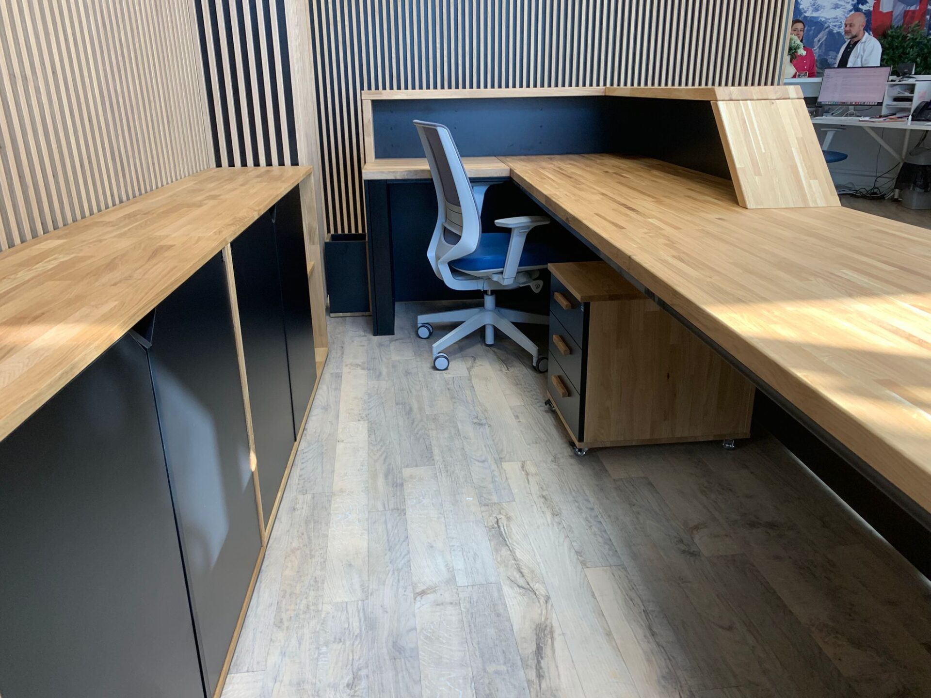 Biurko z drewnianym blatem i metalem charakteryzuje się niezwykłym kształtem stelaża. Zastosowano również podcięcie blatu pod kątem 45°, co daje fenomenalny efekt. Tak, aby ułatwić otwieranie biurowa szafa z półkami na segregatory, regał biurowy z półkami, a także komoda do biura i domu posiadają fronty z podcięciem, które dostosowaliśmy – w szczególności – do wymagań kobiet. Każda z tych zmian czyni poszczególny produkt unikatowym, co jest dużym atutem naszej firmy.