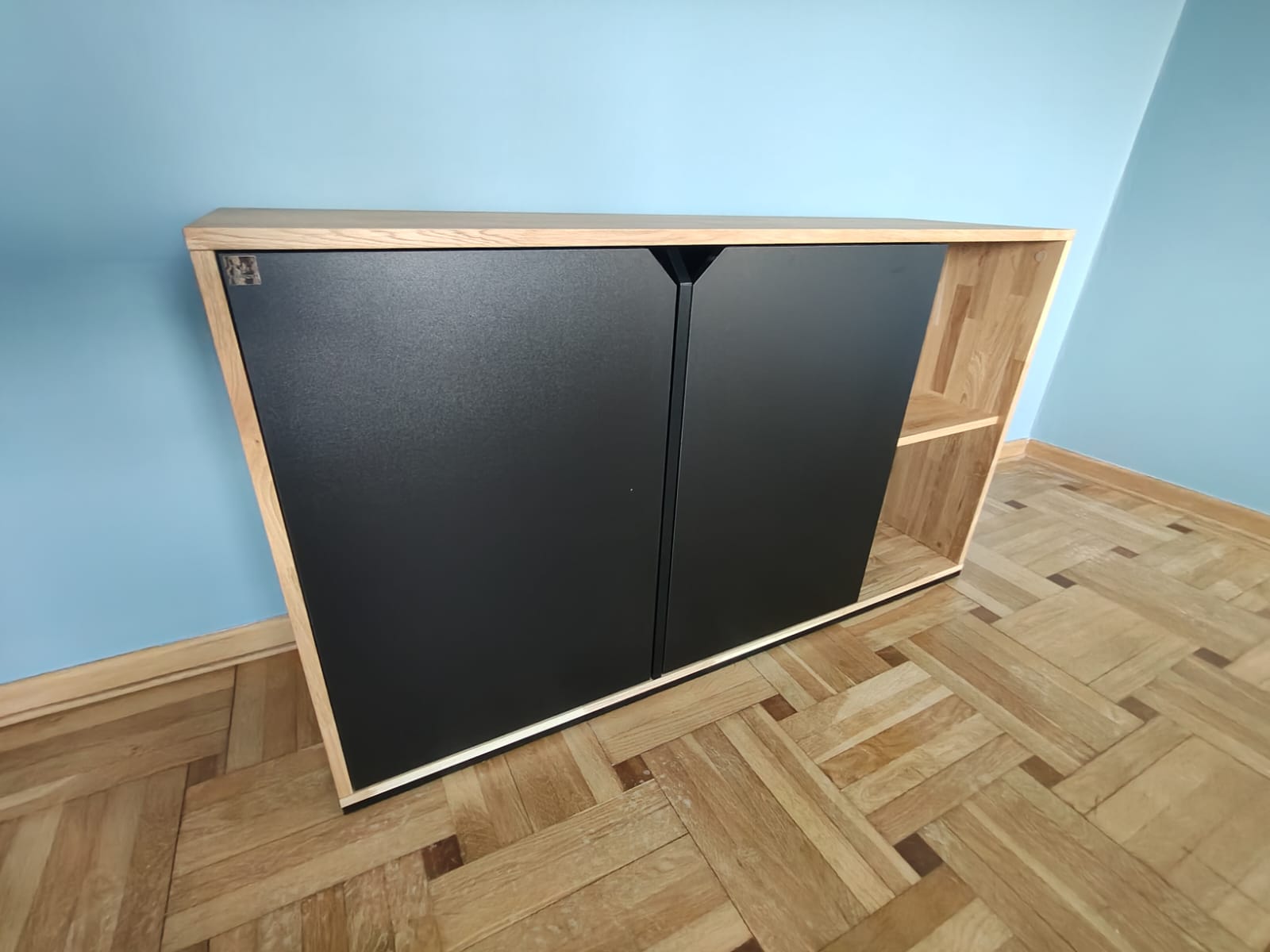 Komoda prezentuje się bardzo elegancko, jest solidnie wykonana, ma świetne połączenie drewna i czerni, jest pojemna i funkcjonalna, a jednocześnie wygląda nowocześnie i pasuje do wnętrza.