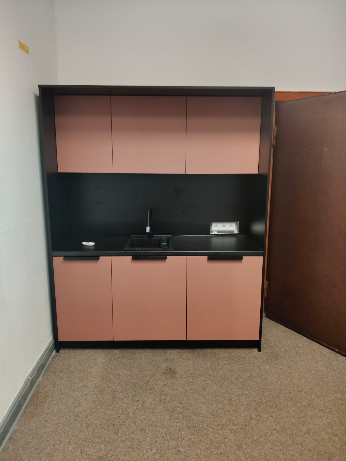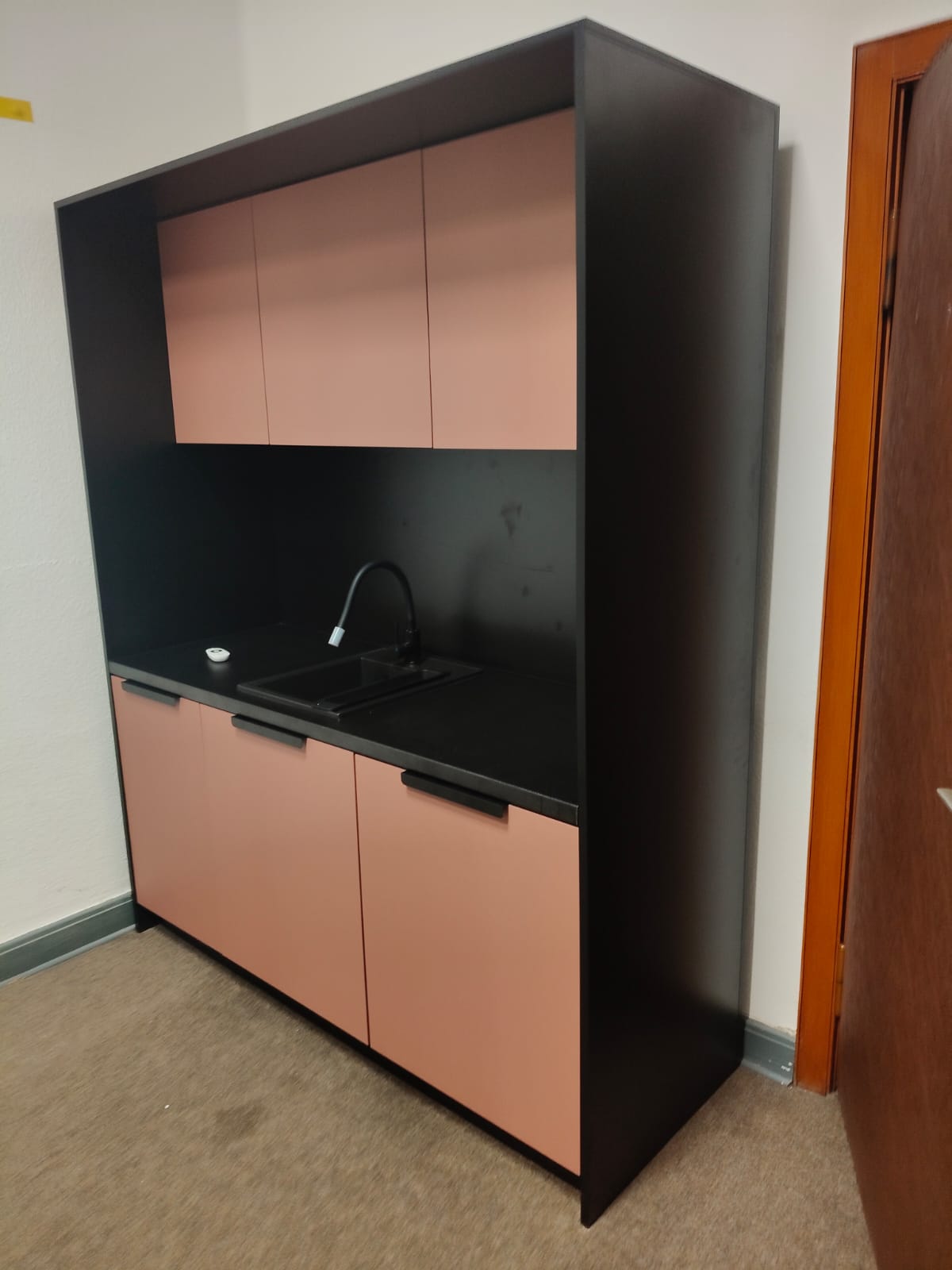 Ten model został zaprojektowany z myślą o nowoczesnych biurach, strefach relaksu i przestrzeniach socjalnych. Połączenie matowej czerni z frontami w odcieniu przytłumionej cegły tworzy eleganckie, spokojne tło dla codziennych obowiązków. Górne i dolne szafki pomieszczą wszystkie niezbędne akcesoria, a blat roboczy z łatwością pomieści ekspres do kawy, czajnik czy inne niezbędne urządzenia, pozostawiając przy tym przestrzeń do swobodnego przygotowania napojów i przekąsek. Całość dopełnia delikatne oświetlenie LED, które podkreśla nowoczesny charakter mebla i zapewnia wygodę na co dzień.