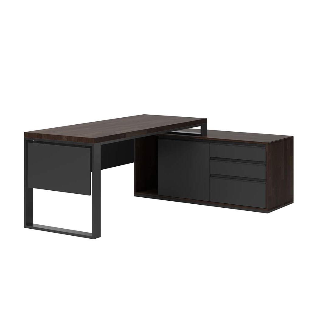 Przestrzeń, w której pracujesz, ma znaczenie. To biurko pomaga ją uporządkować tak, by każdy dzień był bardziej wygodny i efektywny. Szeroki blat daje swobodę działania – możesz rozłożyć dokumenty, laptopa czy notatki i wciąż mieć miejsce na więcej. Zintegrowany kontenerek z szufladami ułatwia utrzymanie porządku, a osobna przestrzeń na komputer stacjonarny pozwala zachować czystość i przejrzystość stanowiska pracy. Wszystko jest w zasięgu ręki – bez zbędnego chaosu. Ciemne drewno w połączeniu z czernią dodaje wnętrzu elegancji i spokoju. To mebel, który nie tylko ułatwia codzienne obowiązki, ale też sprawia, że praca staje się przyjemniejsza i bardziej uporządkowana.Wymiary biurka narożnego: