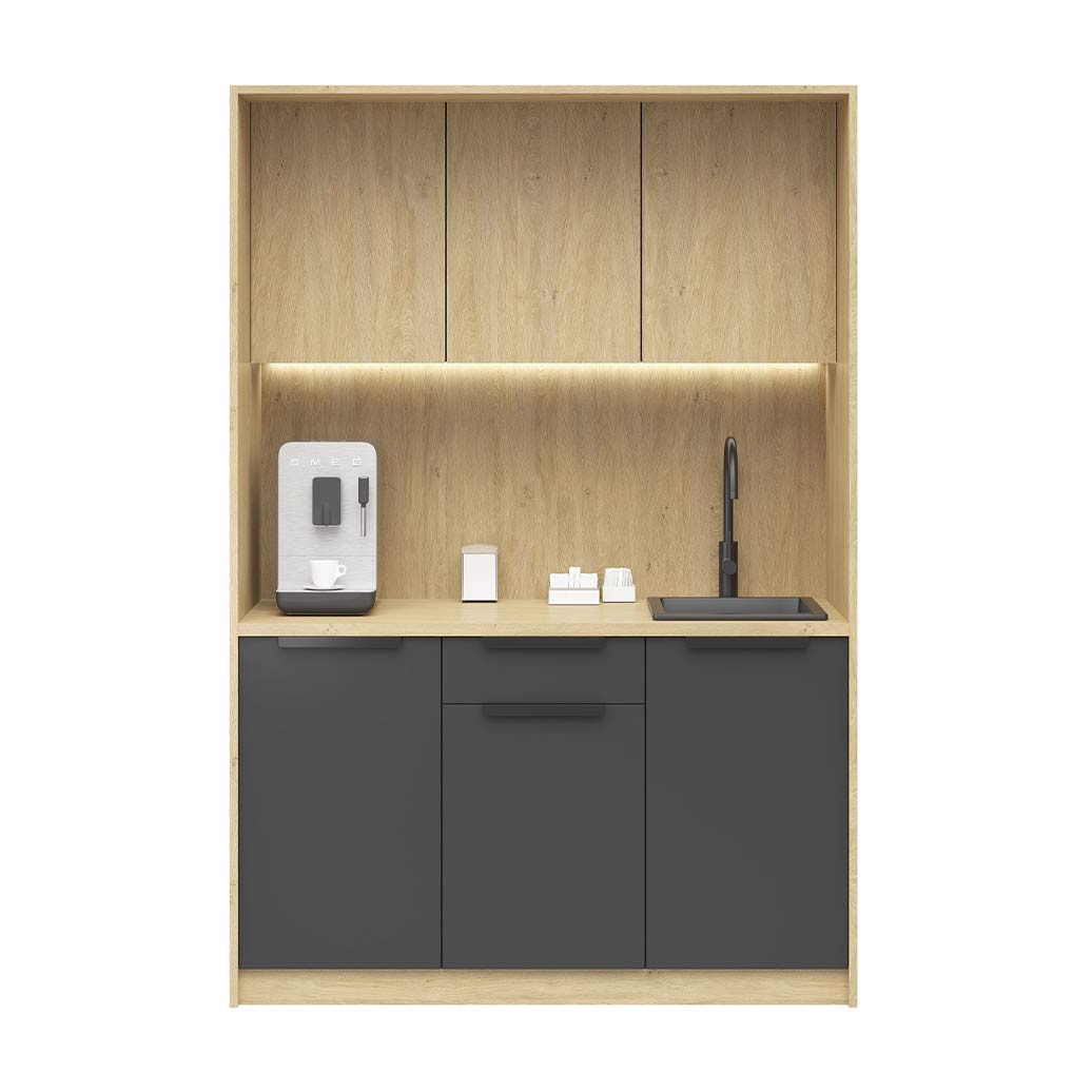Poranna kawa, szybka przerwa w pracy czy chwila rozmowy z zespołem – aneks kuchenny Corporate tworzy przestrzeń, w której te małe momenty stają się wygodne i przyjemne. To rozwiązanie, które wprowadza porządek i harmonię do biura, jednocześnie podnosząc jego standard.