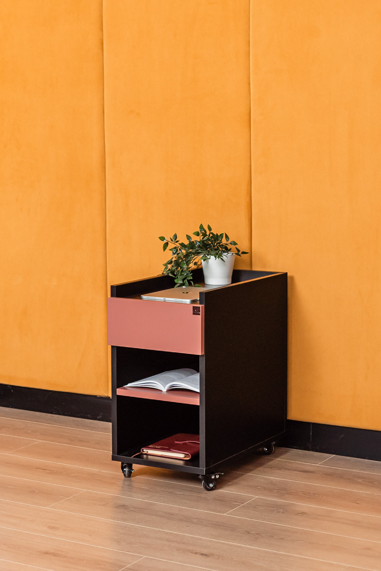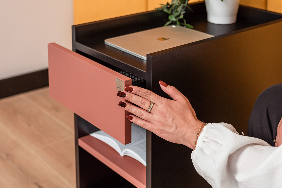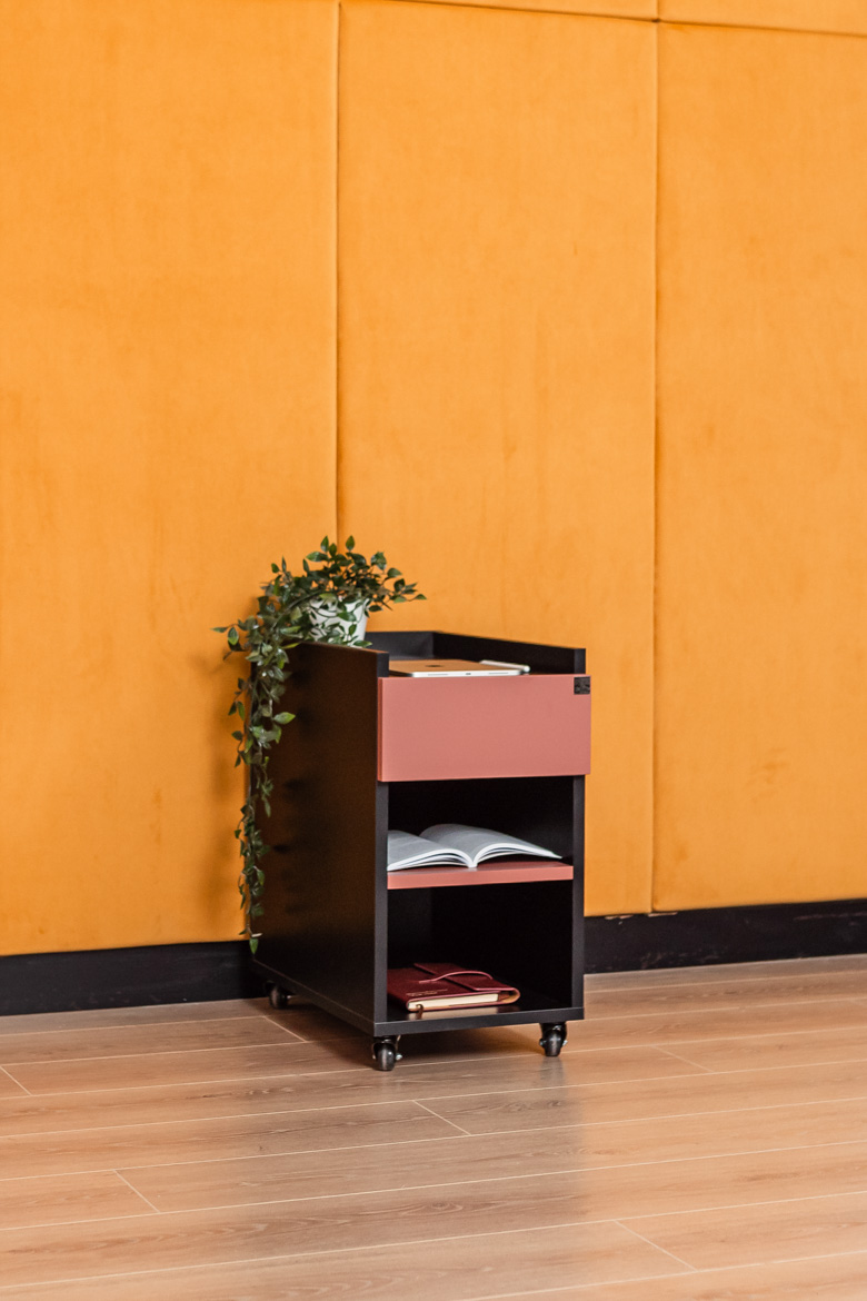 Kompaktowa forma sprawia, że idealnie sprawdza się nawet w niewielkich przestrzeniach, a nowoczesna kolorystyka – matowa czerń połączona z ceglastymi akcentami – nadaje przestrzeni wyrazisty i spójny wygląd. Kontenerek świetnie komponuje się z innymi meblami z tej samej linii, tworząc spójną i funkcjonalną aranżację.