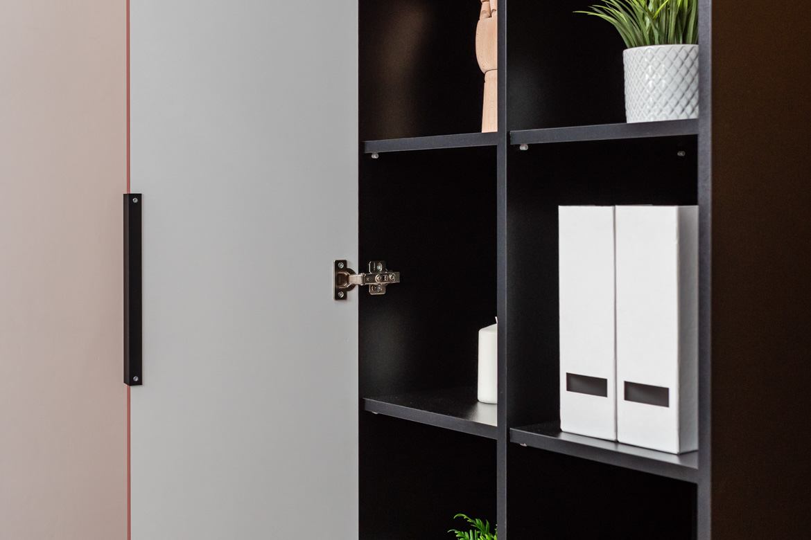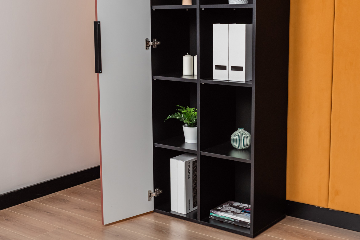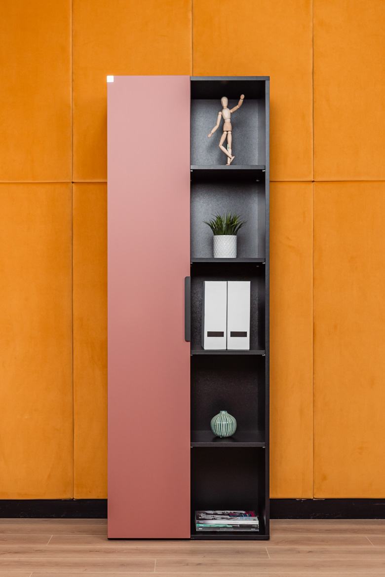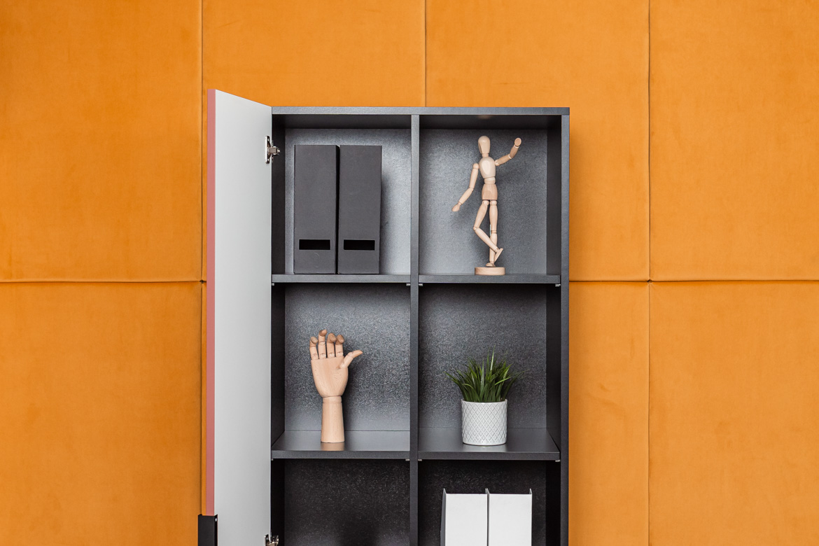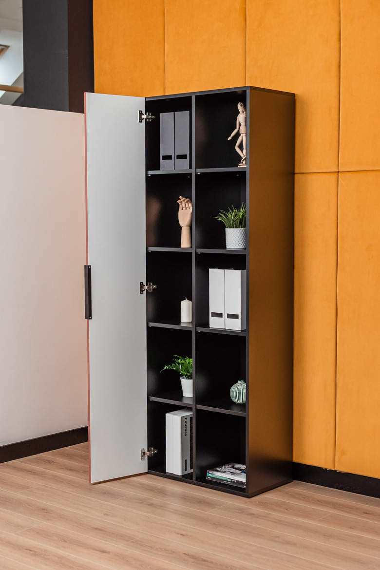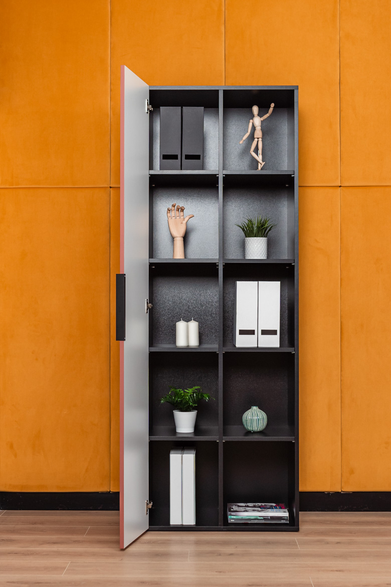 Regał sprawdzi się zarówno przy stanowisku pracy, jak i w przestrzeni wspólnej – tam, gdzie potrzebujesz dobrego stylu i praktycznego przechowywania w jednym.
