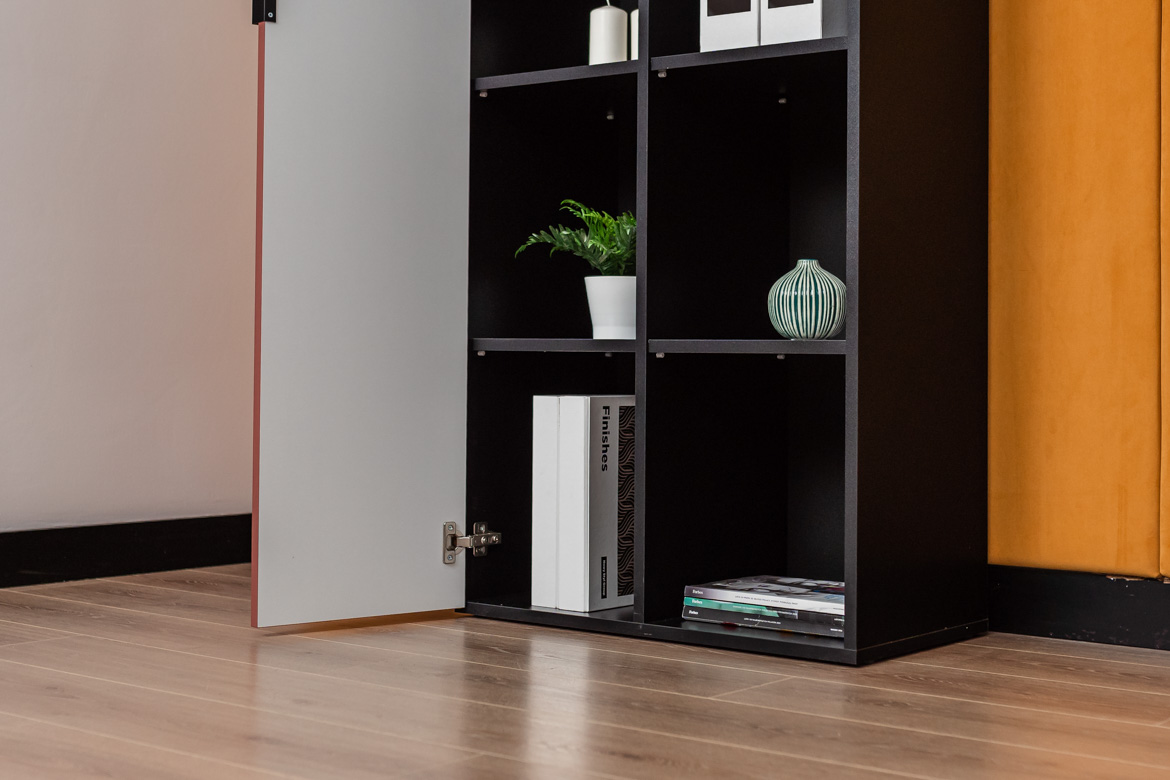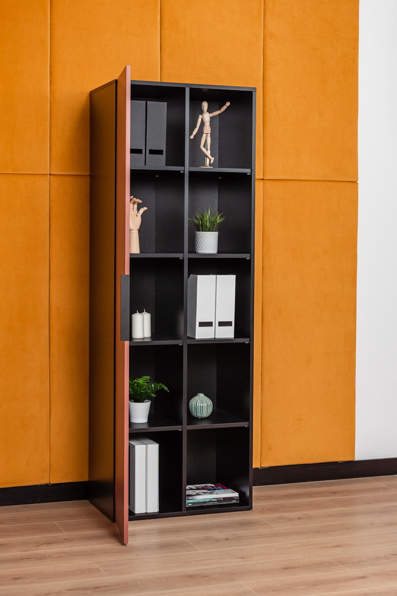 Co jeśli jeden mebel mógłby spełniać kilka funkcji jednocześnie – przechowywać to, co potrzebne, ukrywać to, co zbędne, i jednocześnie eksponować to, czym chcesz się otaczać? Ten elegancki regał właśnie tak działa – z jednej strony otwarte półki na książki, dokumenty lub dekoracje, z drugiej – zamknięta przestrzeń ukryta za frontem w odcieniu cegły.