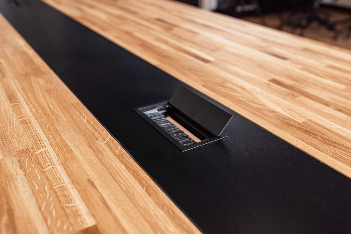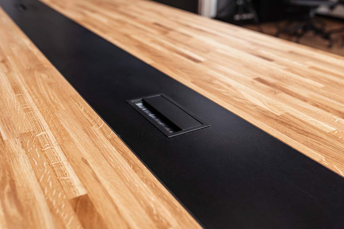 - blat wyposażony jest w dwa przepusty kablowe o wymiarach 160×80 mm (w cenie stołu). Wielkość oraz lokalizacja do ustalenia