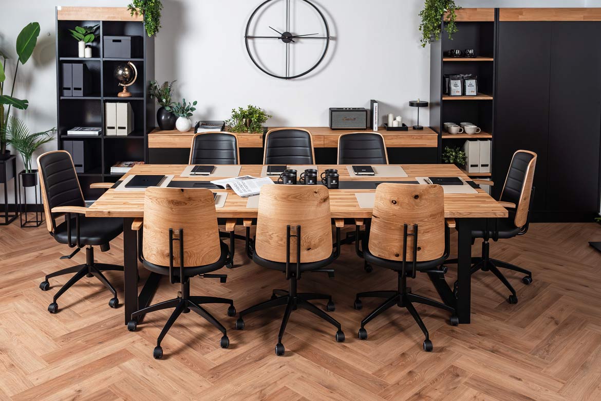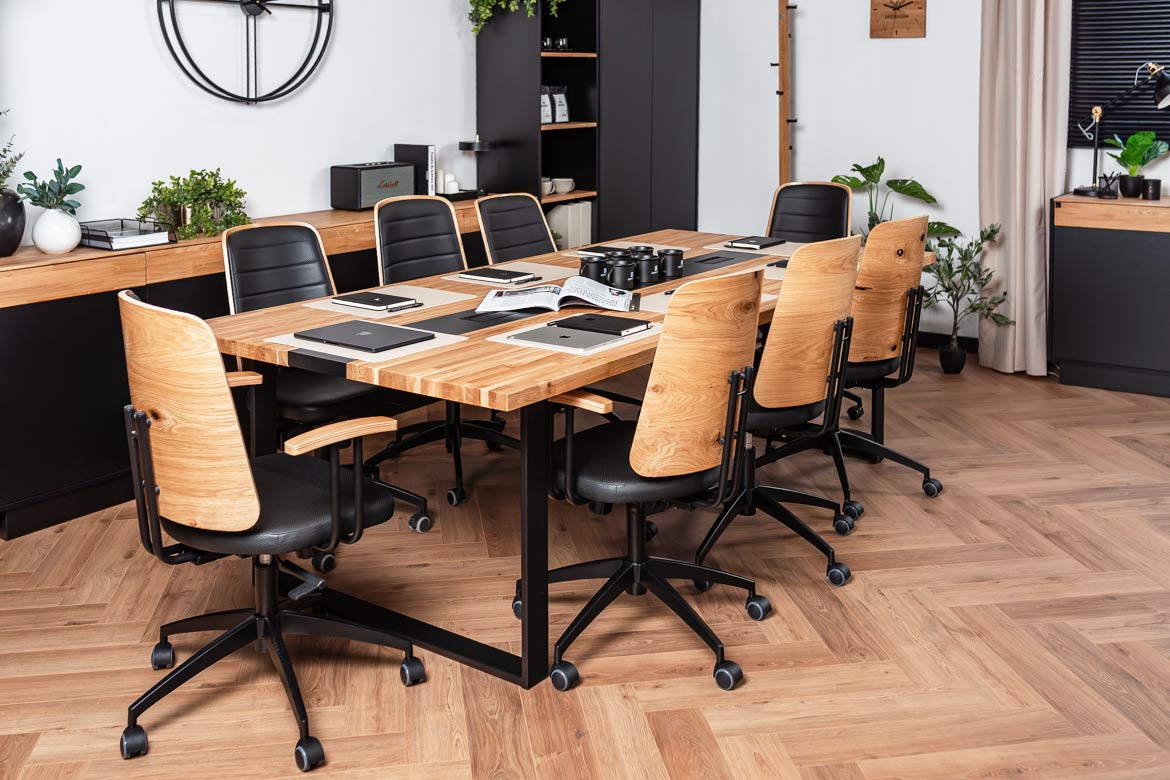 Stół konferencyjny o wymiarach 250×120 cm łączy nowoczesny design z funkcjonalnością, oferując wygodną i przestronną powierzchnię do pracy zespołowej lub organizacji spotkań. Solidny drewniany blat wyróżnia się trwałością oraz estetycznym wykończeniem, które podkreśla profesjonalny charakter wnętrza.