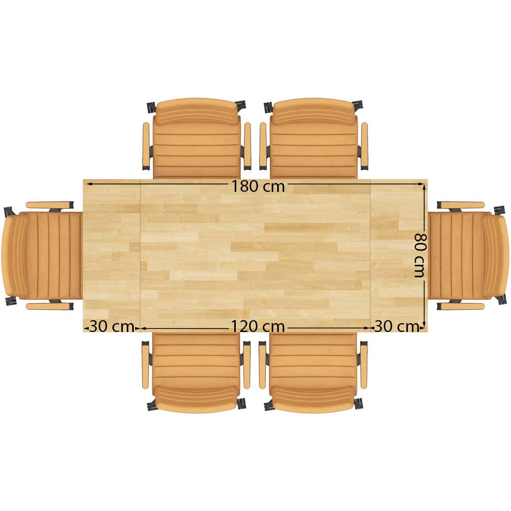 - stół z dostawkami: 120×80 cm + 2 razy 30×80 cm = 180×80 cm