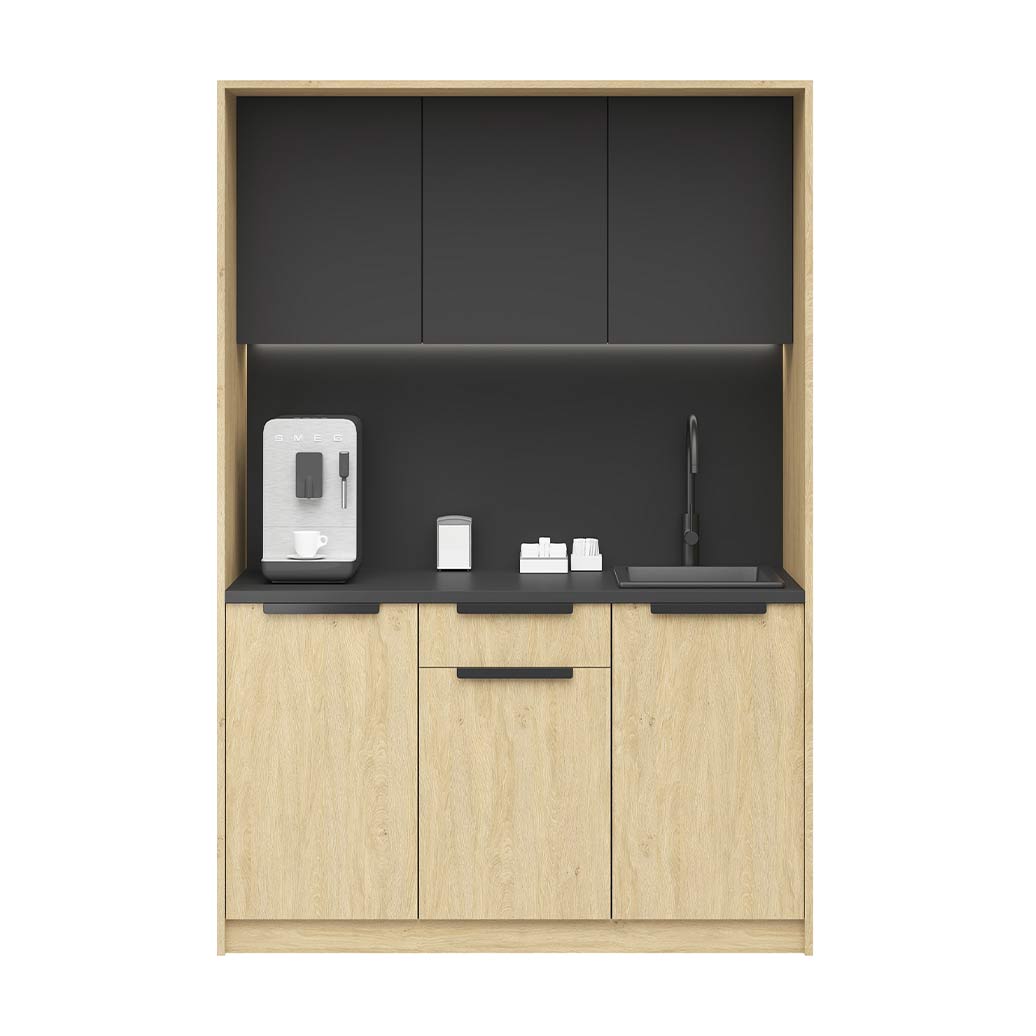 Aneks kuchenny Corporate to połączenie elegancji i praktyczności. Pojemne szafki pozwalają na wygodne przechowywanie naczyń i akcesoriów biurowych, a szeroki blat roboczy oraz zintegrowany zlew ułatwiają codzienne użytkowanie.
