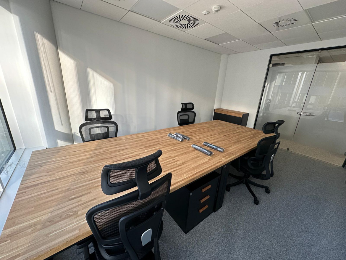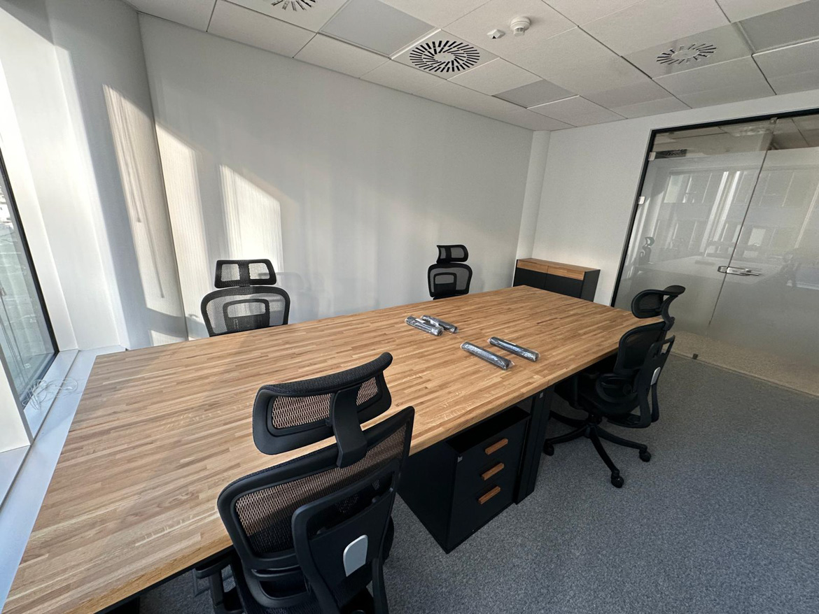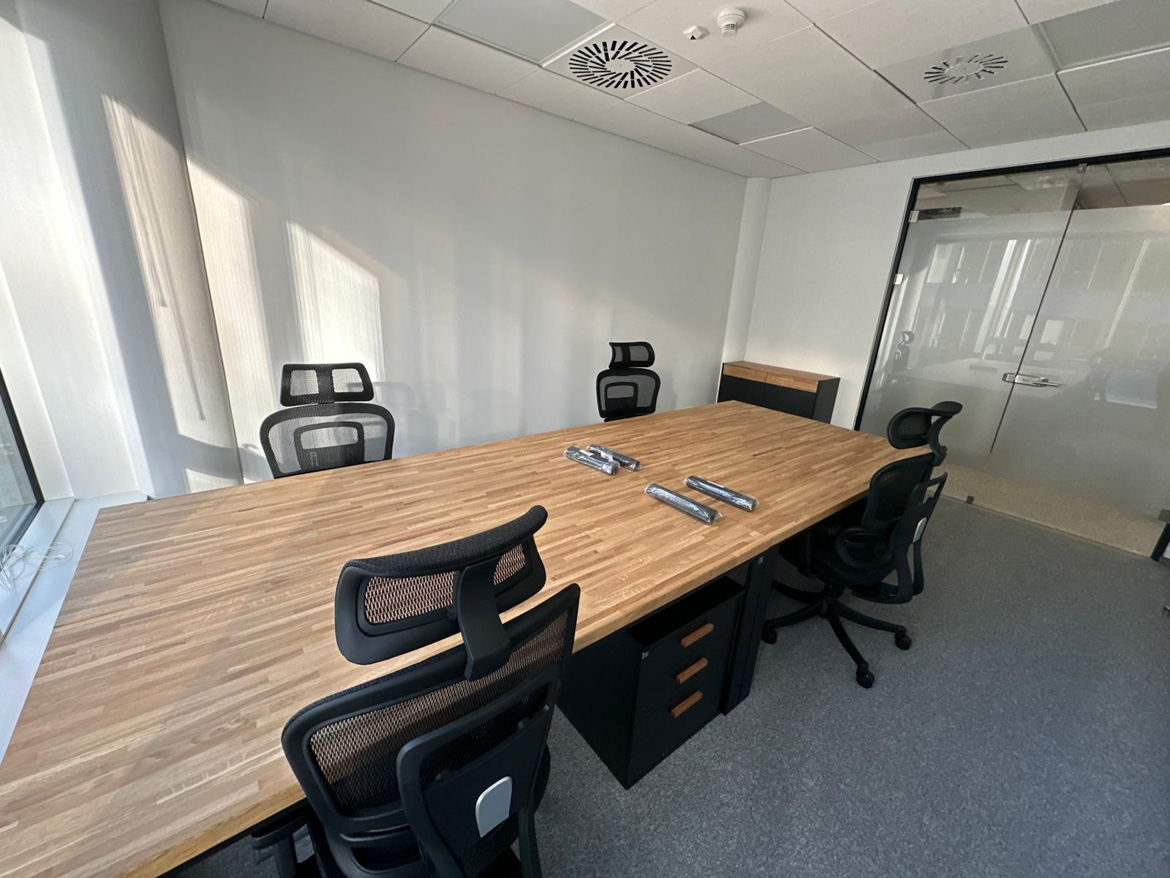 Powstało wygodne i dobrze zorganizowane stanowisko pracy dla zespołu. Duży wspólny blat sprzyja codziennej współpracy, a jednocześnie każdy ma swoją przestrzeń do pracy.