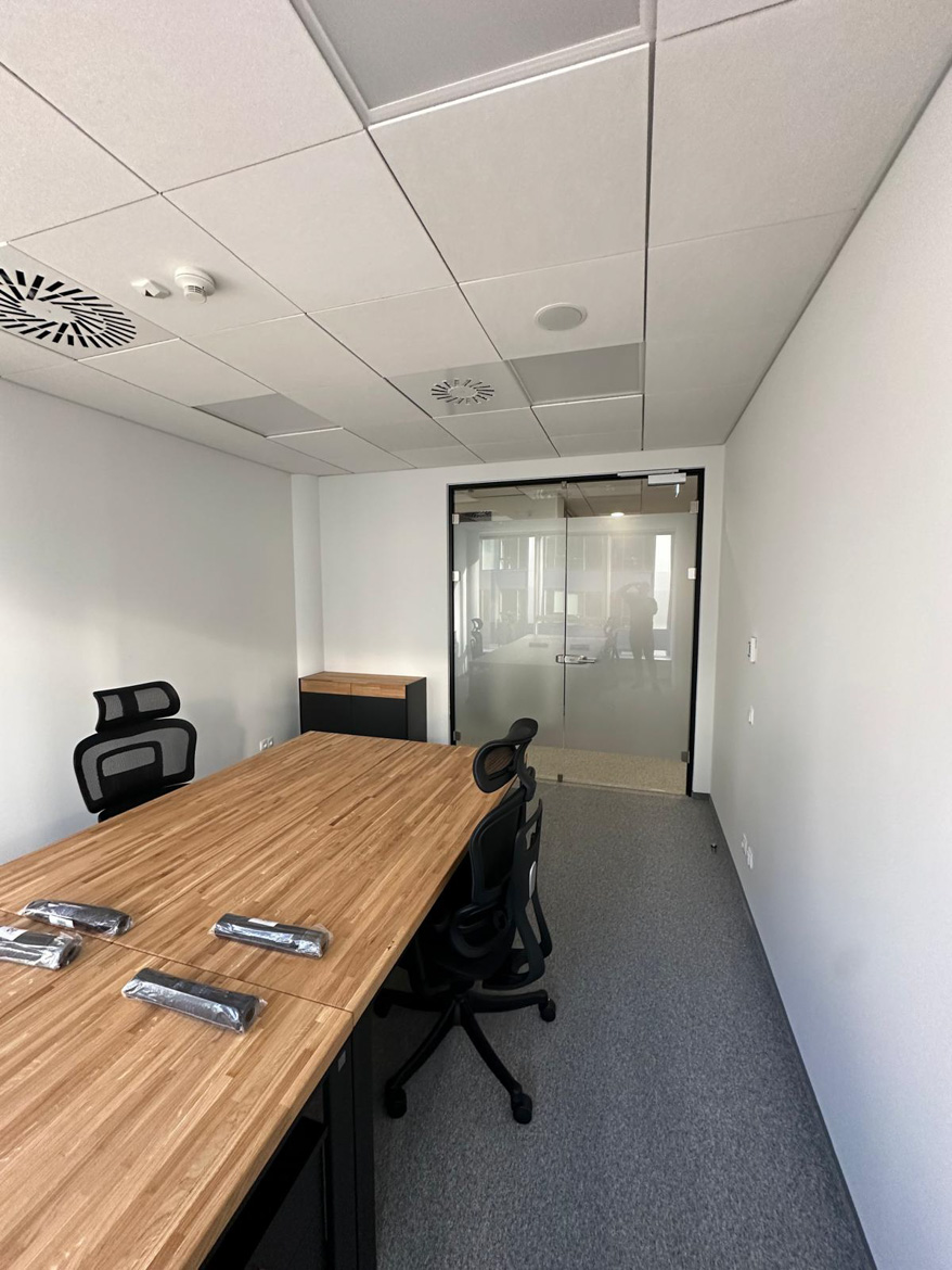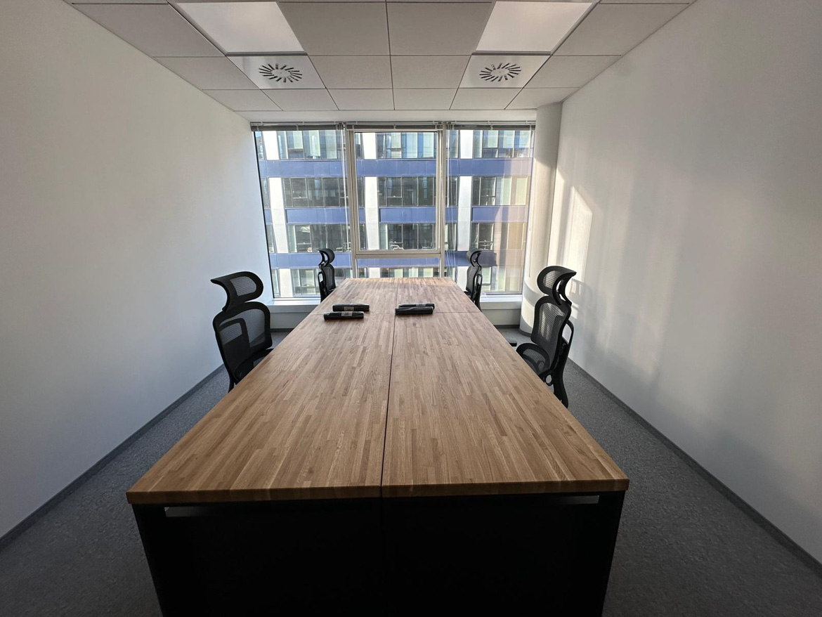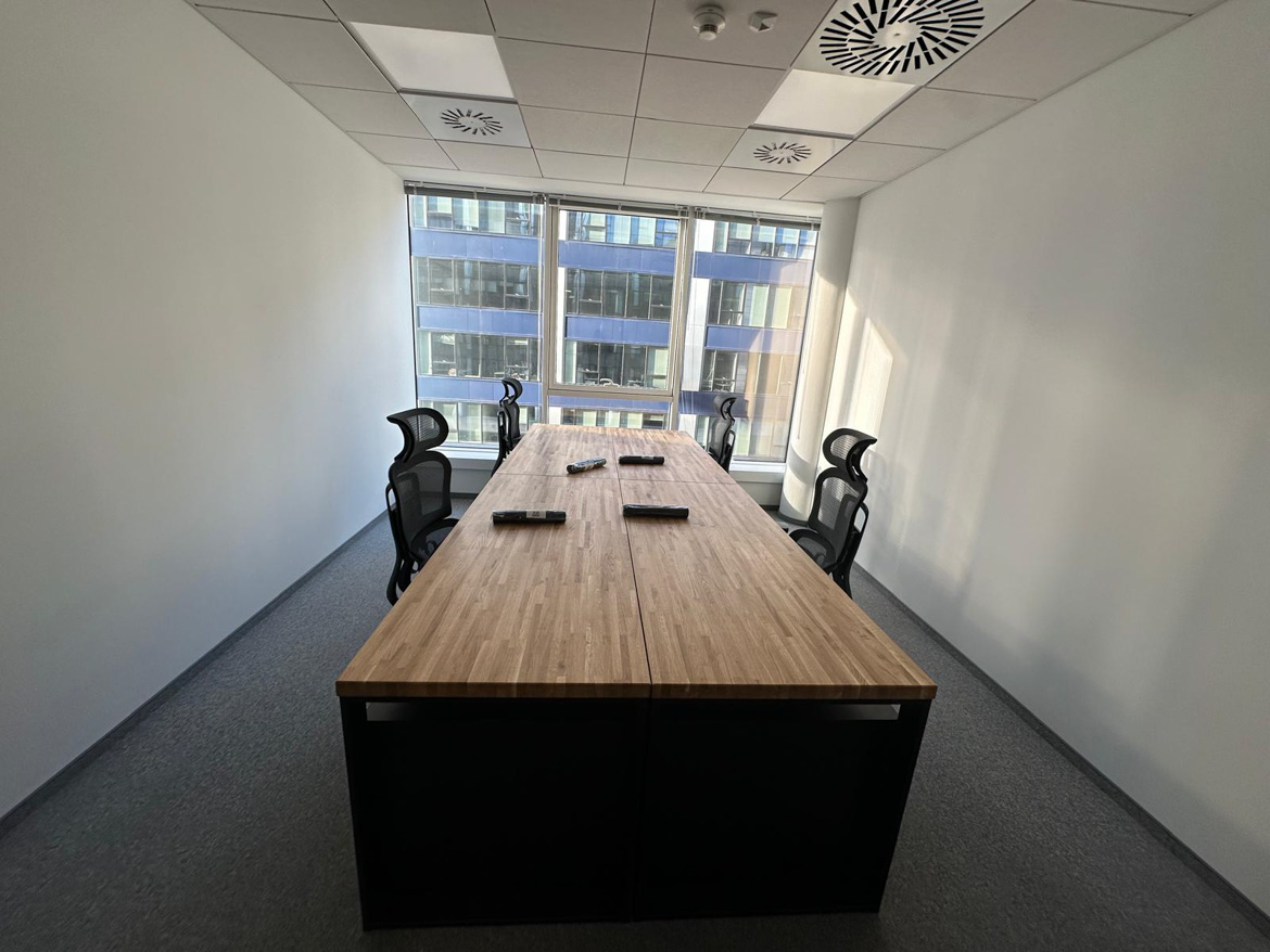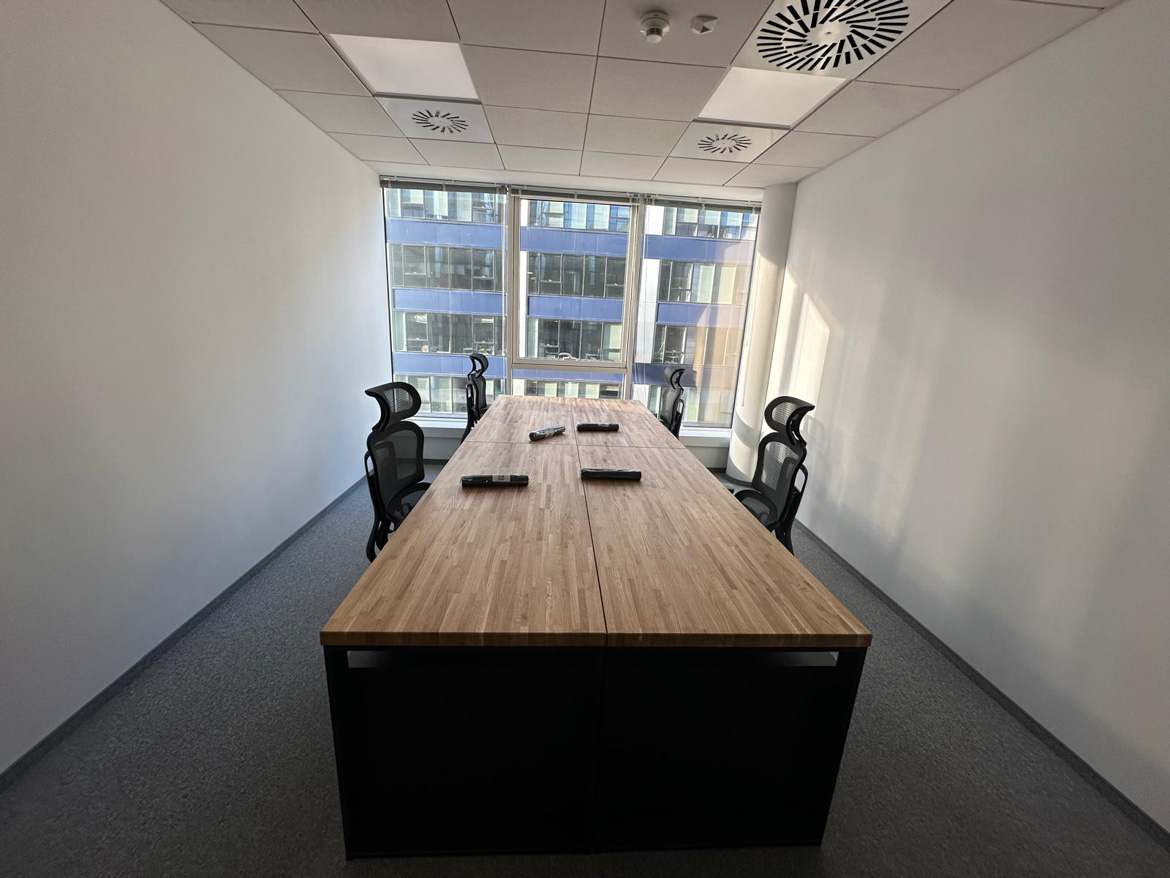 Powstało wygodne i dobrze zorganizowane stanowisko pracy dla zespołu. Duży wspólny blat sprzyja codziennej współpracy, a jednocześnie każdy ma swoją przestrzeń do pracy.