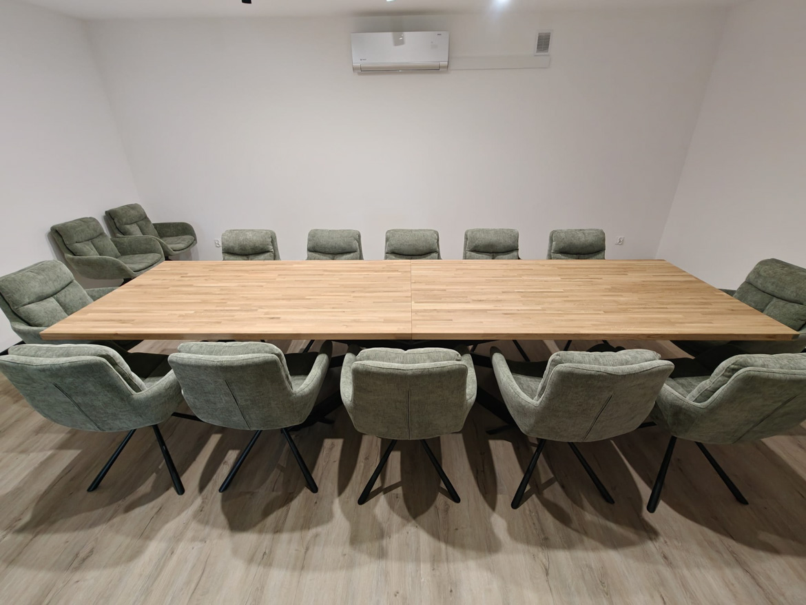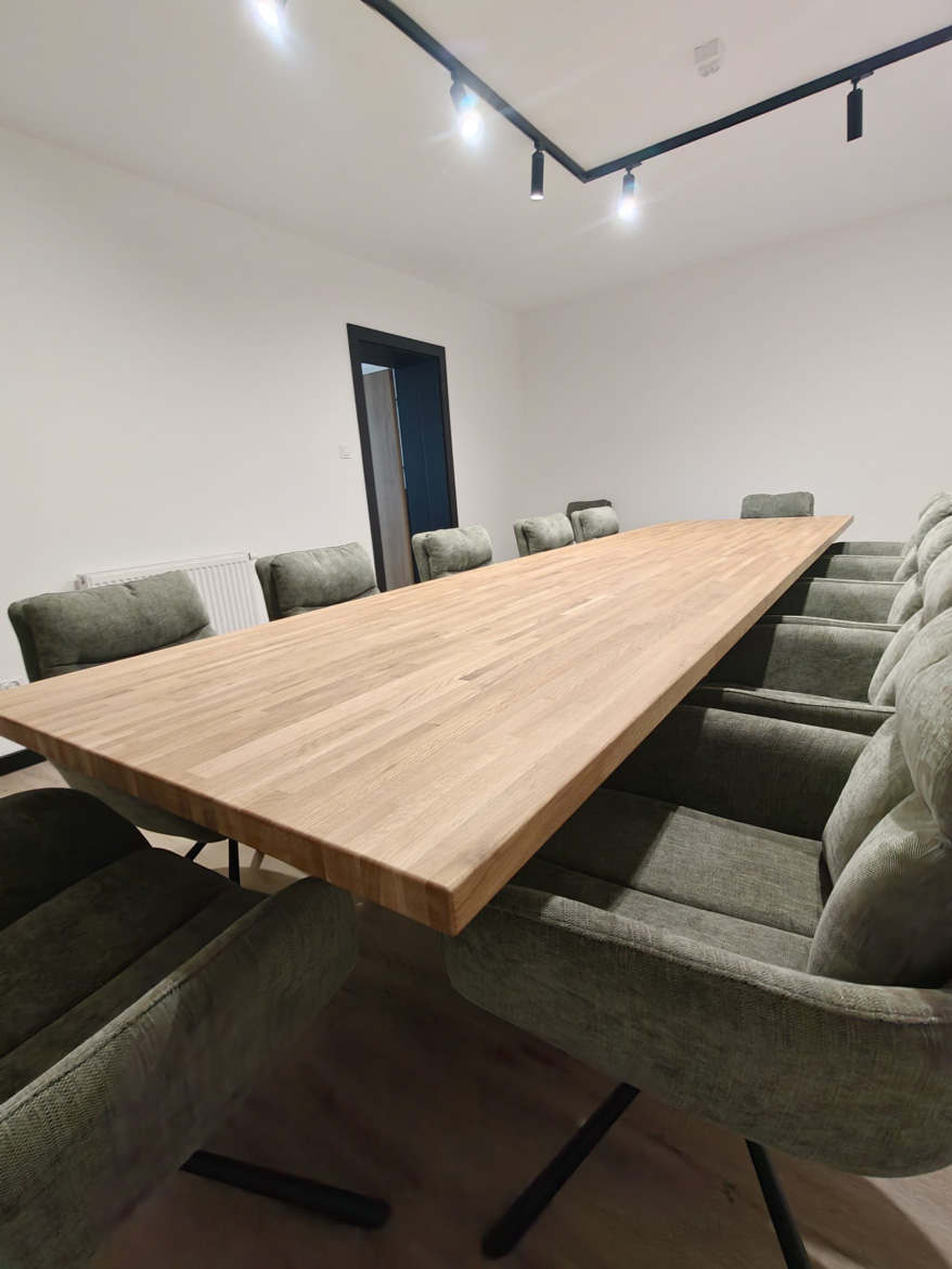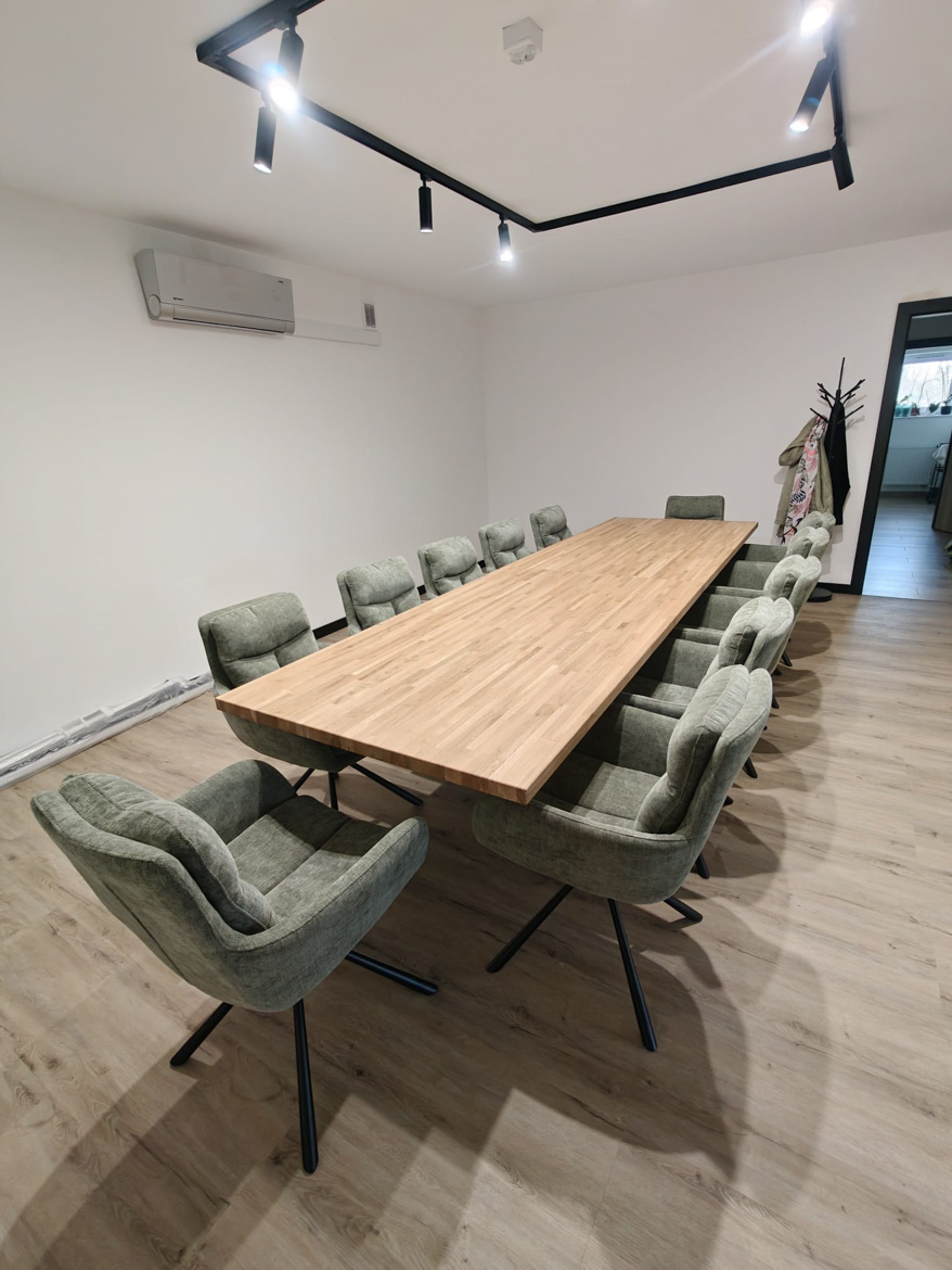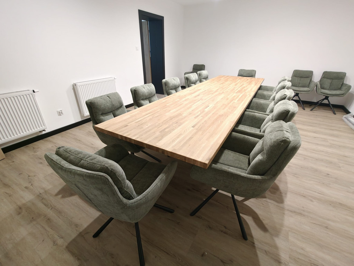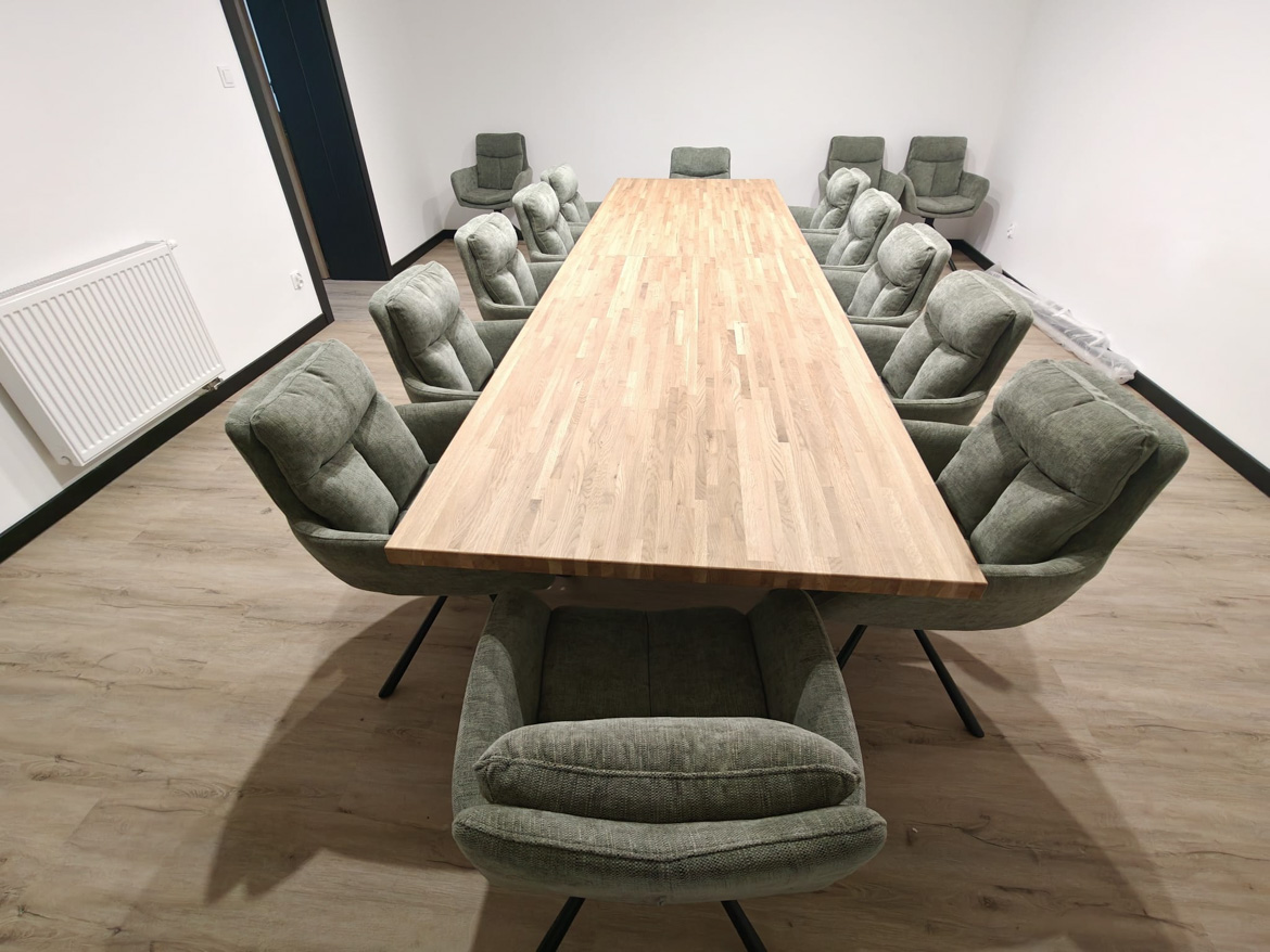Firmie zależało na dużym stole, który pomieści 12 osób i zapewni wygodę podczas spotkań oraz narad. Wykonaliśmy model typu pająk z charakterystycznymi metalowymi nogami, które nadają całości wyrazisty wygląd i przyciągają uwagę