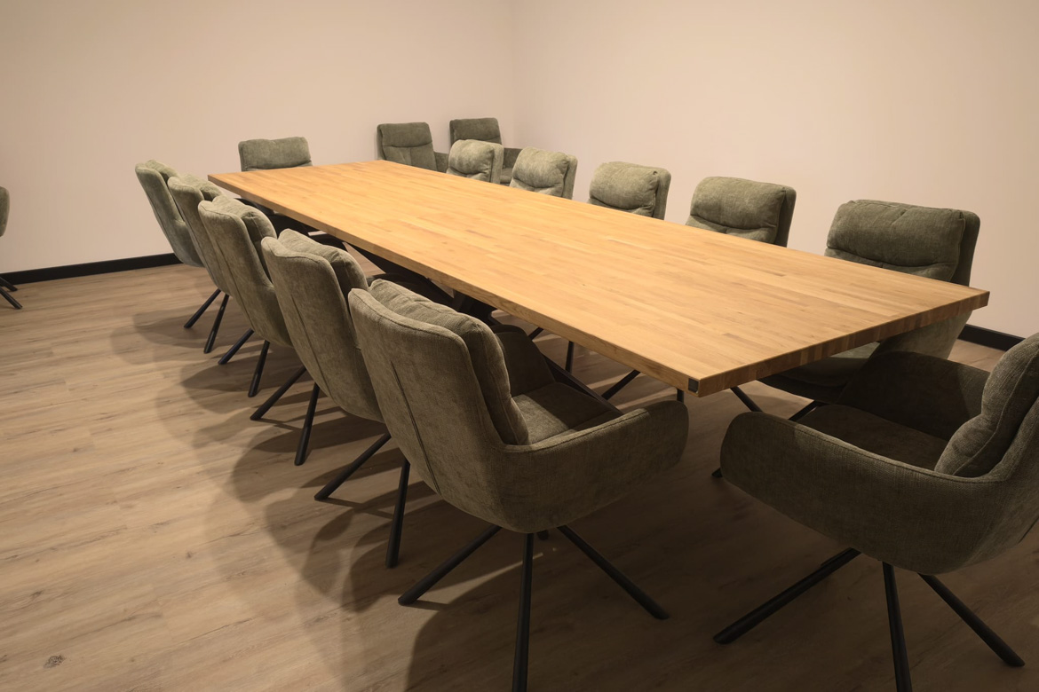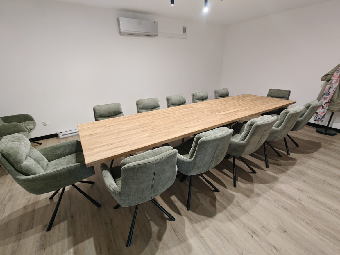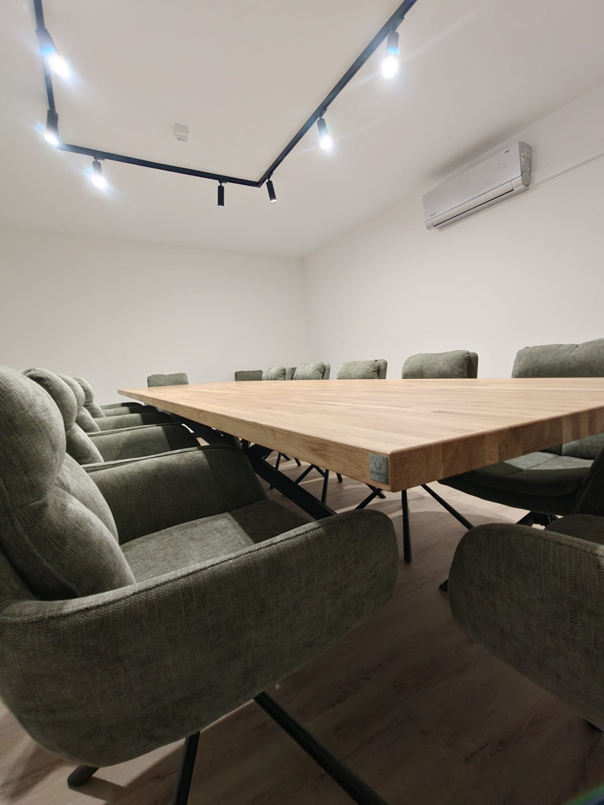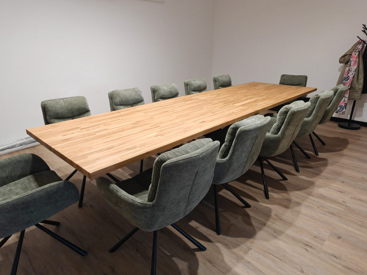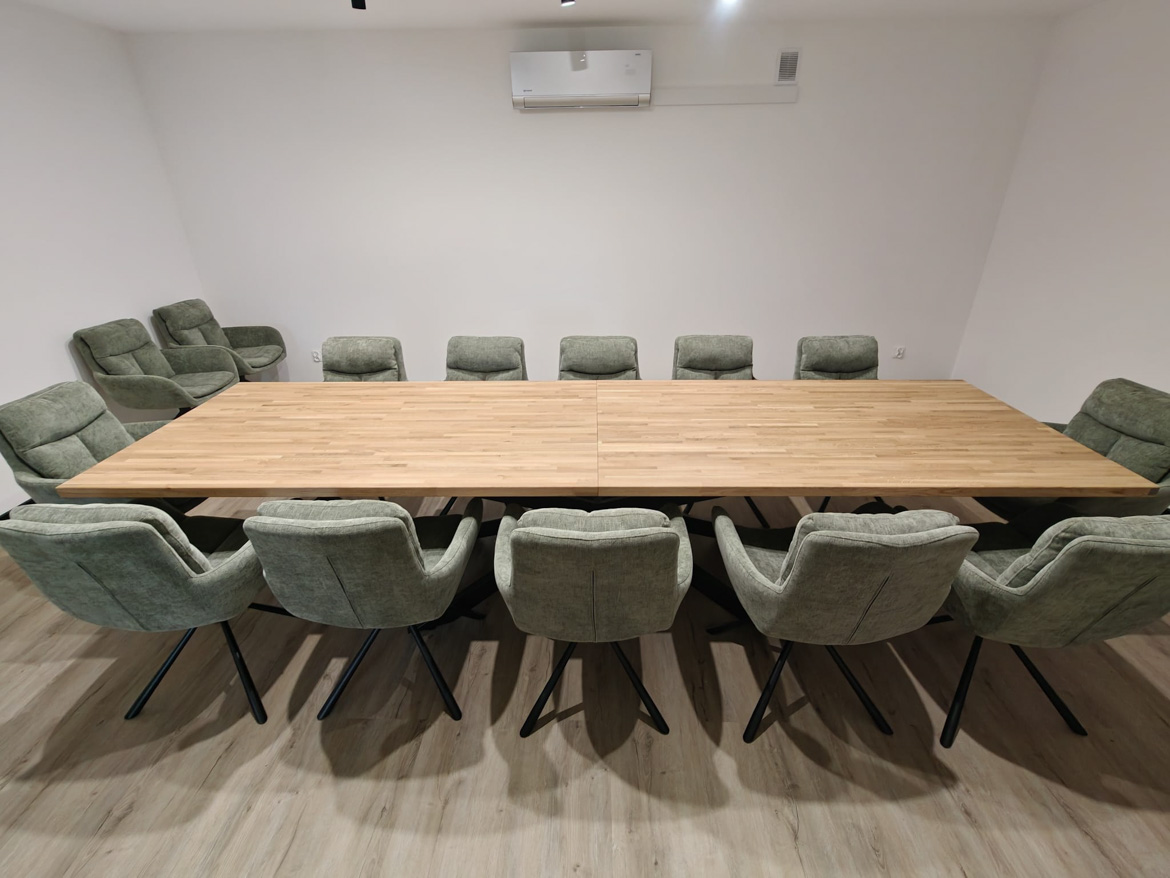 Firmie zależało na dużym stole, który pomieści 12 osób i zapewni wygodę podczas spotkań oraz narad. Wykonaliśmy model typu pająk z charakterystycznymi metalowymi nogami, które nadają całości wyrazisty wygląd i przyciągają uwagę